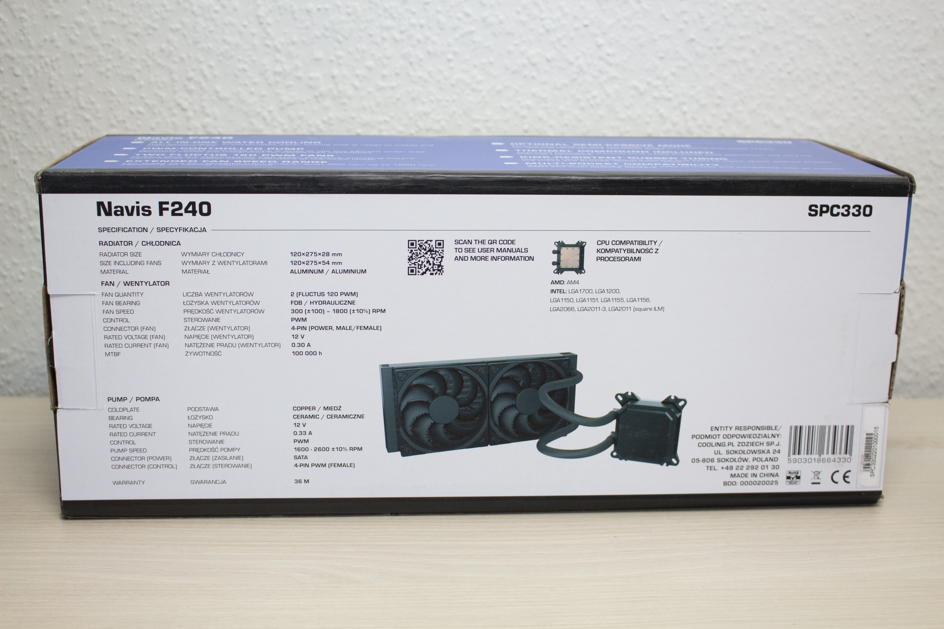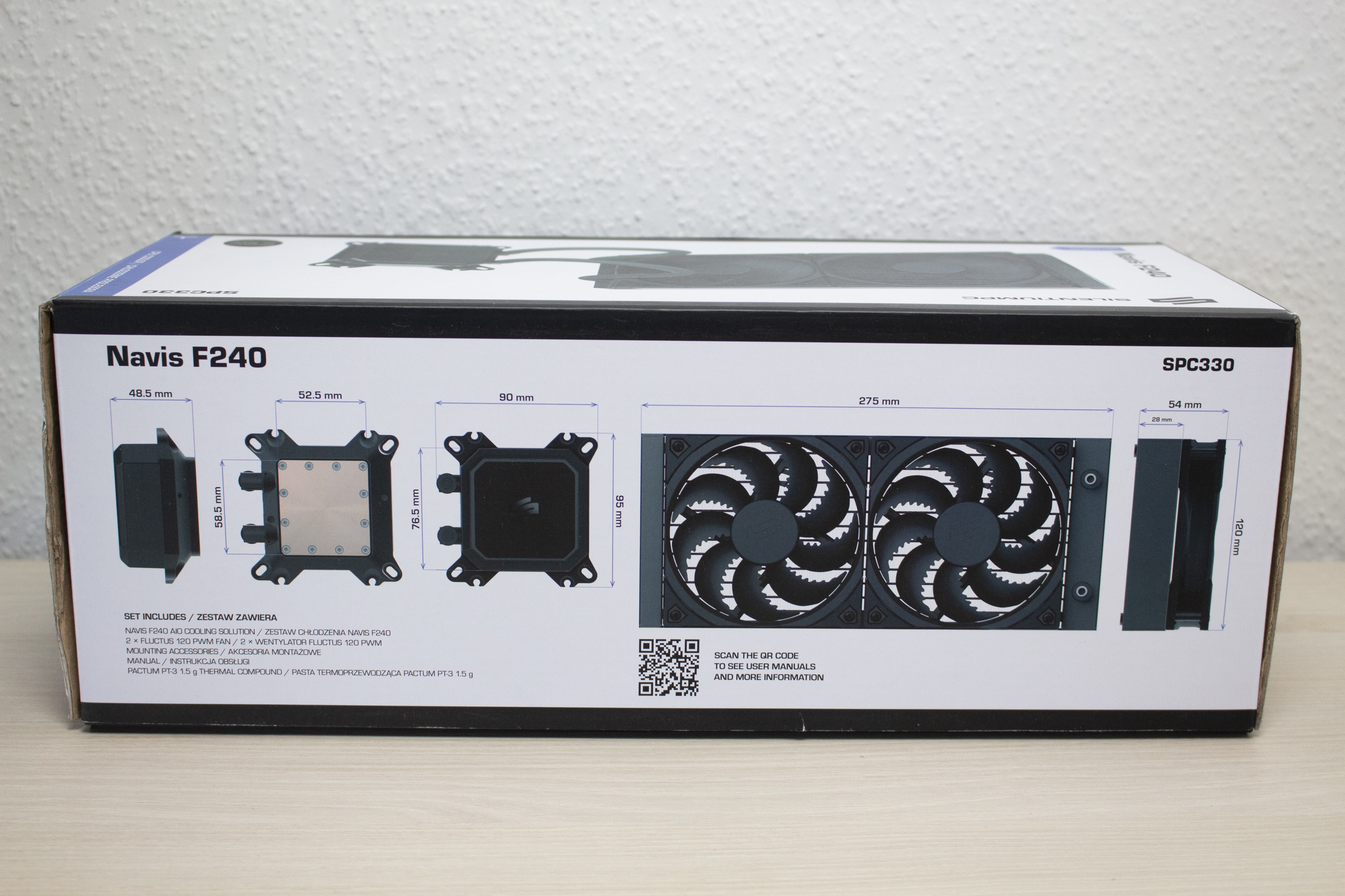 Die SilentiumPC Navis F240 kommt in einem großen Karton aus Pappe, der in den typischen Farben des Herstellers gestaltet wurde. So ist die Verpackung überwiegend weiß und mit leichten blauen und schwarzen Akzenten bedruckt. Neben einigen Produktbildern und einer Auflistung der Key-Features, enthält die Verpackung auch alle technischen Daten der AiO-Wasserkühlung. Alle Angaben sind nur in englischer Sprache verfasst.