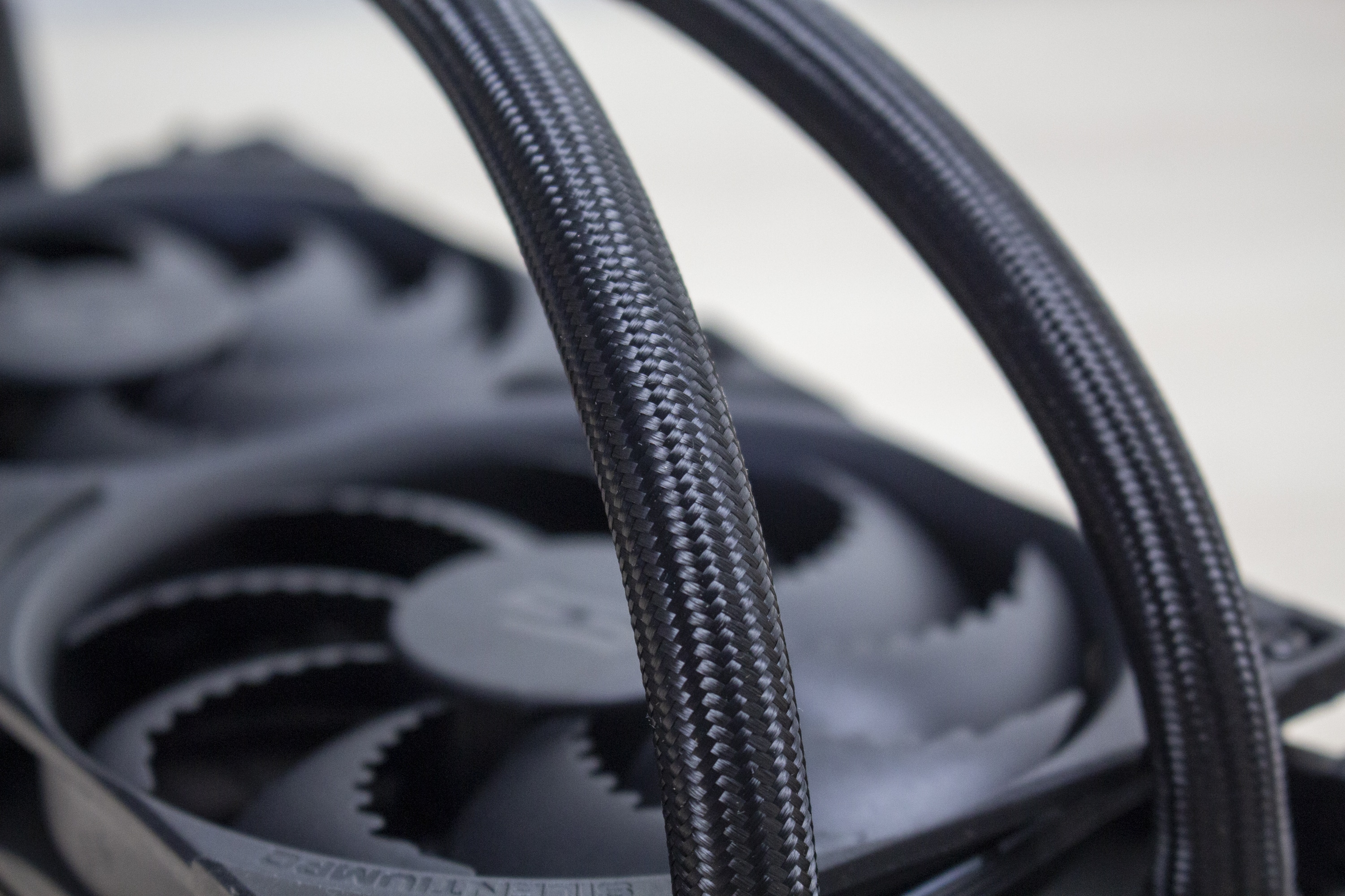 Die Wasserschläuche sind circa 360 Millimeter lang, von einem feinen schwarzen Sleeve umhüllt und enden am Pumpenblock an zwei beweglichen Gelenken. Durch deren Beweglichkeit können sowohl der Pumpenblock als auch der Radiator an verschiedenen Positionen im Gehäuse untergebracht werden. Im Vergleich zu anderen Lösungen ist die Beweglichkeit hier aber doch recht stark eingeschränkt. Die Verbindung zwischen Schlauch und Radiator bzw. Pumpe wird über einfache Schrumpfschläuche bzw. Drahtspulen gesichert.