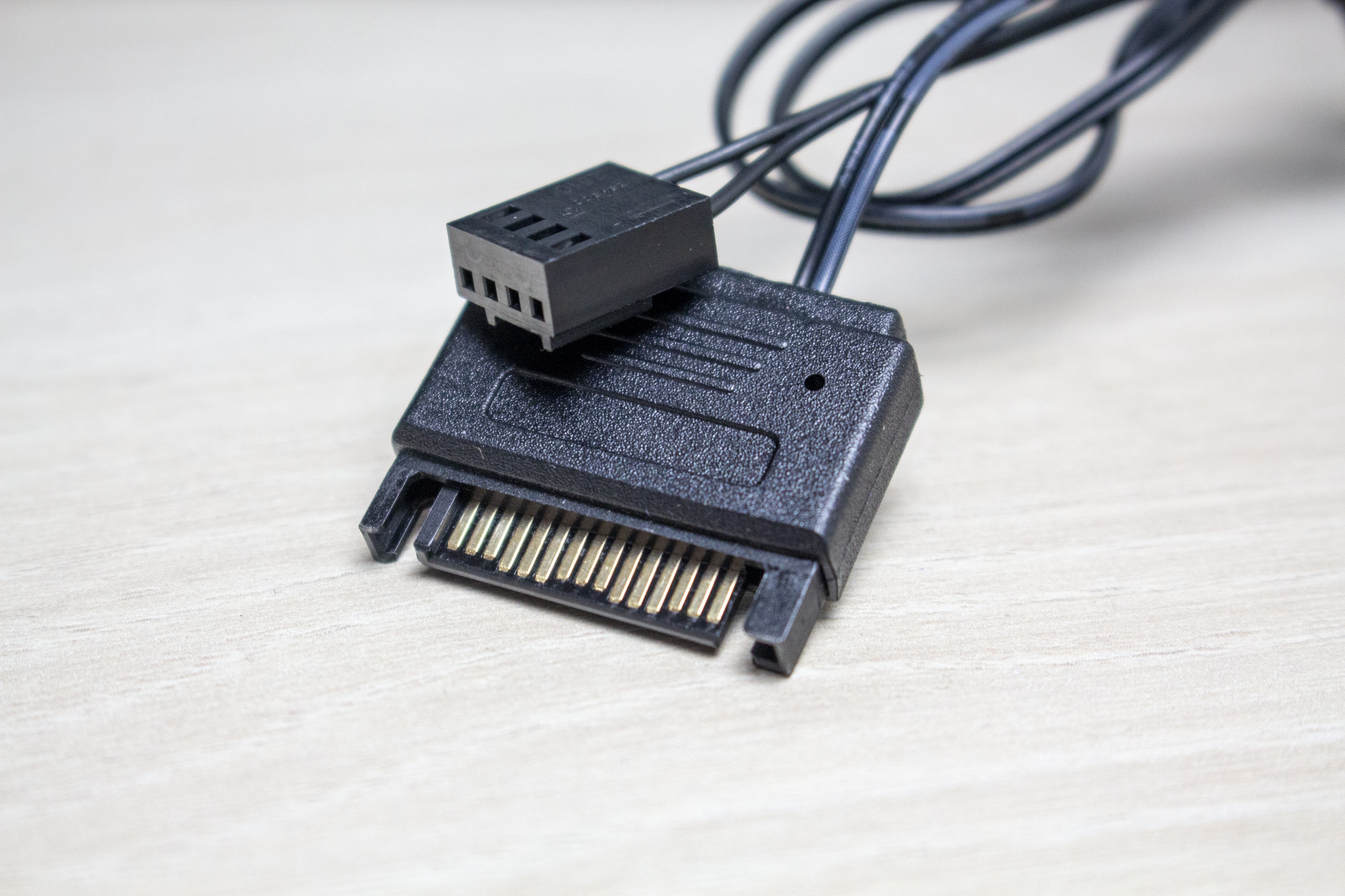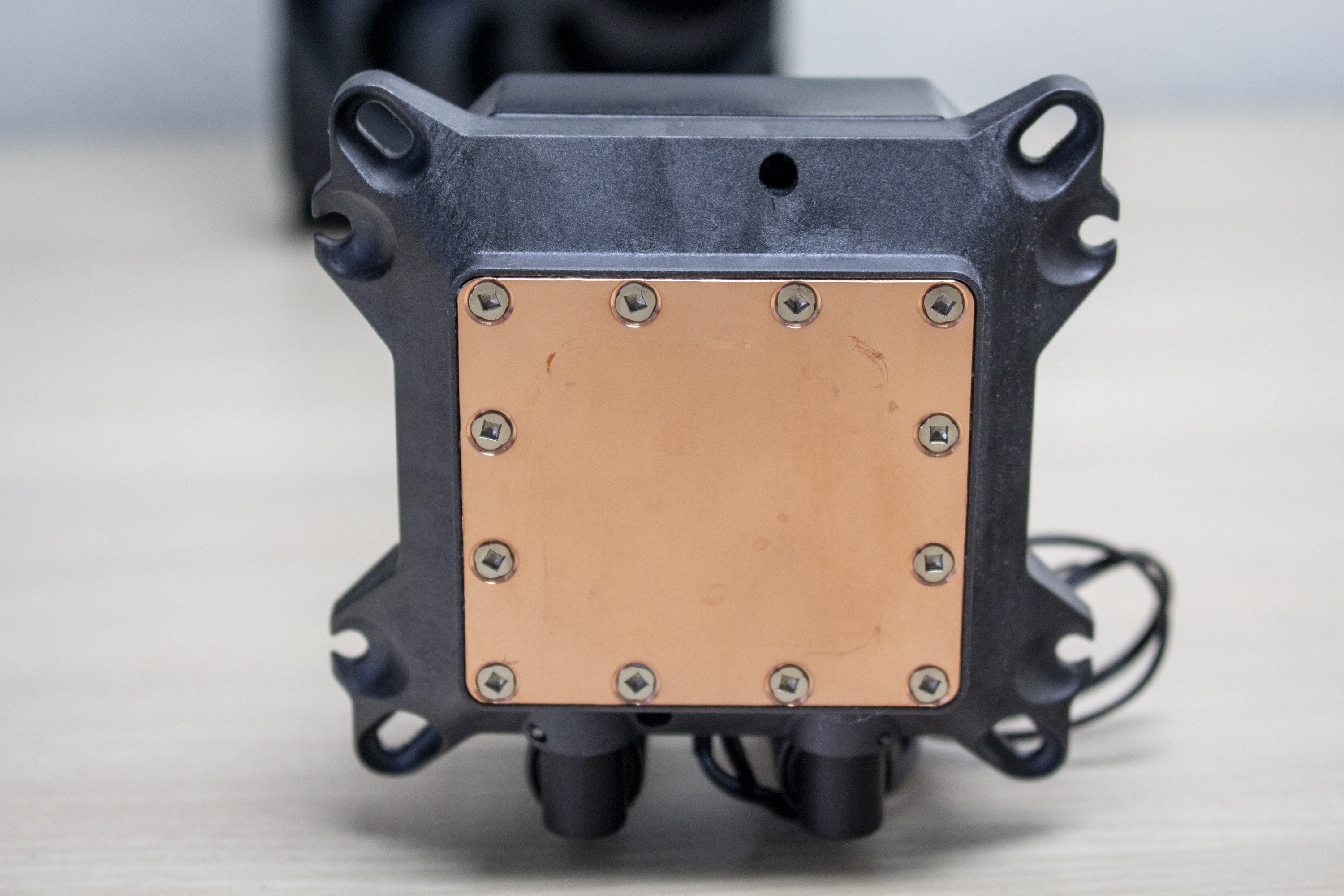 Der Pumpenblock selbst ist von einem schwarzen Kunststoff umhüllt und ebenfalls schlicht gestaltet. Lediglich das Herstellerlogo ist auf der Oberseite aufgedruckt. Zudem besteht der Pumpendeckel aus gebürstetem Aluminium und die generelle Optik aufzuwerten. Die im Block eingebaute Pumpe mit Keramik-Lager dreht mit maximal 2600 Umdrehungen pro Minute, wird über einen SATA-Stecker mit Strom versorgt und per 4-Pin-PWM-Stecker mit dem Mainboard verbunden. Die Übertragung der Wärme vom Heatspreader der CPU an den Pumpenblock erfolgt über eine große Kupferplatte.