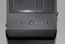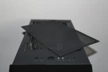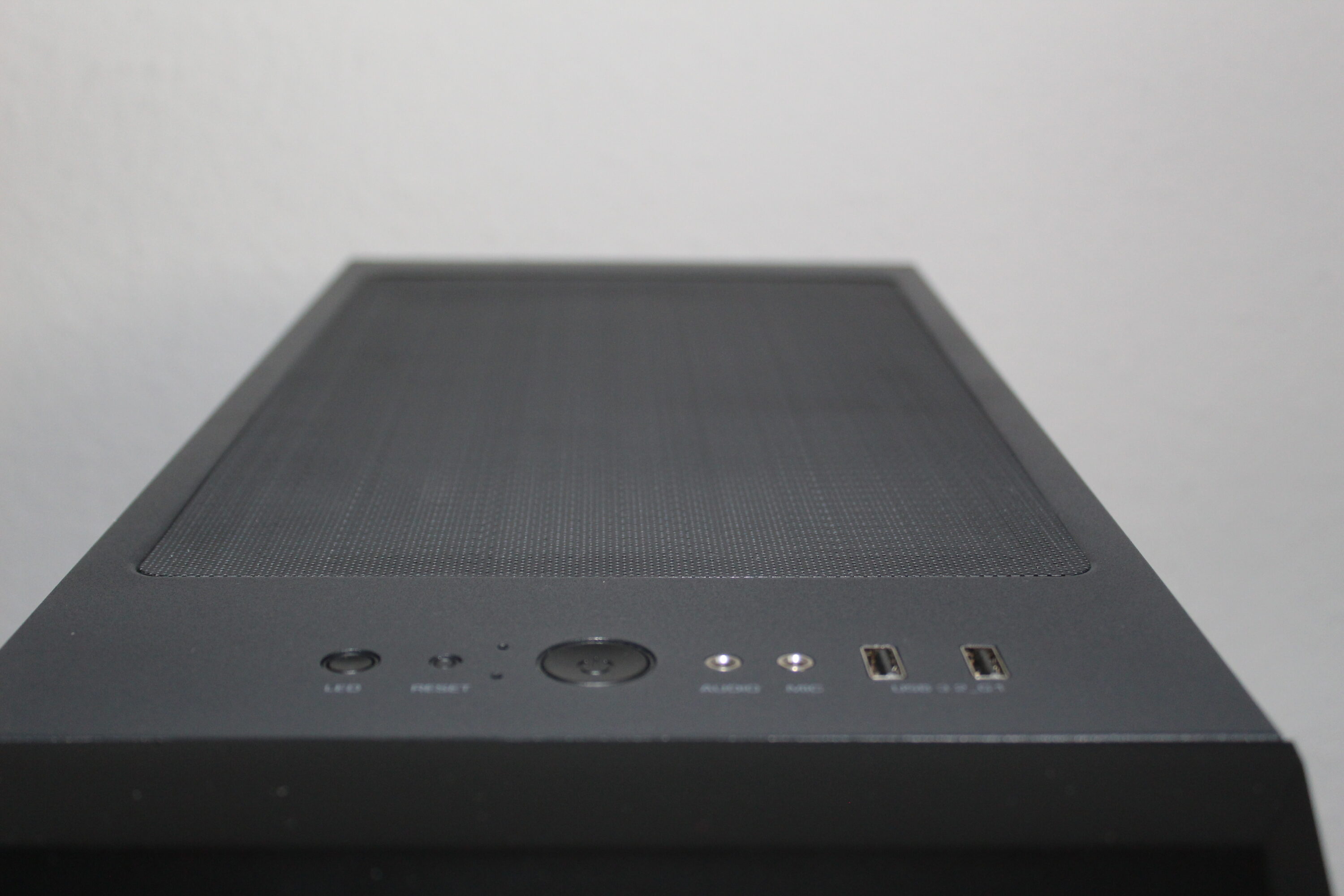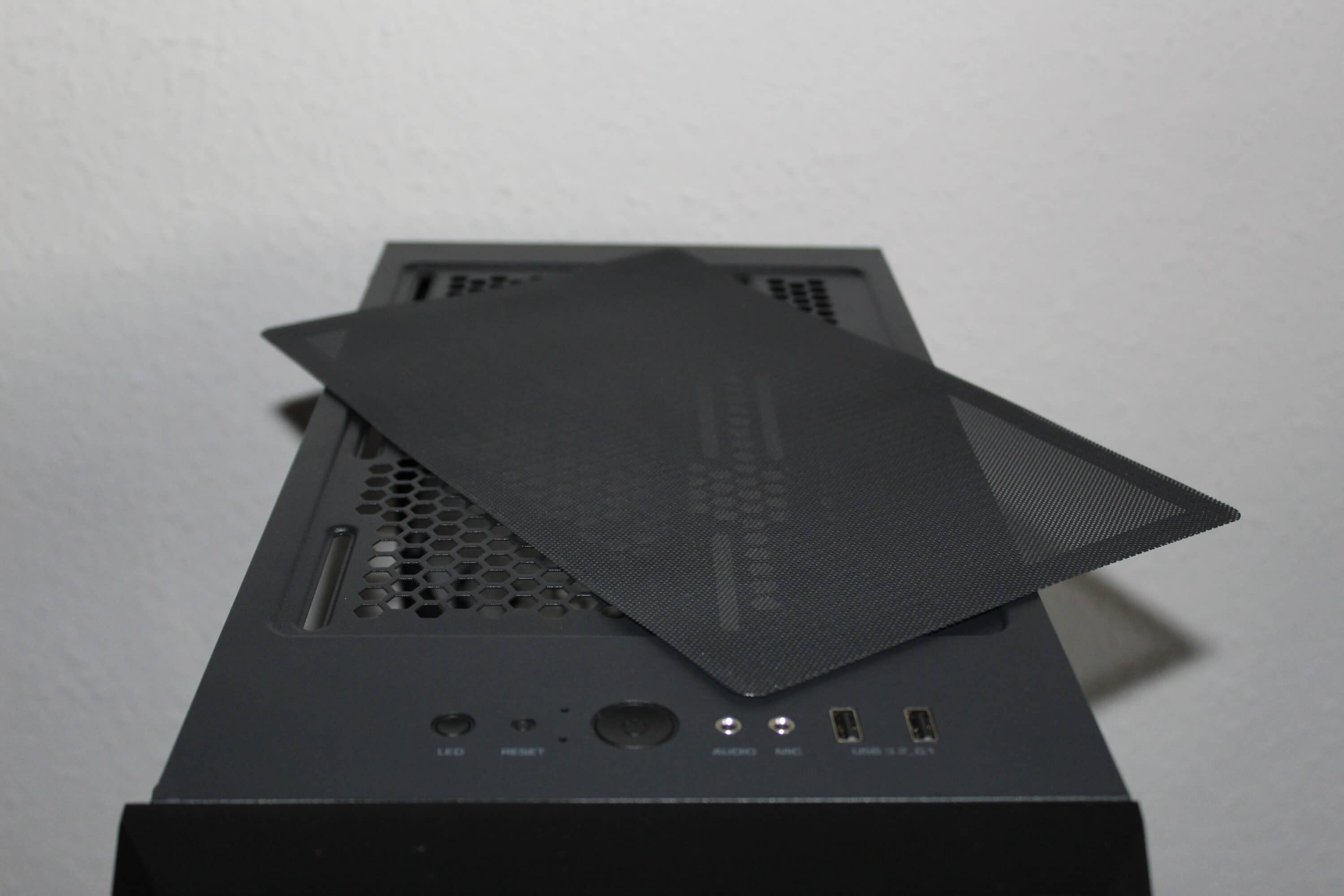 Als nächstes fällt der Blick auf das Front-IO. Mit zwei mal USB, Kopfhörer- und Mikrofonanschluss, Power-, Reset- und RGB-Knopf fehlt dieses relativ knapp aus. Im Geist der aktuellen Zeit würden wir uns noch USB Typ-C wünschen, dies ist jedoch verschmerzbar. Außerdem befindet sich im oberen Bereich ein großer Ventilationsbereich – bei Bedarf kann man weitere Lüfter nachrüsten und erhält so einen noch besseren Airflow. Um das Gehäuse vor Staub zu schützen, ist hier ein magnetischer Staubfilter montiert.