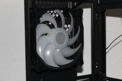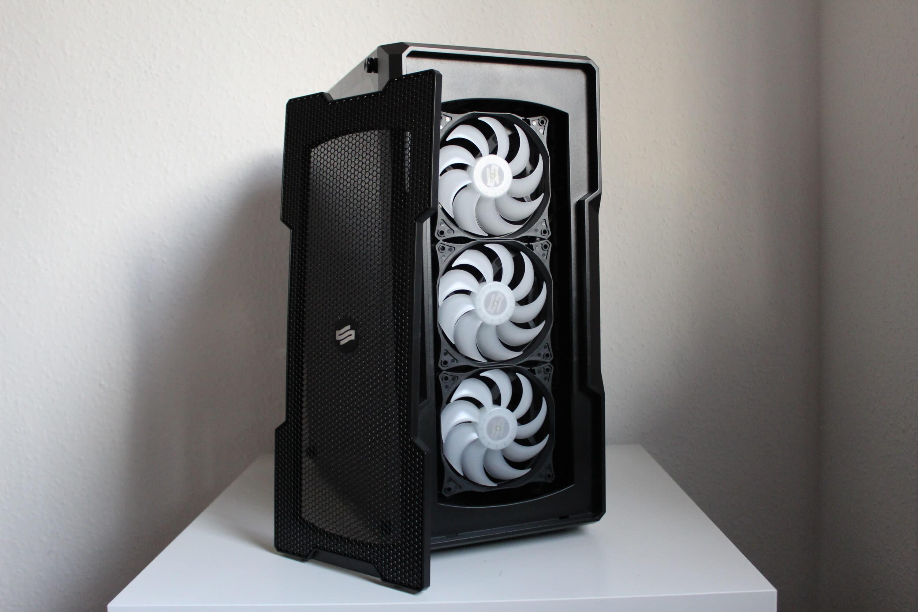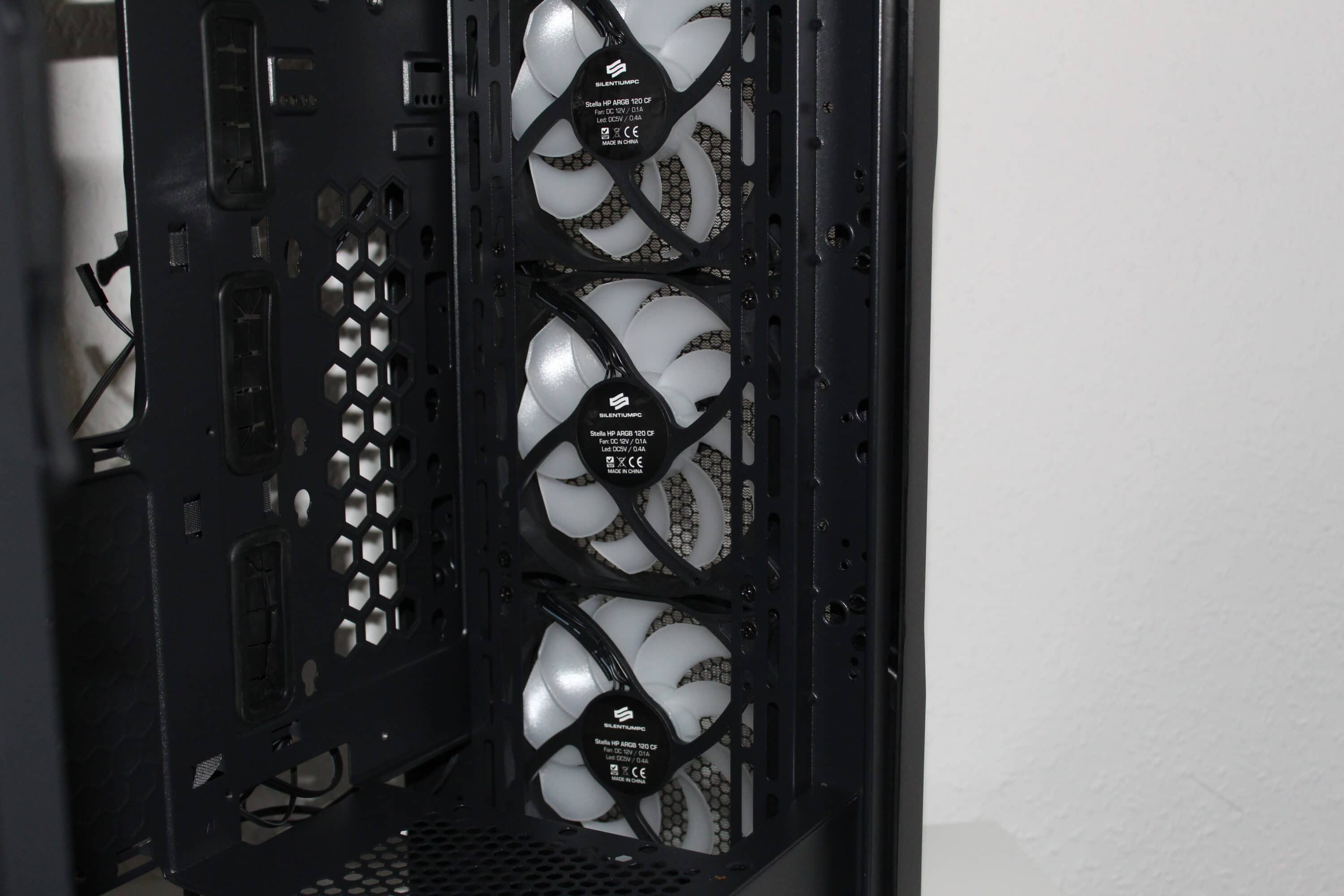 Außerdem auffällig ist das SilentiumPC-Logo, welches mittig in das Mesh eingelassen ist. Hinter dem Mesh sind drei 120-mm-RGB-Lüfter vorinstalliert, welche durch das Mesh schimmern und gut sichtbar sind – im Gegensatz z. B. zu der Fractal Design Meshify-Serie. Dort ist das Mesh deutlich blickdichter.