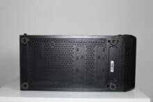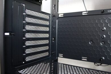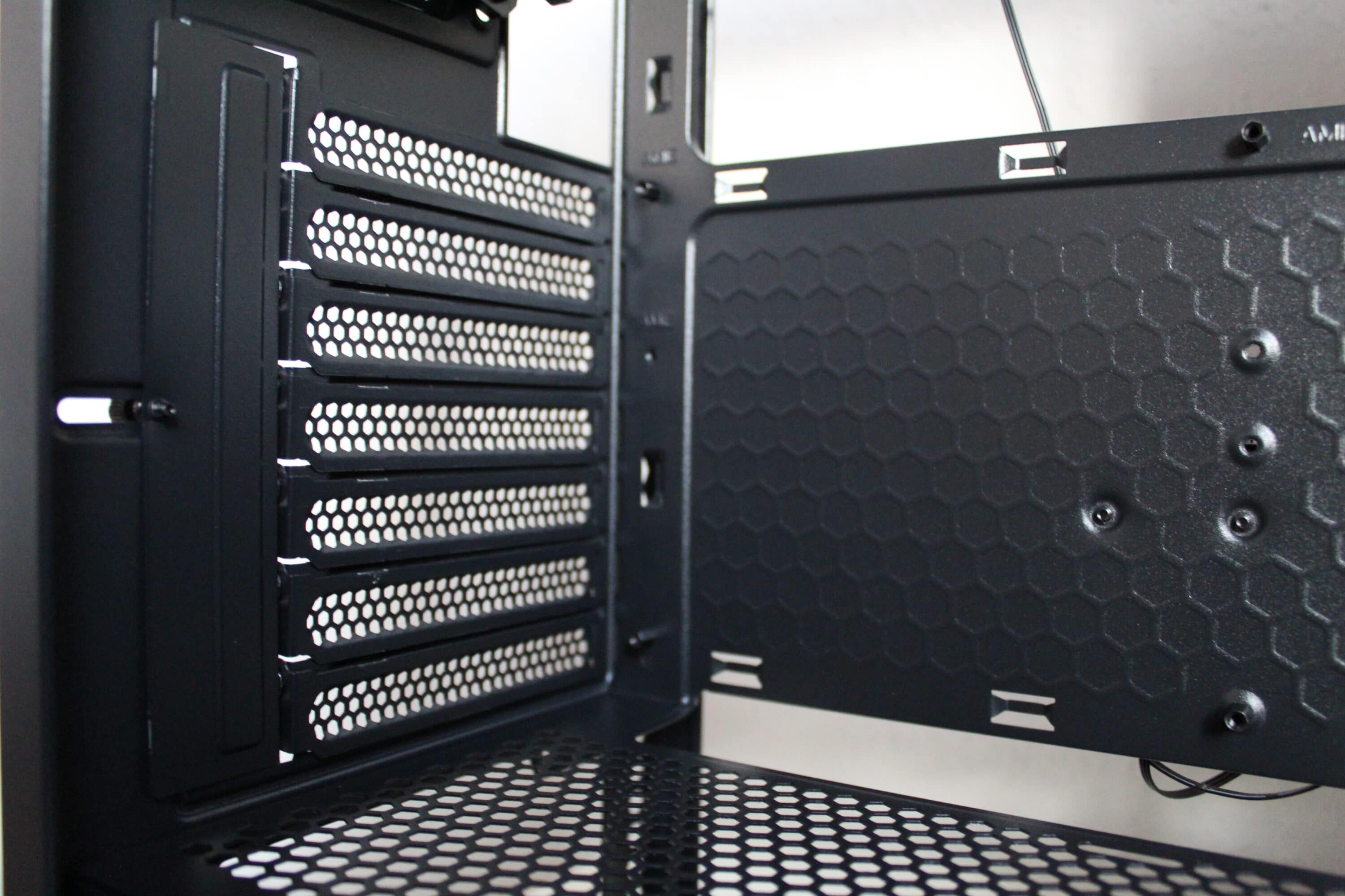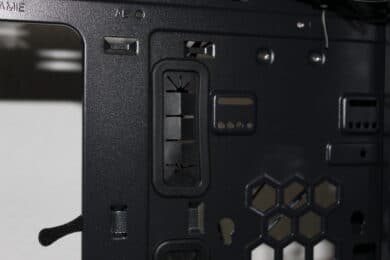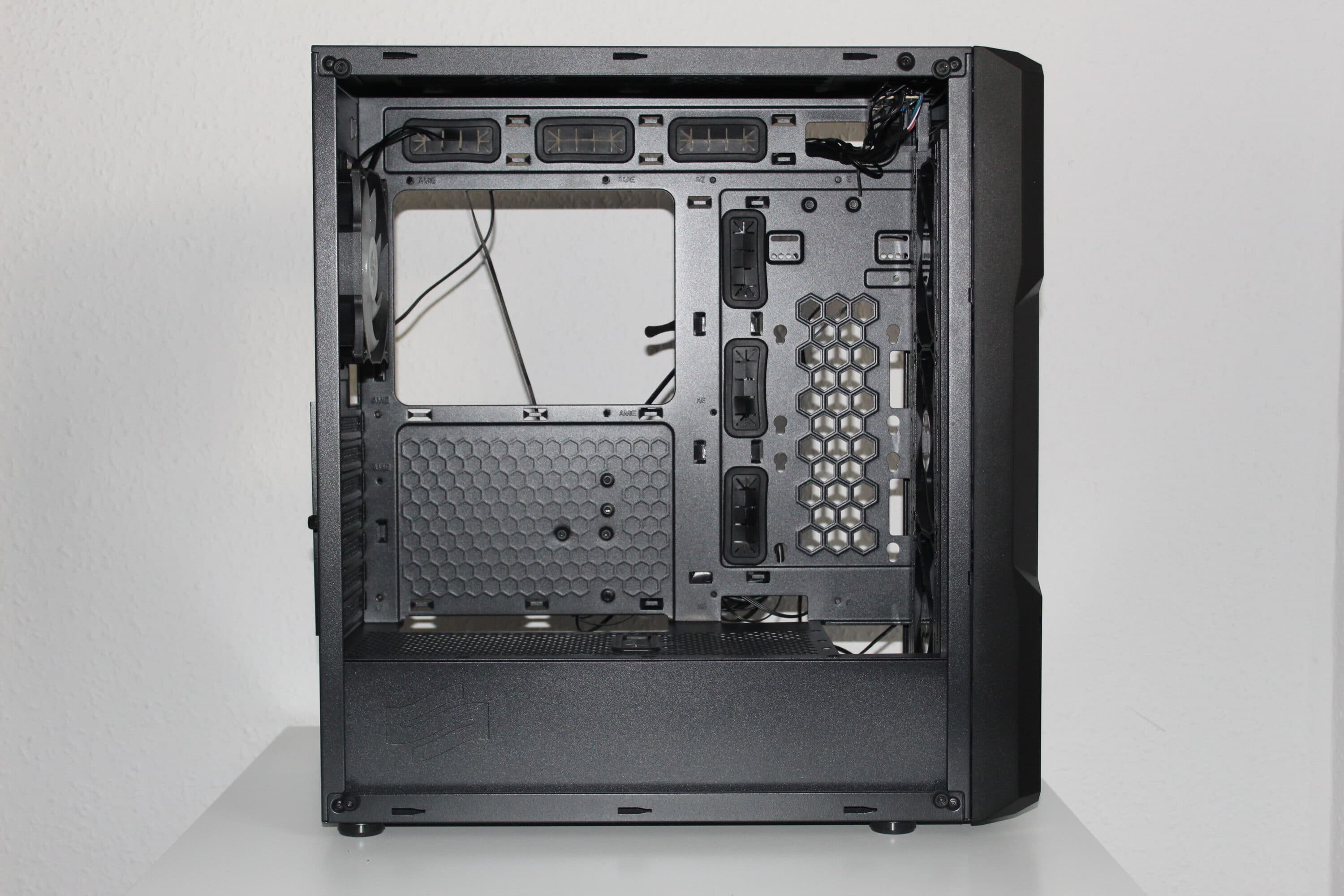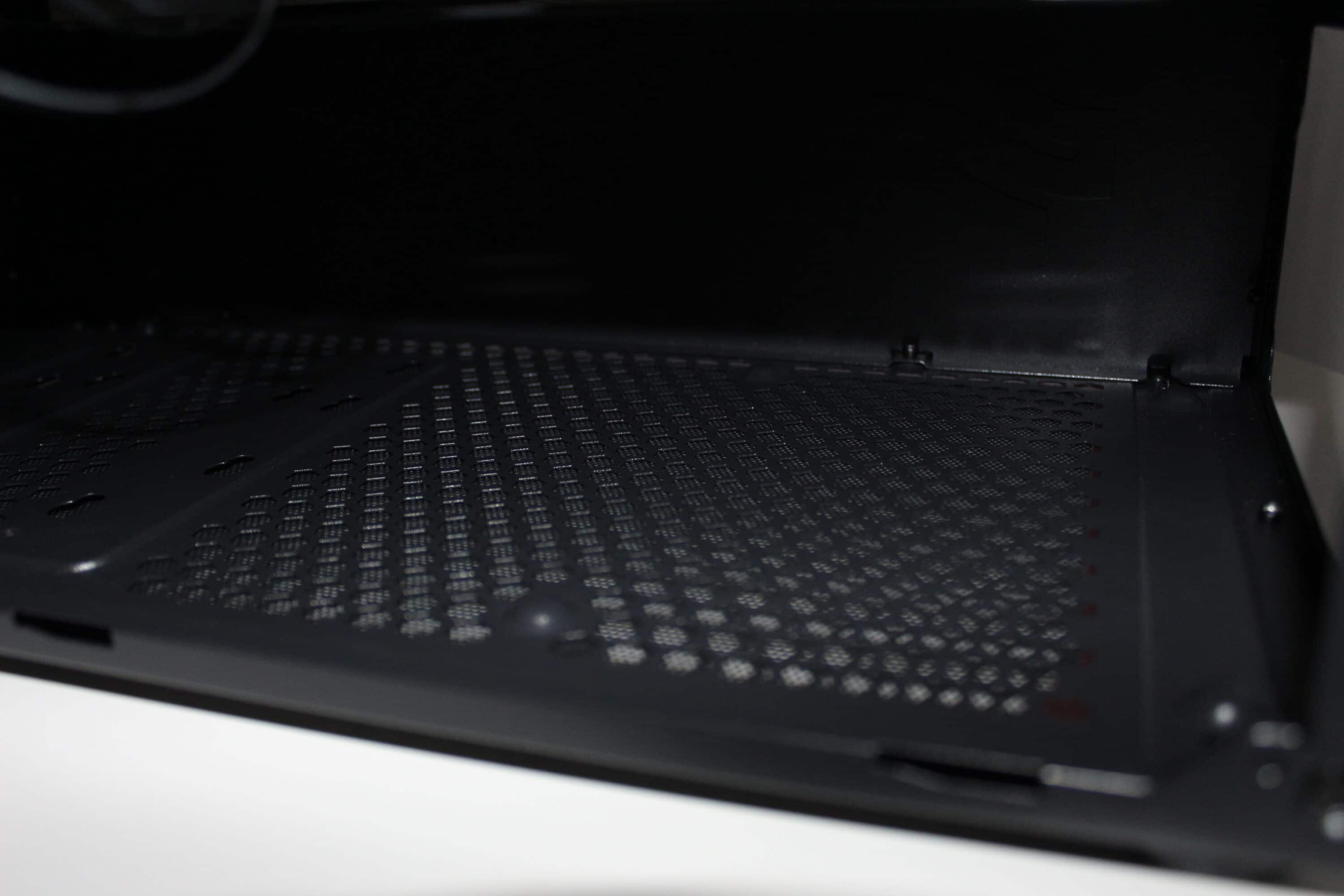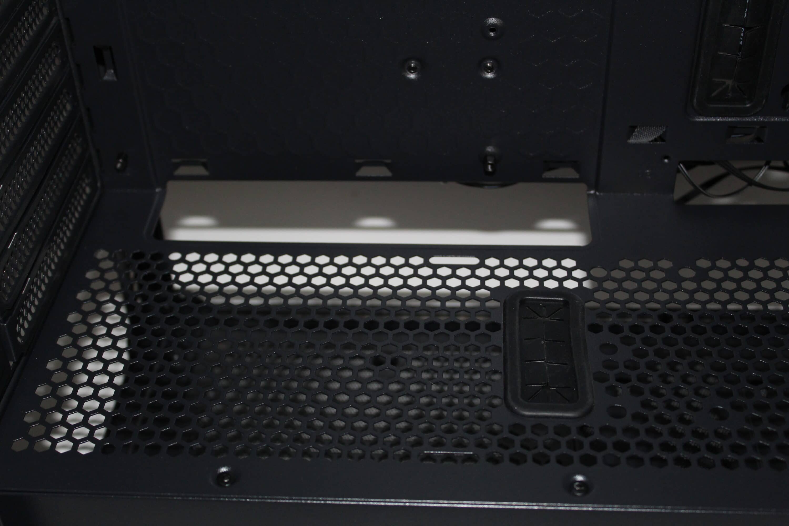 Innen fällt direkt der Netzteilschacht auf – so lassen sich Kabel verstecken. Damit lässt sich das Gehäuse zusätzlich zur Beleuchtung auf Optik trimmen, da kaum Kabel sichtbar sind. Der Netzteilschacht ist sehr gut ventiliert – neben der Möglichkeit, sein Netzteil aus dem Bodenbereich Luft ziehen zu lassen, wäre es durchaus möglich dies aus dem Gehäuseinneren zu tun. Gibt es zum Beispiel keine andere Möglichkeit, als den Computer auf einen Teppich zu stellen, erhält man hier Optionen, Probleme zu umgehen. Ein schönes Detail ist die Möglichkeit zur Kabeldurchführung an dieser Stelle. Falls man seine Grafikkarte von unten mit Strom versorgen möchte, kann man diesen Weg nutzen.