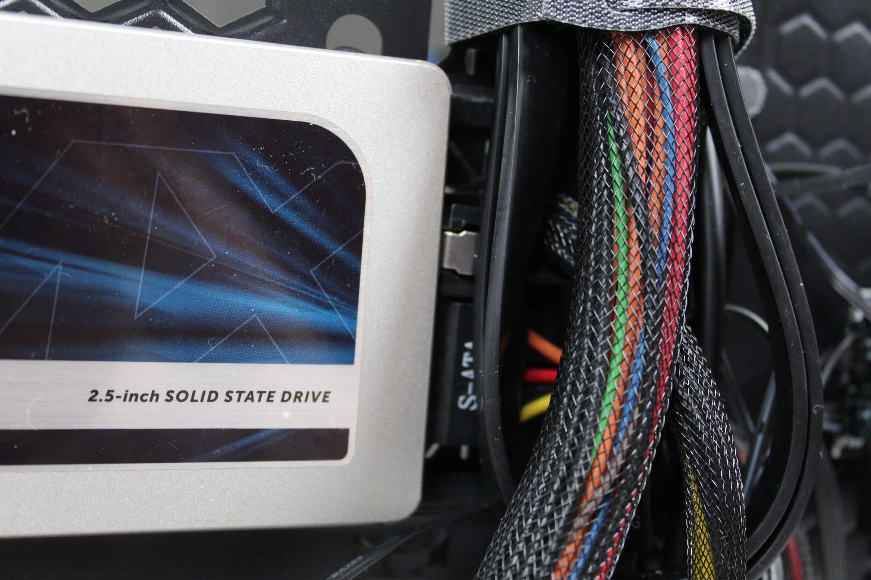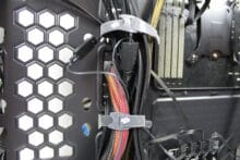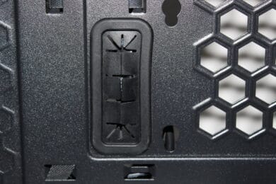 Zum Einbau von Festplatten hat man zwei Möglichkeiten. Die 2,5″-Montagepunkte sind auf der linken Seite, die Montage verläuft ohne Schlitten o.Ä.. Es werden kleine Gumminoppen in die SSD geschraubt, dann kann man diese in den Slot schieben. Alternativ, oder auch für 3,5″-HDDs funktioniert das selbe Prinzip im Netzteilschacht. Nutzt man diesen Platz nicht für HDDs, hat man sehr viel Platz um überschüssige Kabel zu verstauen.