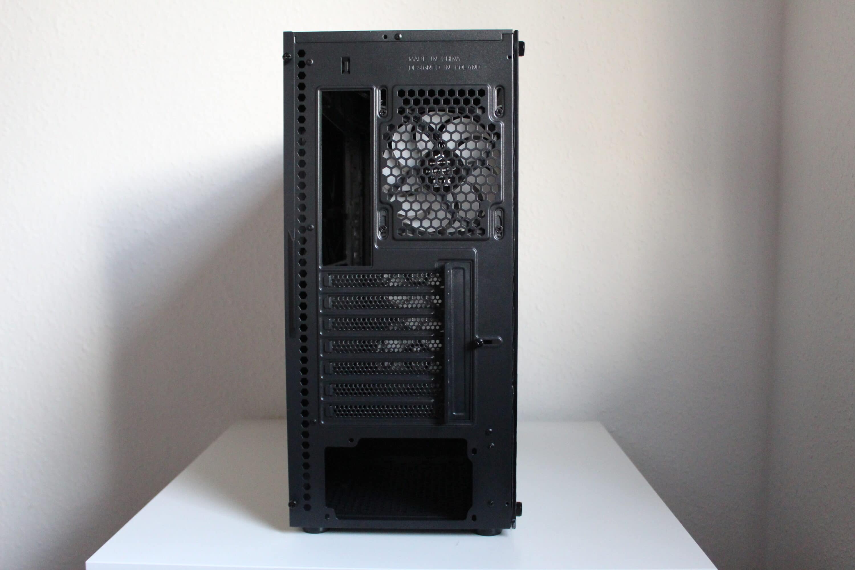 An den Seitenwänden befindet sich nichts außergewöhnliches. Das Tempered Glas, sowie das Metallpanel werden mit Rändelschrauben fixiert. Im Heck ist bereits von außen ein weiterer RGB-Lüfter zu erkennen, so kommt man auf vier inkludierte Lüfter. Dies ist in diesem Preisbereich stark. Die Slotblenden für Steckkarten, wie z. B. Grafikkarten, sind wiederverwendbar – auch wenn es einfach wirkt, ist dies nicht zwangsläufig Standard bei günstigen Gehäusen.
