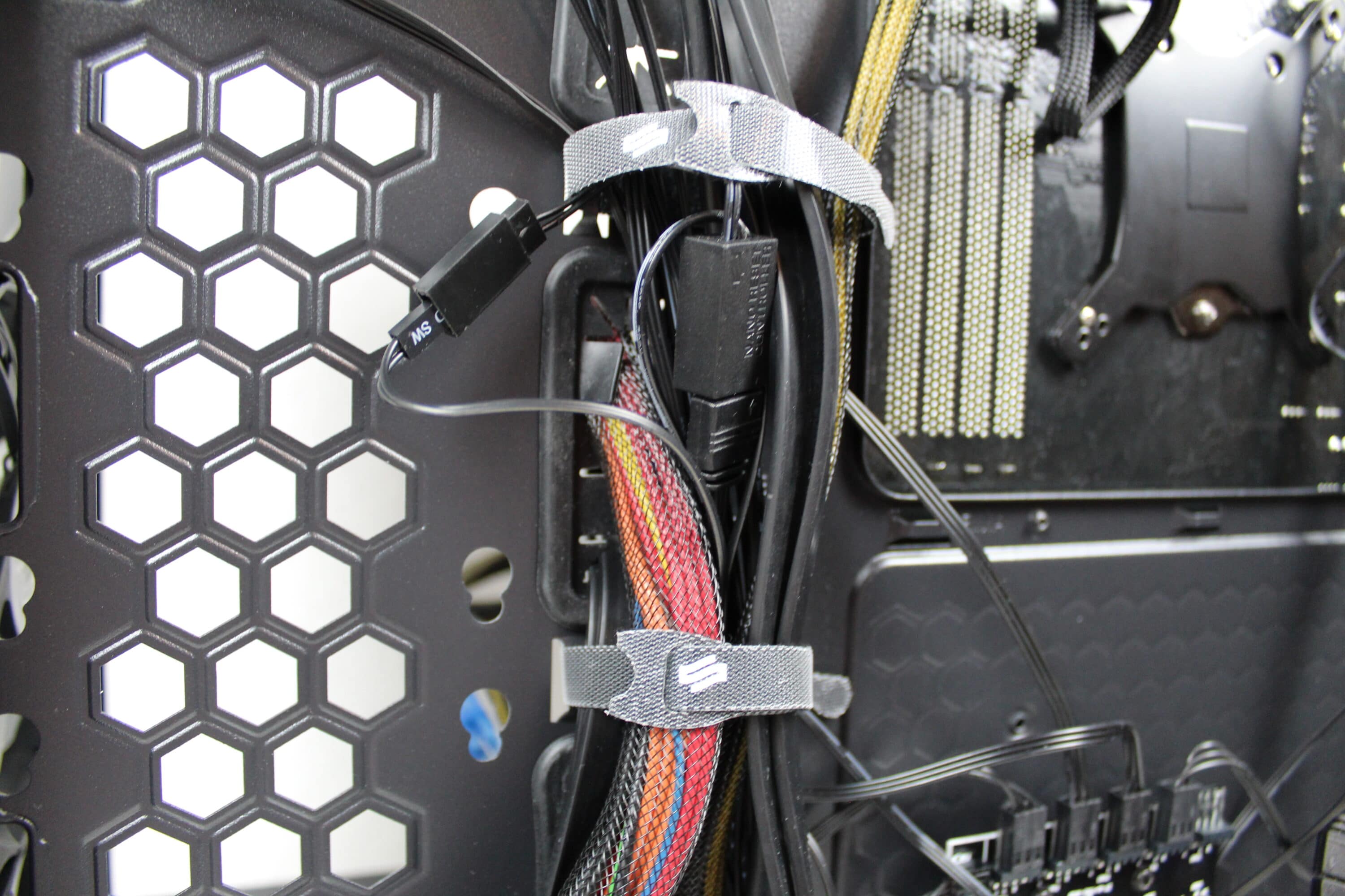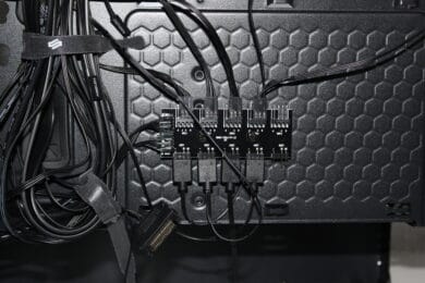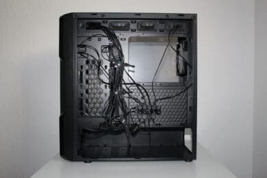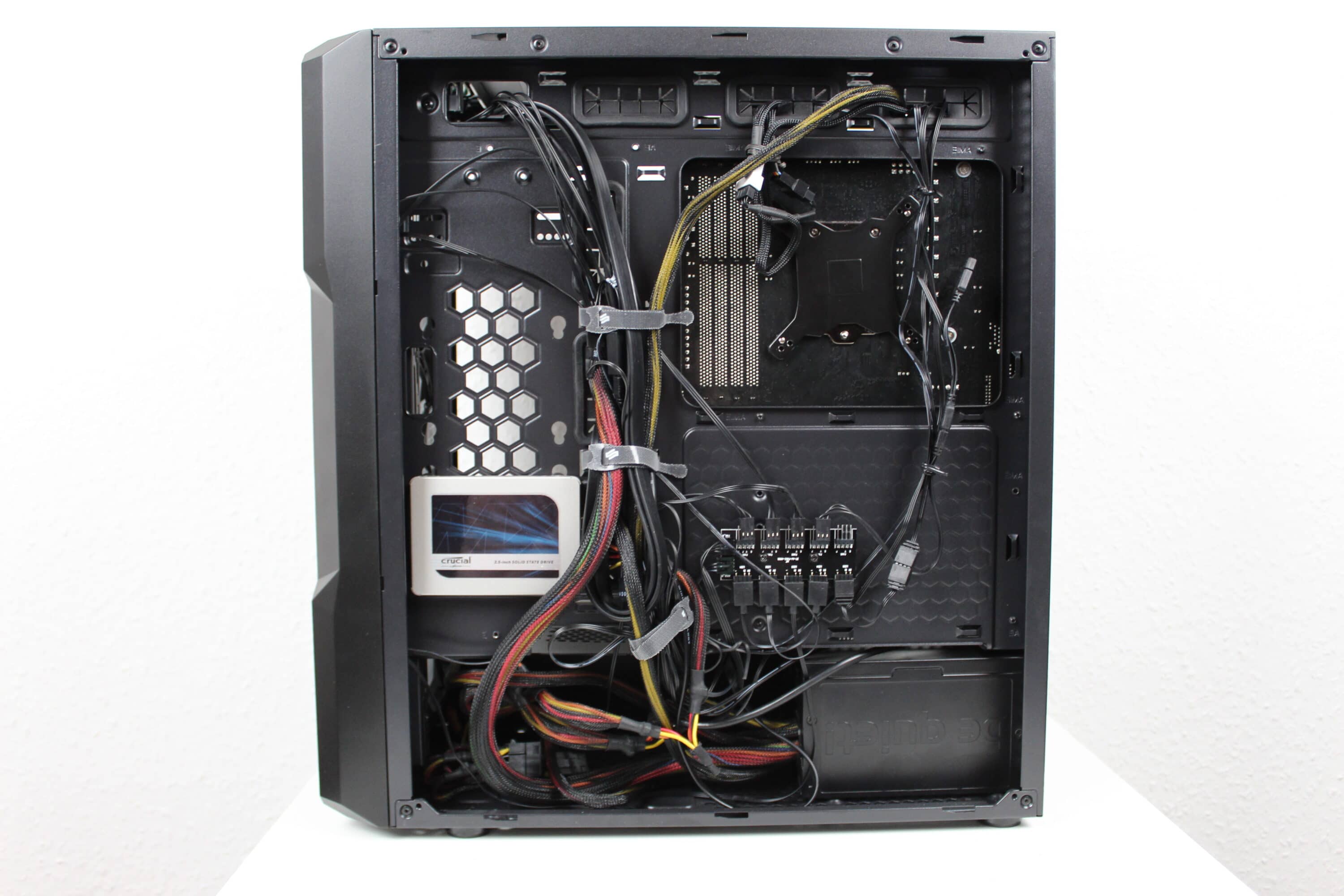 Auf der Rückseite erwarten uns einige Kabel, die ziemlich geklumpt in der Kabelführung vormontiert sind. Hier befindet sich neben dem RGB-Splitter auch ein kleiner Controller – bei RGB-Verkabelung bleibt eine Masse von Kabeln kaum aus. Grundsätzlich ist die Kabelführung gut, es sind bereits Kabelkletten vorhanden. Als kleiner Kritikpunkt – warum muss dieser Weg direkt über den Kabeldurchführungen sitzen? Auch die Montage der 2,5″ Festplatten bzw. SSDs sitzt an dieser Stelle. So hat man einen ordentlichen Kabelweg, dennoch ist hier eine Menge auf einem Fleck und dadurch einiges gequetscht.