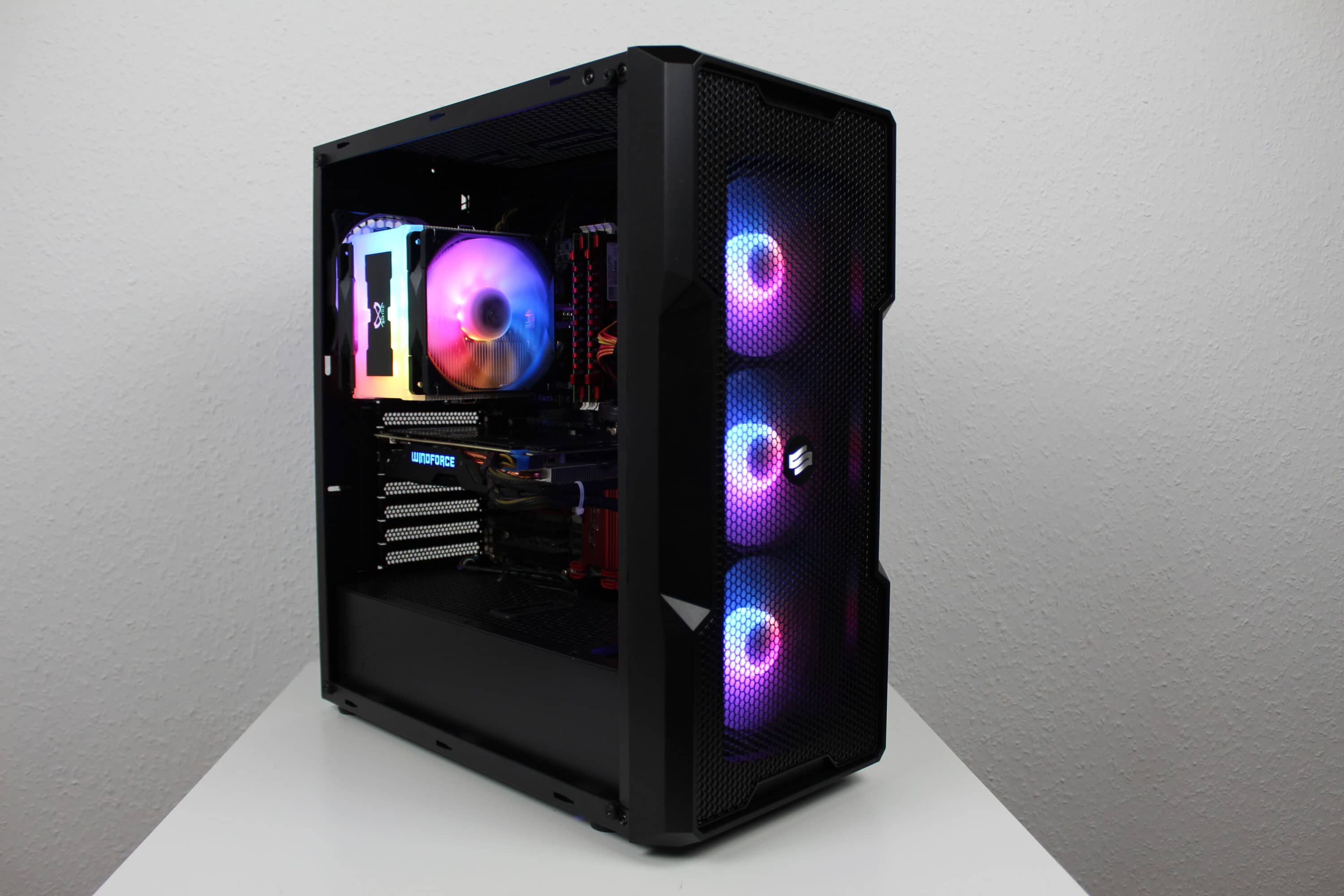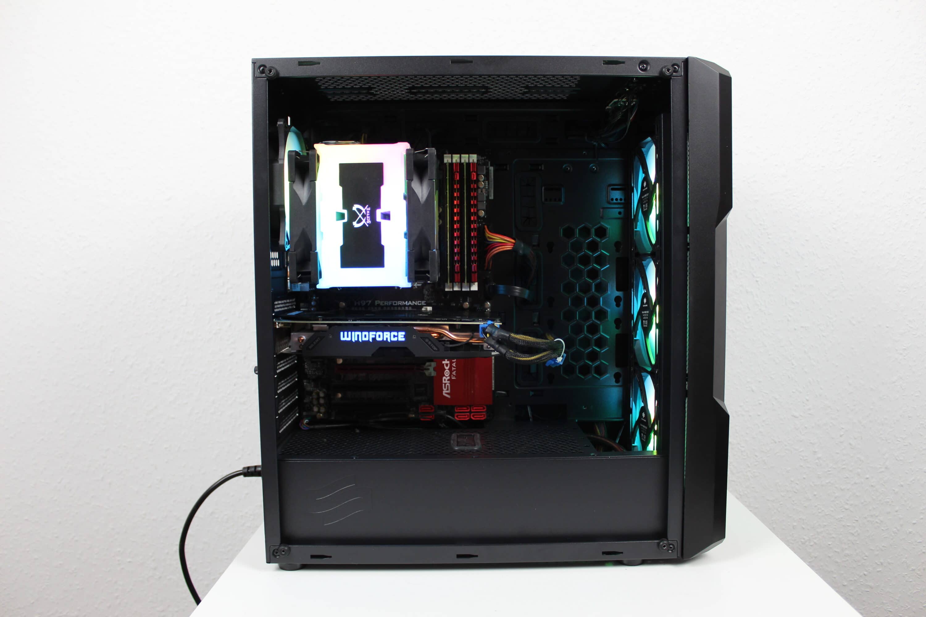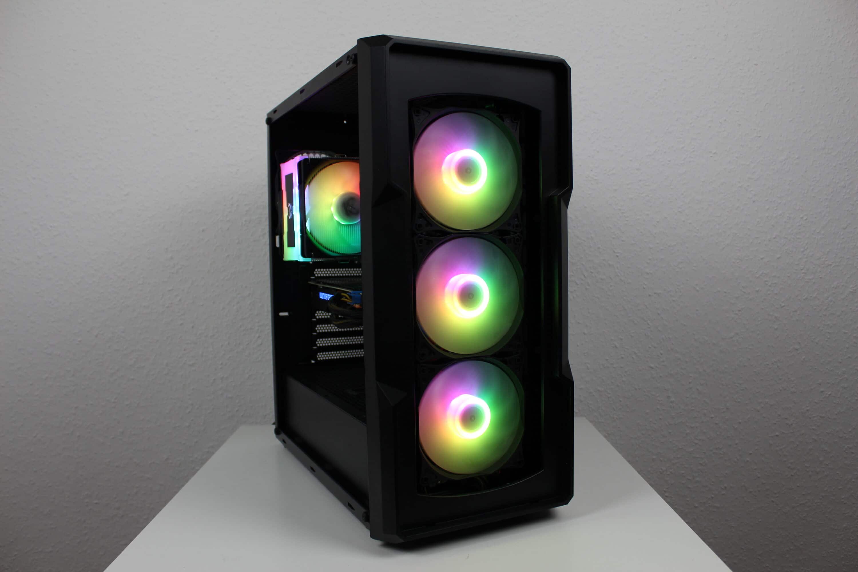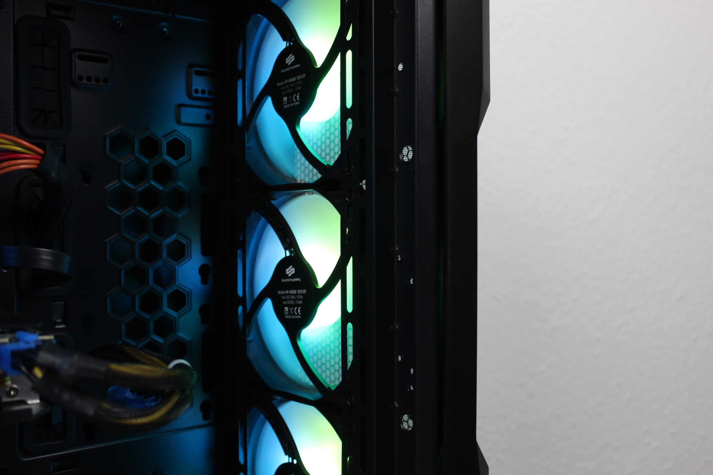 Nicht gespart jedoch wurde an den Lüftern. Das Gehäuse ist klar auf Beleuchtung ausgelegt und zeigt das auch mit seinen vier RGB-Lüftern. Diese sind ordentlich montiert und die Kabel werden bereits zur Rückseite geführt.
