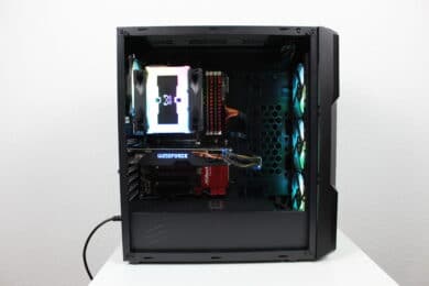 Durch die Meshfront und -Top ist eine sehr gute Frischluftzufuhr gewährleistet. Um dies zu testen, erhitzen wir zeitgleich die GPU mit FurMark und die CPU mit Prime95 – anschließend wird die Temperatur gemessen. Hier erreichen wir sehr gute 52 °C bei der CPU – bei 100% PWM der Lüfter. Dies gibt uns einiges an Spiel – nach einer Justierung erhalten wir ein ausreichend kühles System mit kaum wahrnehmbaren Lüftern. Auch der Grafikkarte kommt die Frischluft zugute – so müssen die Lüfter langsamer drehen und daraus resultiert eine geringere Gesamtlautstärke. Generell sind die Lüfter sehr leise und erfüllen ihren Job vollkommen – großer Pluspunkt!