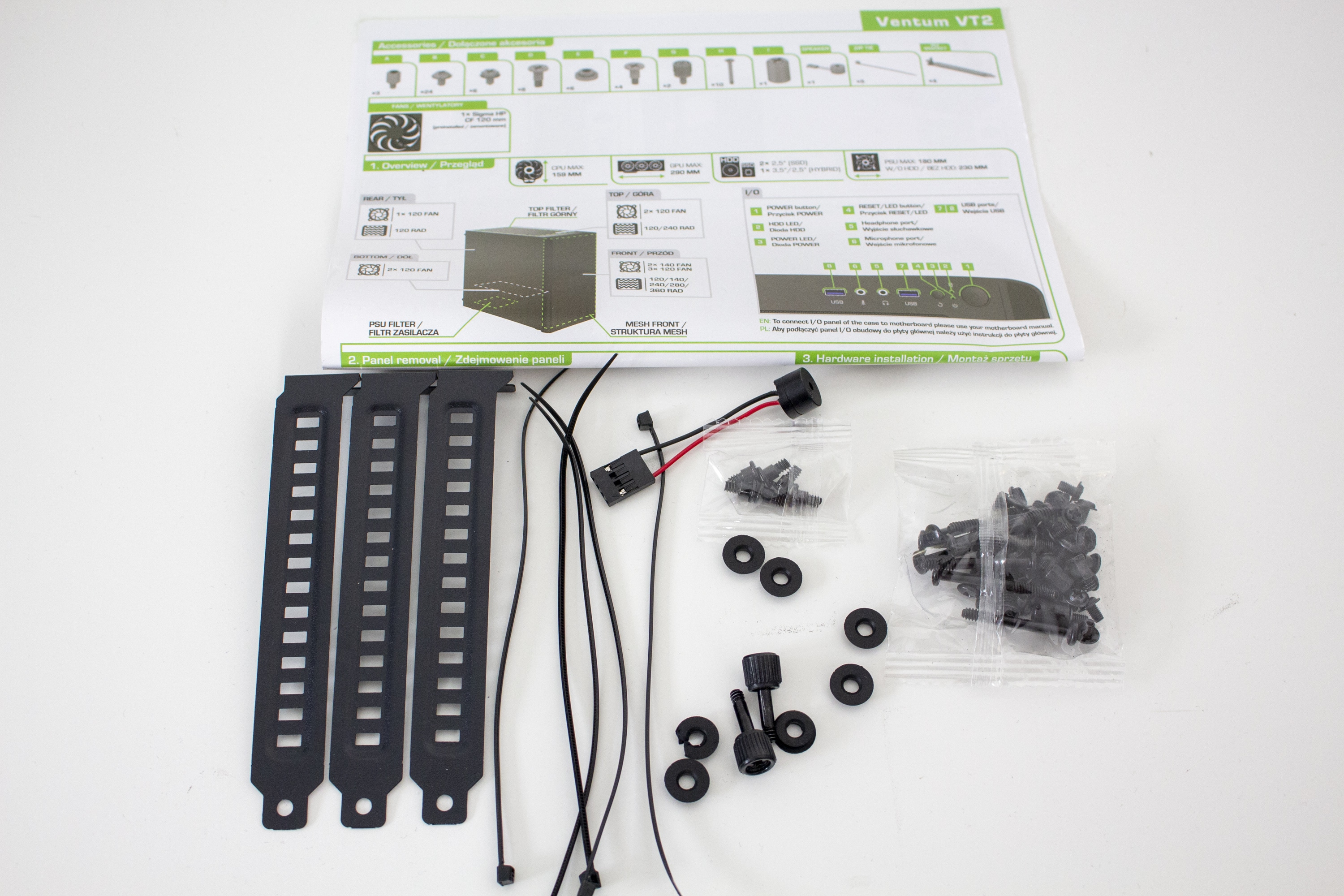 Wie bei SilentiumPC üblich, kommt auch das Ventum VT2 in einem unauffällig gestalteten Karton aus Pappe. Dieser ist überwiegend braun und teilweise schwarz bedruckt. Neben einer Abbildung des Gehäuses sind auch zahlreiche technische Daten auf den Seiten aufgedruckt. Innerhalb des Kartons wird das VT2 von normalem Styropor und einer Folie aus Kunststoff umhüllt. Das mitgelieferte Zubehör befindet sich in einem kleinen Kunststoffbeutel hinter dem Mainboard-Tray. Dieser beinhaltet alle zur Montage notwendigen Schrauben, einen Aufsatz zum Eindrehen von Standoffs, eine Handvoll Kabelbinder, einen Mainboard-Lautsprecher, vier PCI-Slotblenden aus Metall und eine kurze Montageanleitung mit Bildern. Für ein Budget-Gehäuse ist das ein solider Umfang.