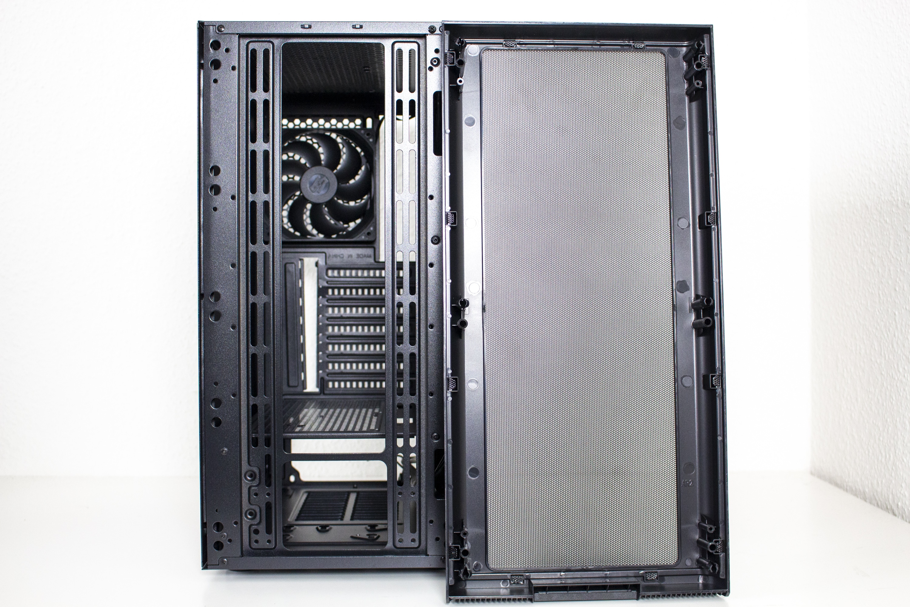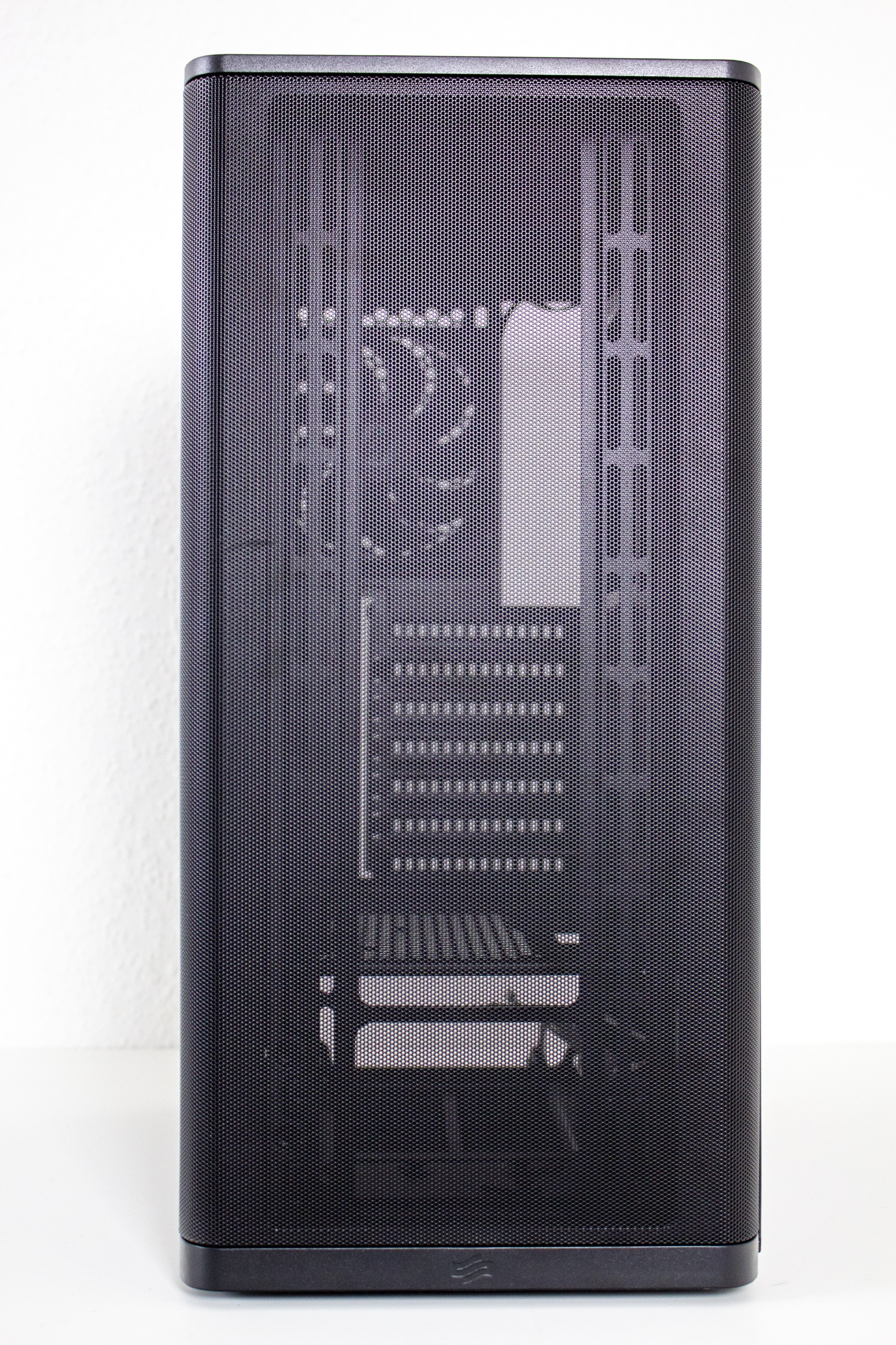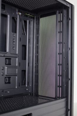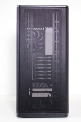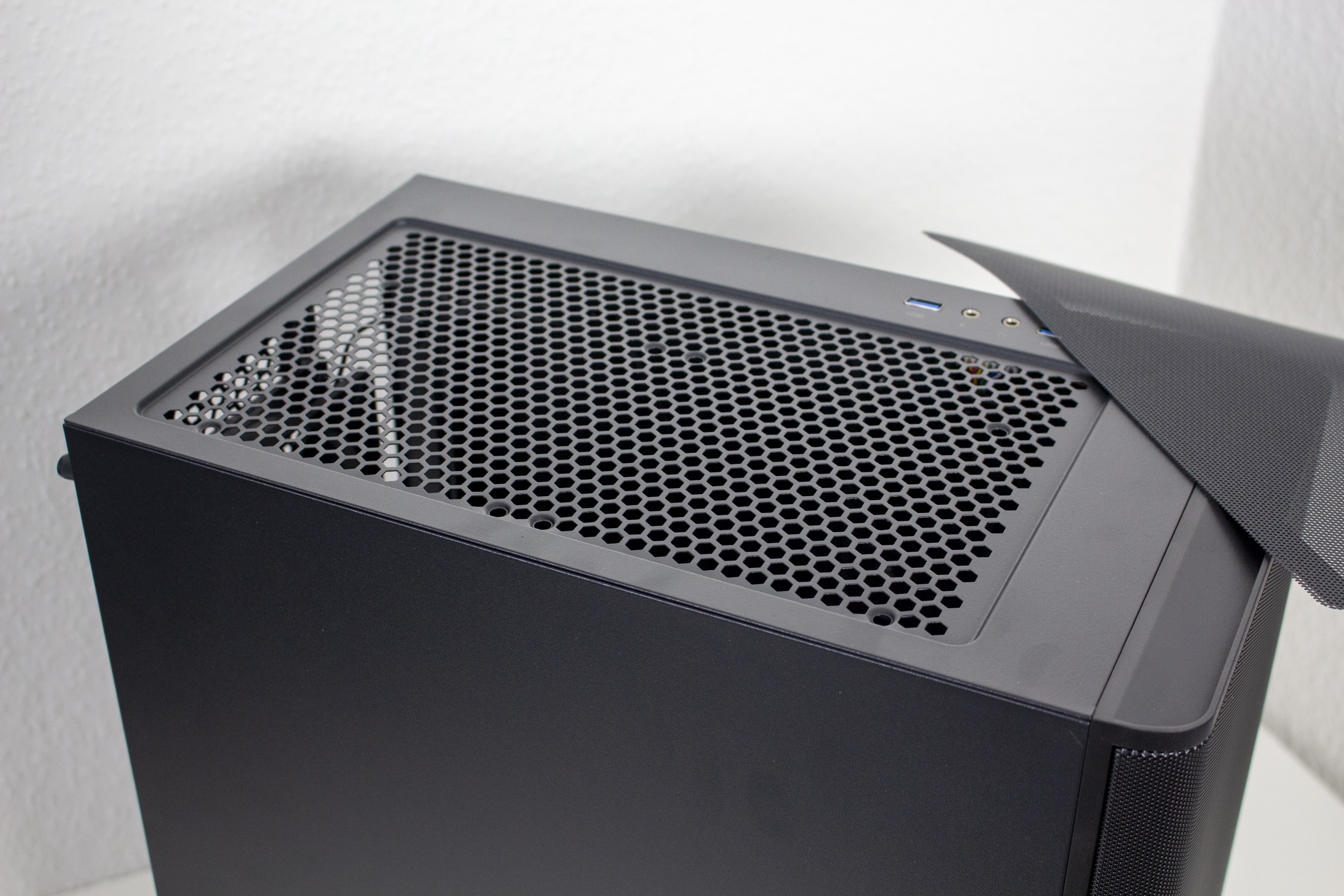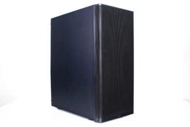 Äußerlich lässt sich das Ventum VT2 in seiner Basisversion definitiv als schlicht, zurückhaltend und zeitlos bezeichnen. Die Front wird dominiert durch ein großes Meshgitter, welches das gesamte Panel überspannt und an den Ecken nach hinten gebogen wurde. Ein Kunststoffrahmen hinter dem Mesh sorgt dabei für eine gewisse Stabilität ohne den Airflow zu beeinflussen. Hinter dem Mesh gibt es leider keinen zusätzlichen Staubfilter. Durch einen starken Ruck lässt sich das kabellose Frontpanel nach vorne hin abziehen und gibt somit den Blick auf die Montageschienen für Lüfter oder Radiatoren frei. Platz ist hier für bis zu einen 360-Millimeter-öRadiator.