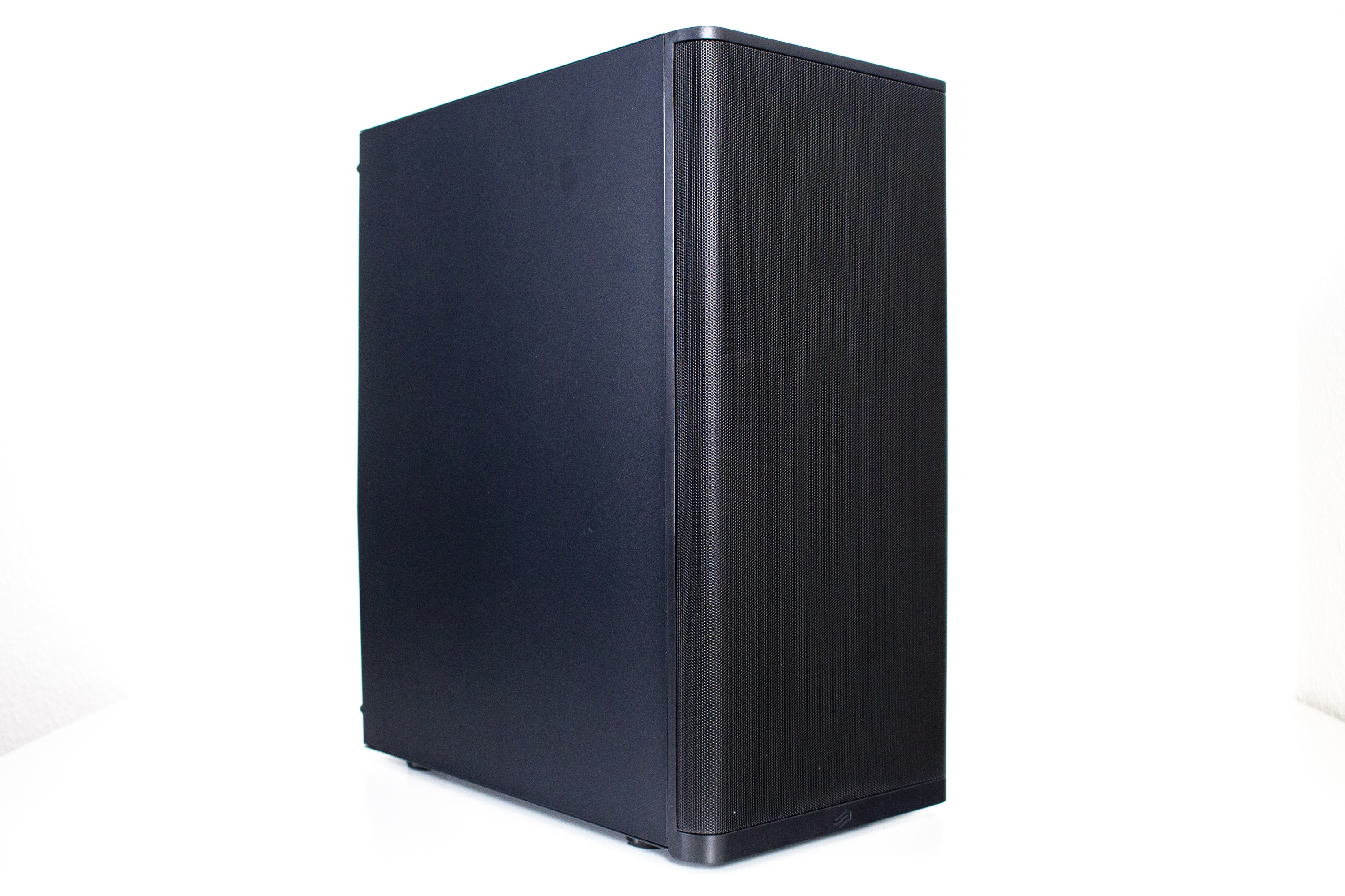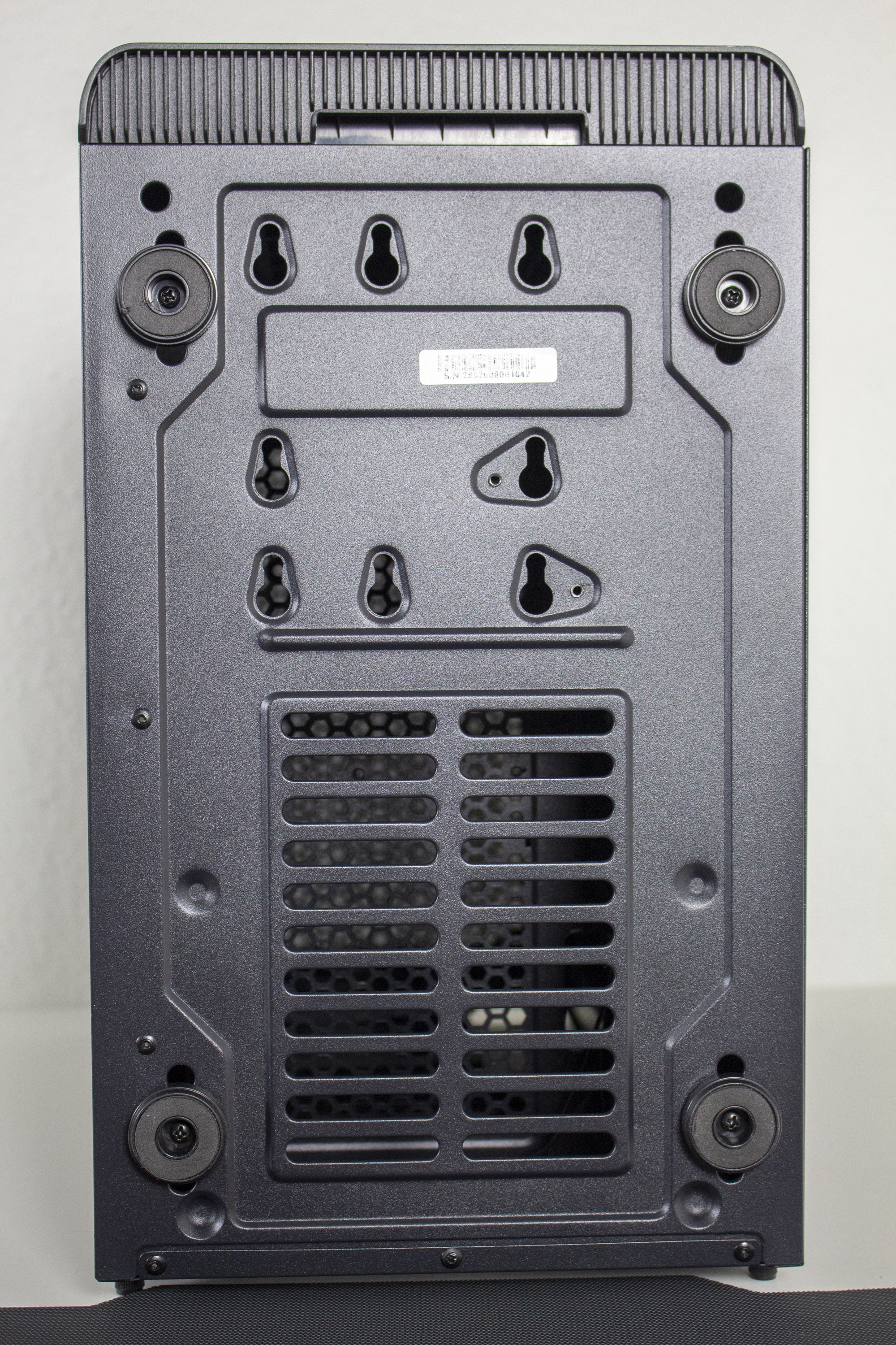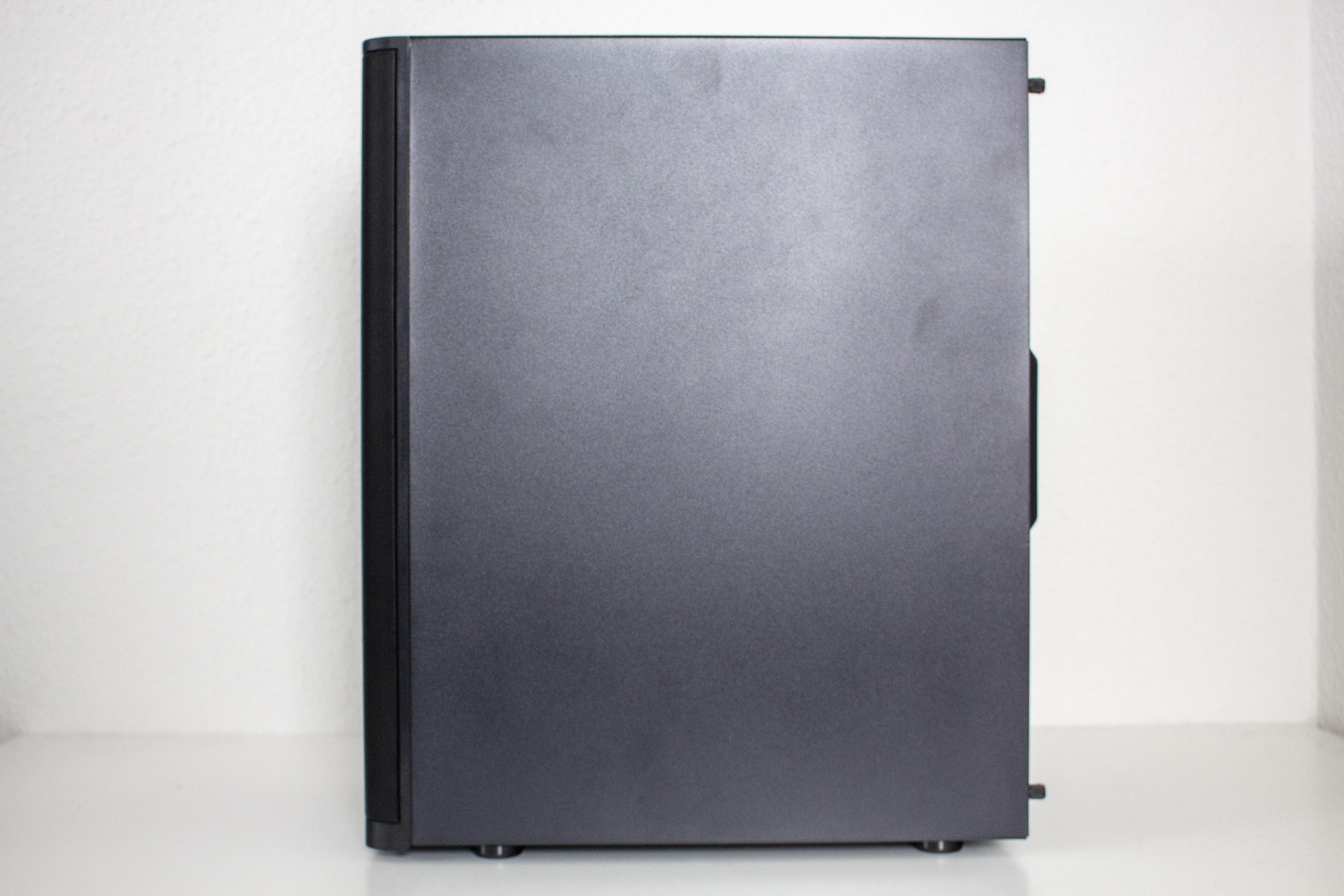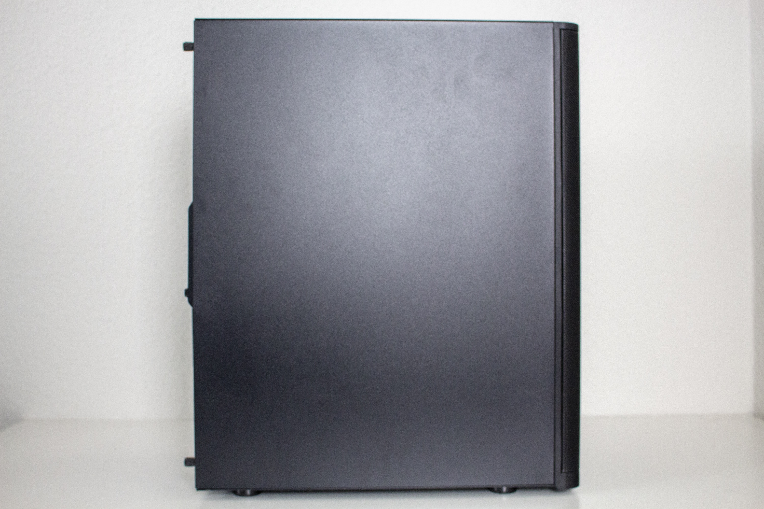 Die Seitenteile folgen in der Basisversion der Vorgabe eines unauffälligen Gehäuses. Beide bestehen aus Stahl, sind komplett geschlossen und verfügen über eine Stabilität, die für die angepeilte Preisklasse in Ordnung geht. Die Verbindung mit dem Korpus erfolgt über jeweils zwei Rändelschrauben und eine Griffmulde am hinteren Ende soll die Demontage erleichtern. Die Montage der Seitenteile ist aber leider suboptimal gestaltet. Im vorderen Bereich werden diese zwar über Stahllaschen eingehakt, fallen aber ohne die Rändelschrauben bei der kleinsten Berührung wieder ab. Hier haben wir schon bessere Lösungen gesehen.