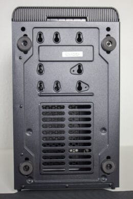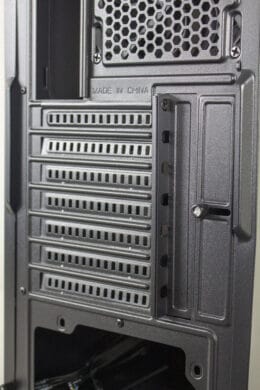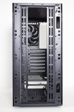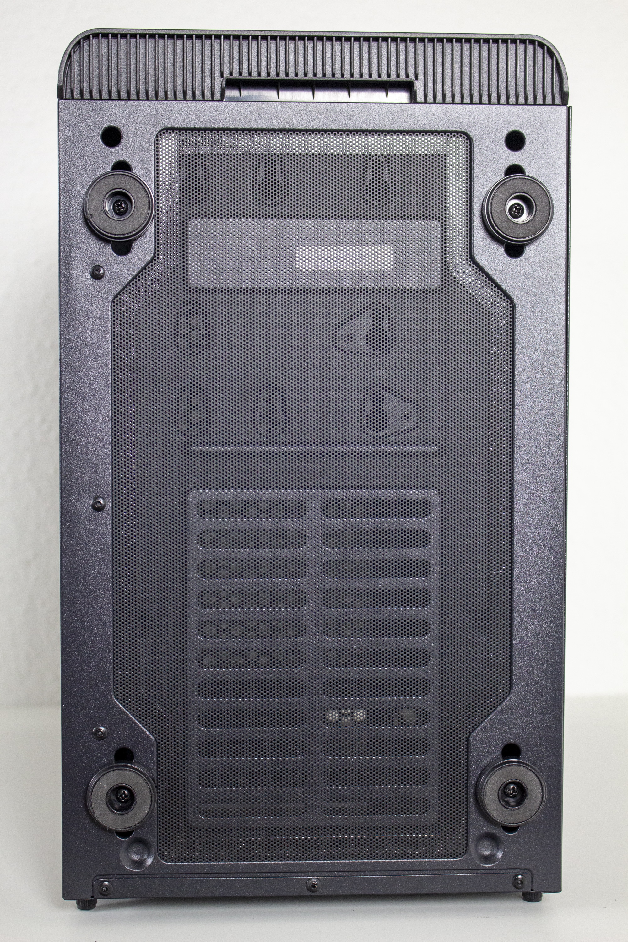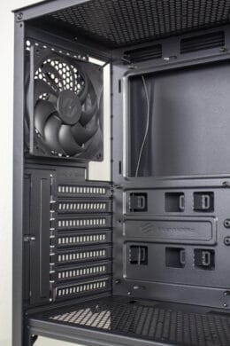 Unaufgeregt geht es an der Rückseite weiter. Der Hersteller setzt auf ein bewährtes Layout, bei dem das Netzteil unten montiert wird. Darüber sind sieben nicht wiederverwendbare PCI-Slotblenden für Erweiterungskarten zu sehen. Diese müssen herausgebrochen werden und die Verschraubung der Erweiterungskarten erfolgt außerhalb des Gehäuses. Zuletzt ist noch der vormontierte 120-Millimeter-Lüfter am Heck zu erkennen.