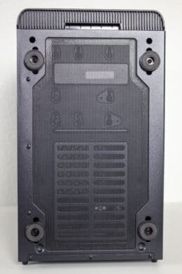 Einen sicheren Stand erhält das VT2 über vier herkömmliche Füße aus Kunststoff. Diese gewinnen zwar keinen Schönheitspreis, sie erfüllen jedoch ihren Zweck und wurden jeweils mit einer Schicht Moosgummi ausgestattet. Zum Schutz vor Staub hat SilentiumPC dem VT2 noch eine Staubfiltermatte aus Mesh spendiert. Zu unserem Erstaunen überspannt diese den ganzen unteren Bereich und verfügt zudem über Magnetstreifen. Gerade letzteres vereinfacht die Reinigung sehr stark.