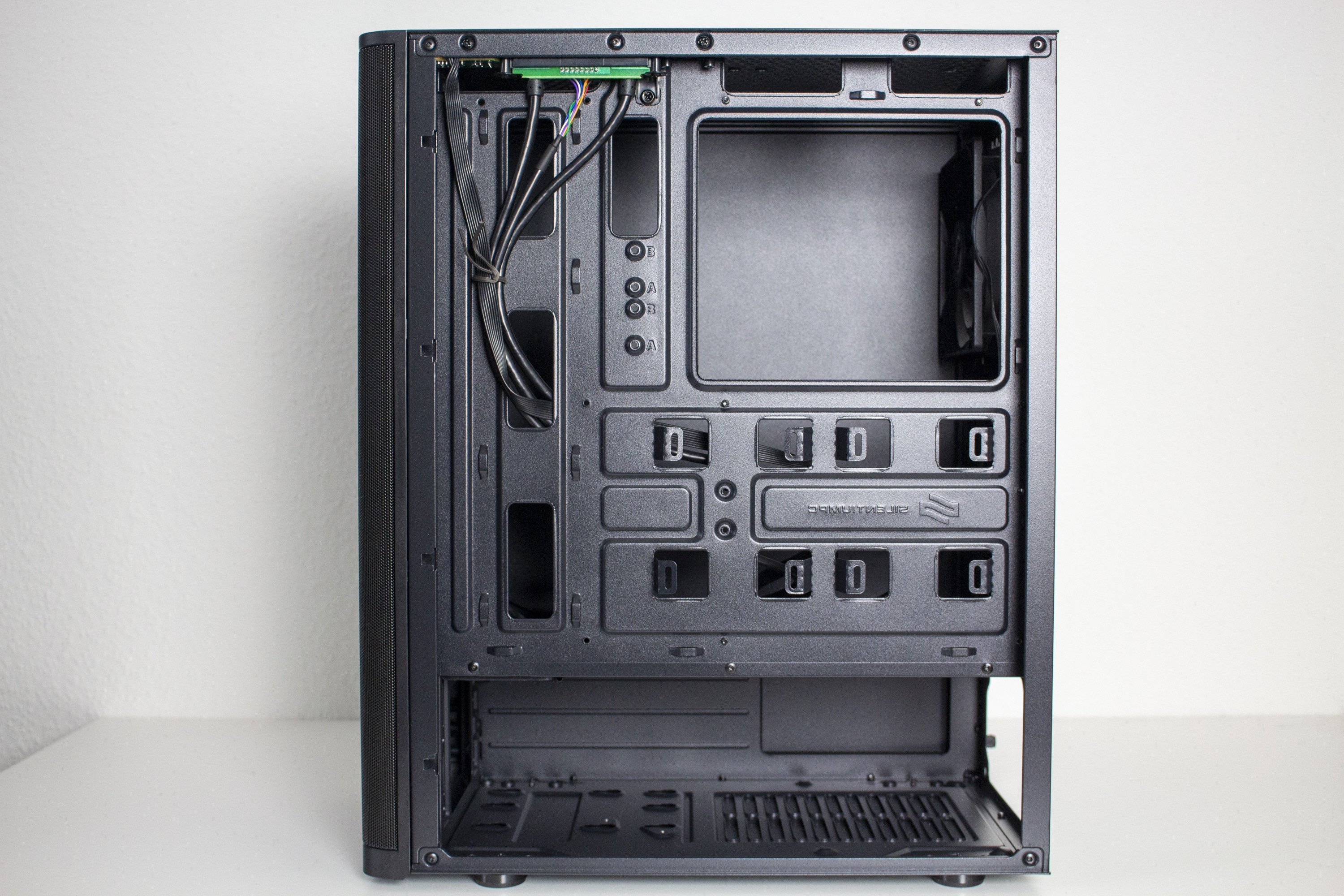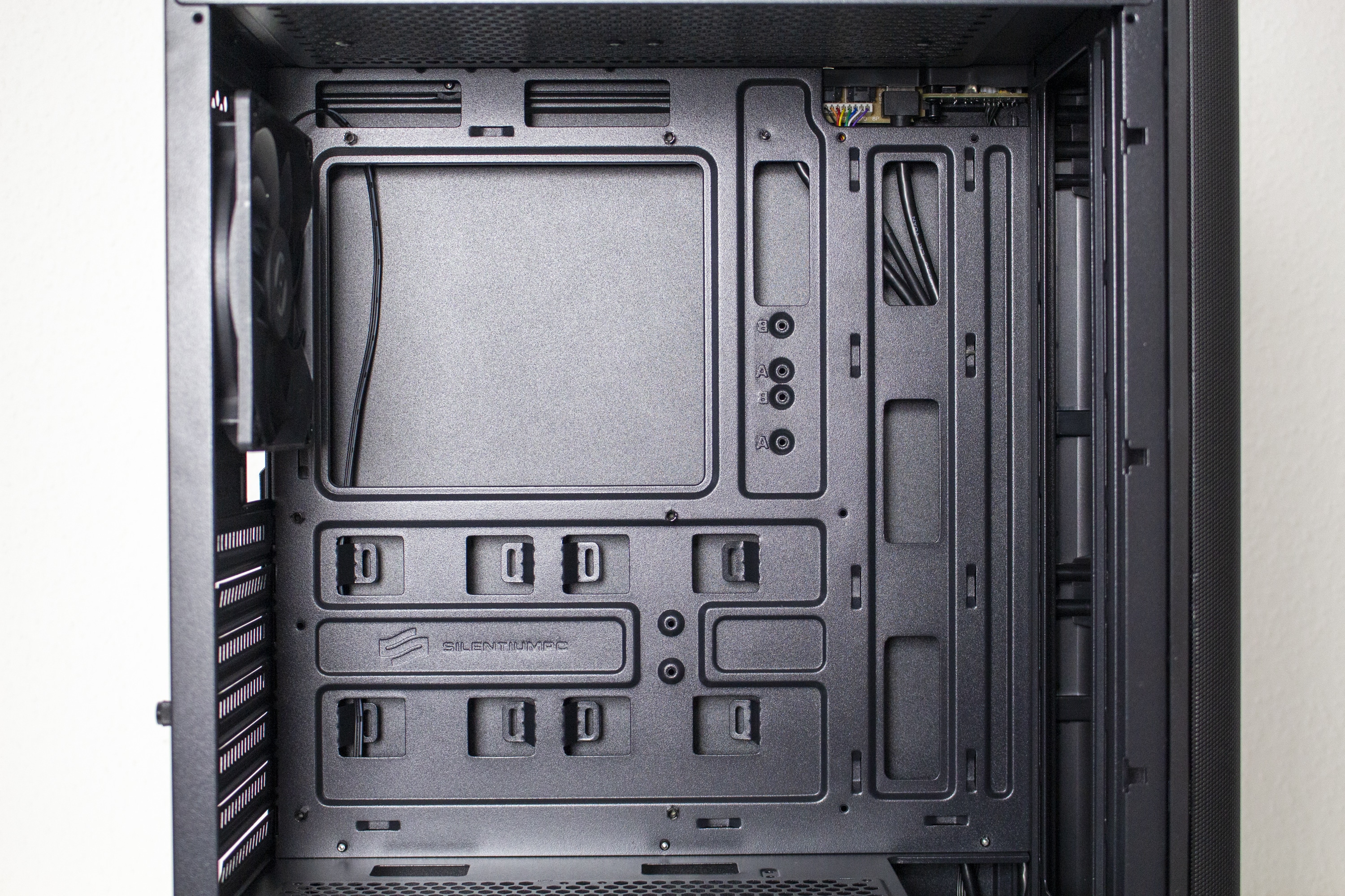 Um den Preis so niedrig wie möglich zu halten, erfindet SilentiumPC den Innenraum des Ventum VT2 natürlich nicht neu. Stattdessen kommt das bekannte Zwei-Kammer-System mit einem schwarz lackierten Innenraum zum Einsatz. In der oberen Hauptkammer gibt es viel Raum für die Komponenten und hinter den optionalen Frontlüftern gibt es keine Elemente, die den Airflow beeinflussen könnten. Da das Ventum VT2 allerdings keine externen Laufwerke unterstützt, ist das Mainboard-Tray kaum breiter als ein normales ATX-Mainboard. Zusätzlich wurde es mit zahlreichen Öffnungen und Ausschnitten für das Kabelmanagement und zur Montage von CPU-Kühlern mit Backplate ausgestattet.