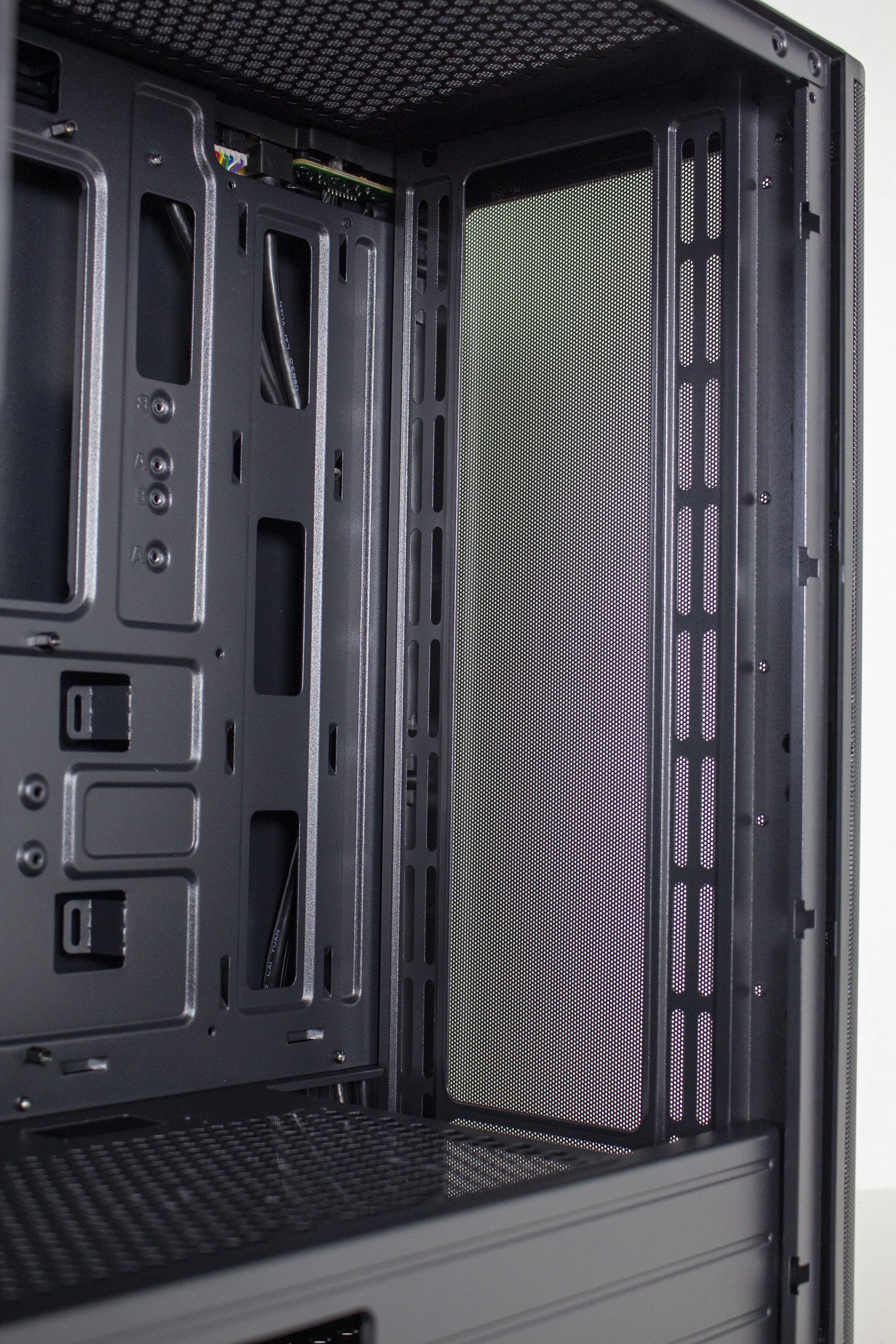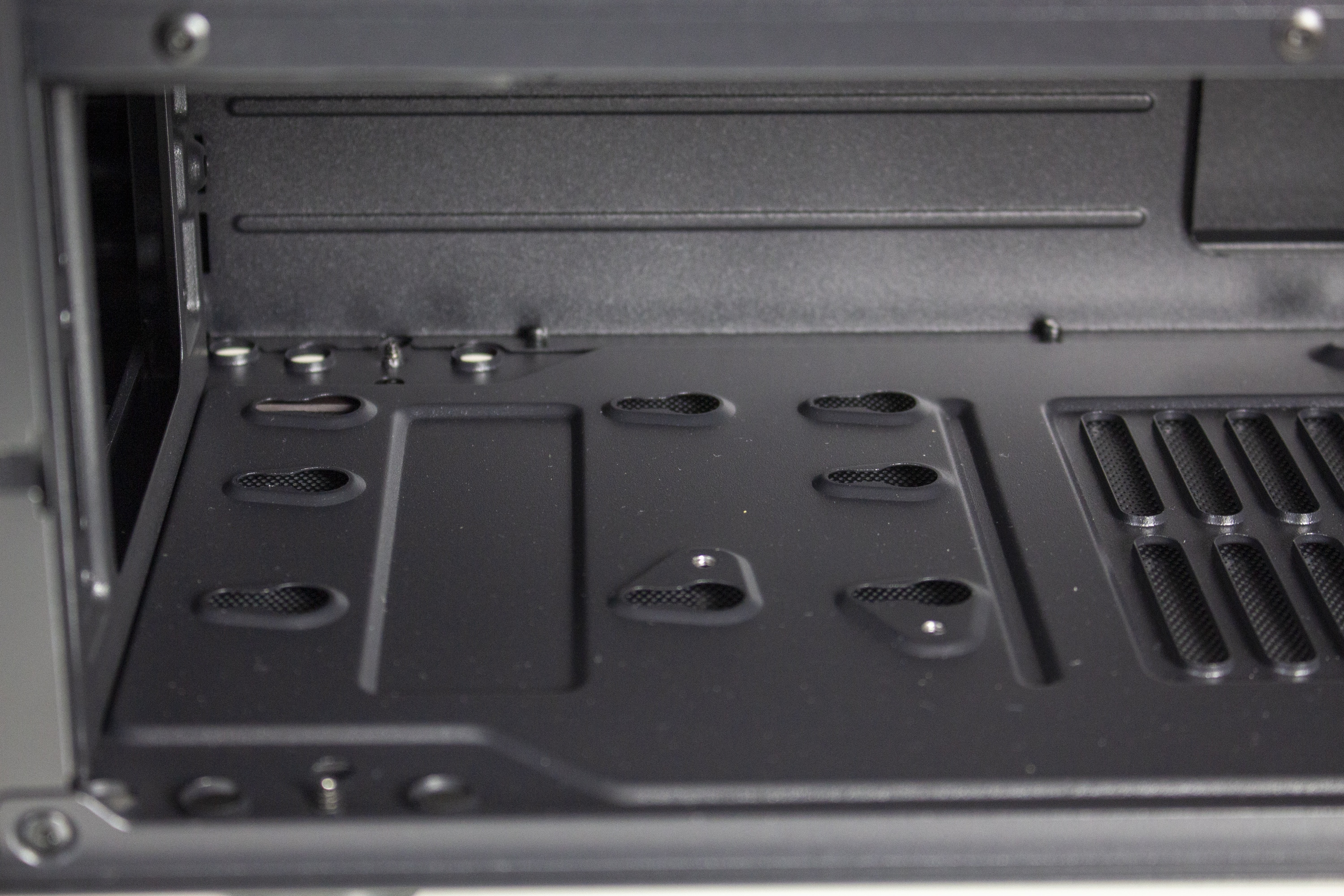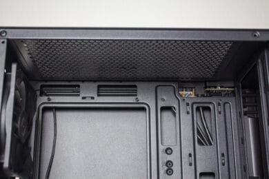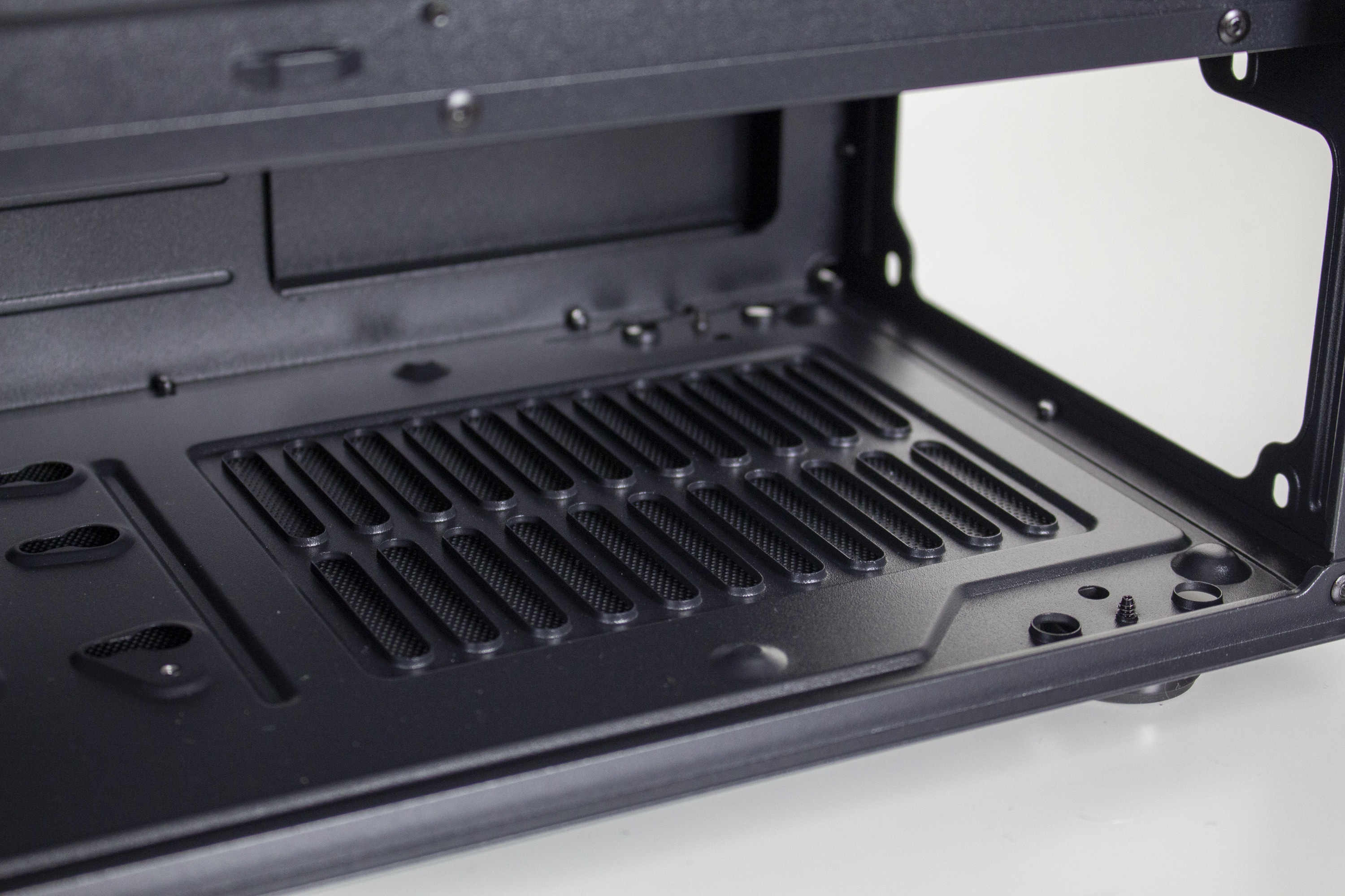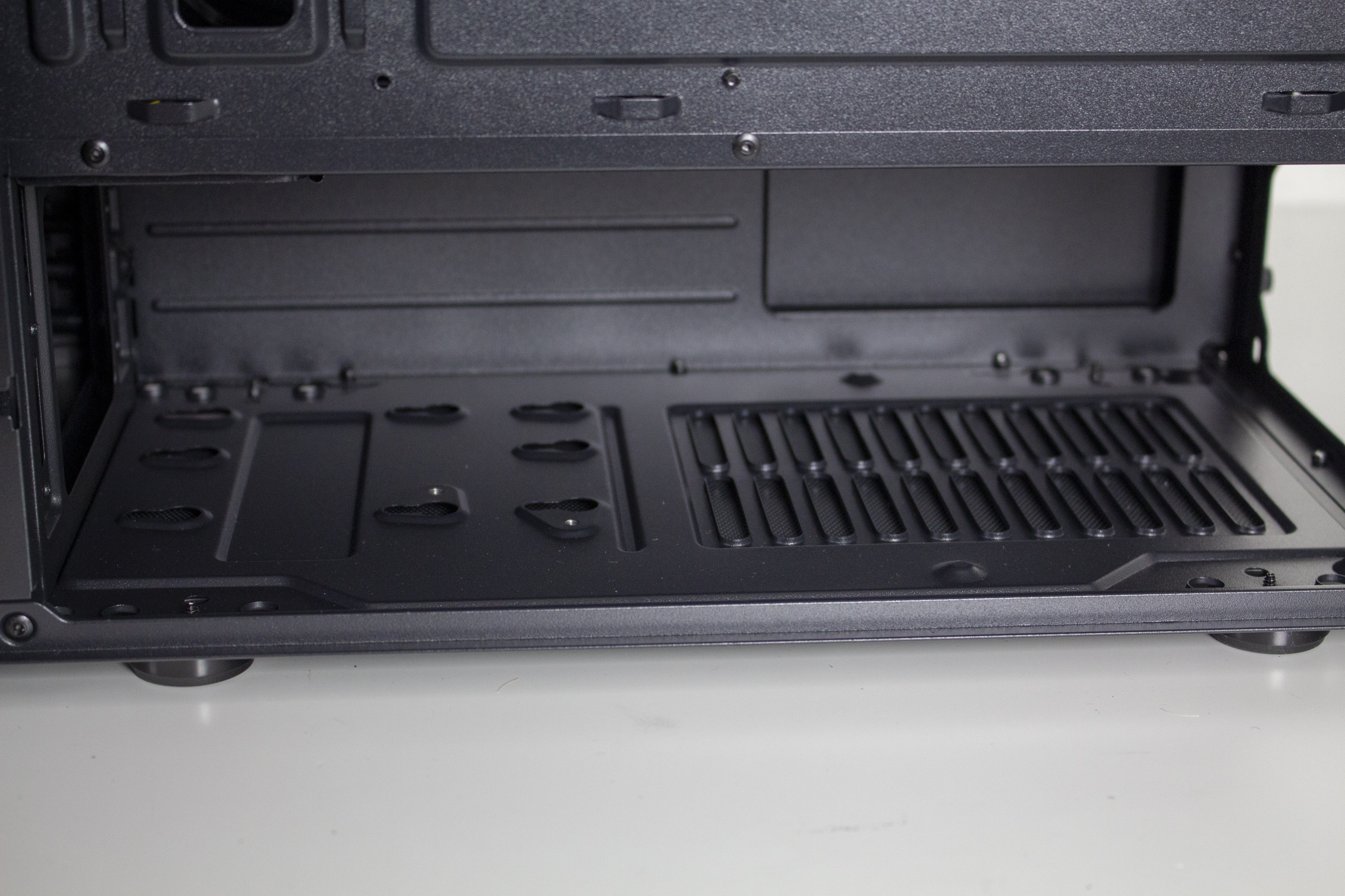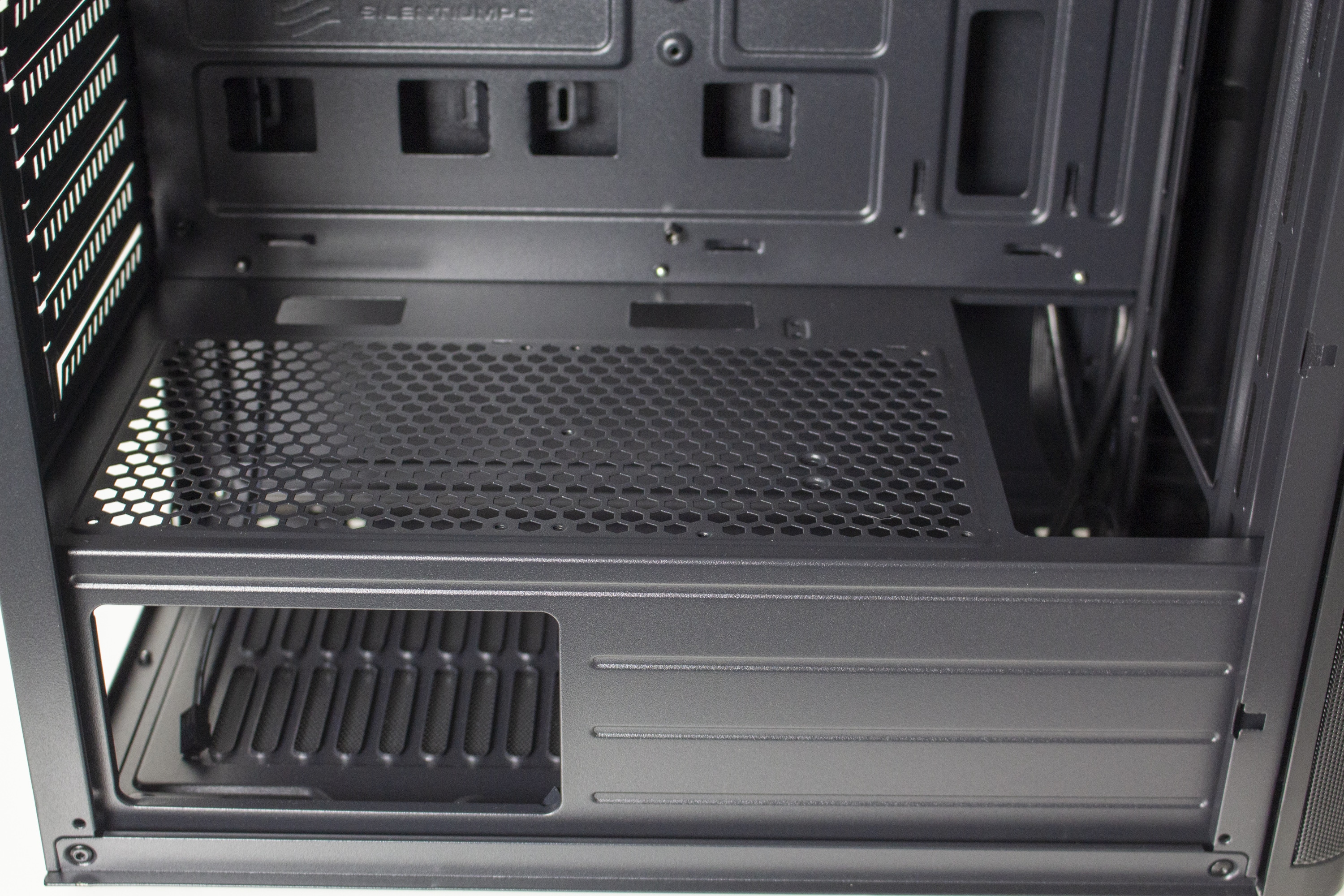 Der untere Bereich des Innenraums wird durch eine große Netzteilabdeckung vor neugierigen Blicken geschützt. Diese ist jedoch nicht ganz geschlossen und verfügt stattdessen auf der Oberseite über zwei Kabelmanagement-Öffnungen und ein großes Belüftungsgitter. Außerdem ermöglichen zwei weitere Ausschnitte den Blick auf das Typenschild des Netzteils und die Montage eine tiefen Radiators in der Front.