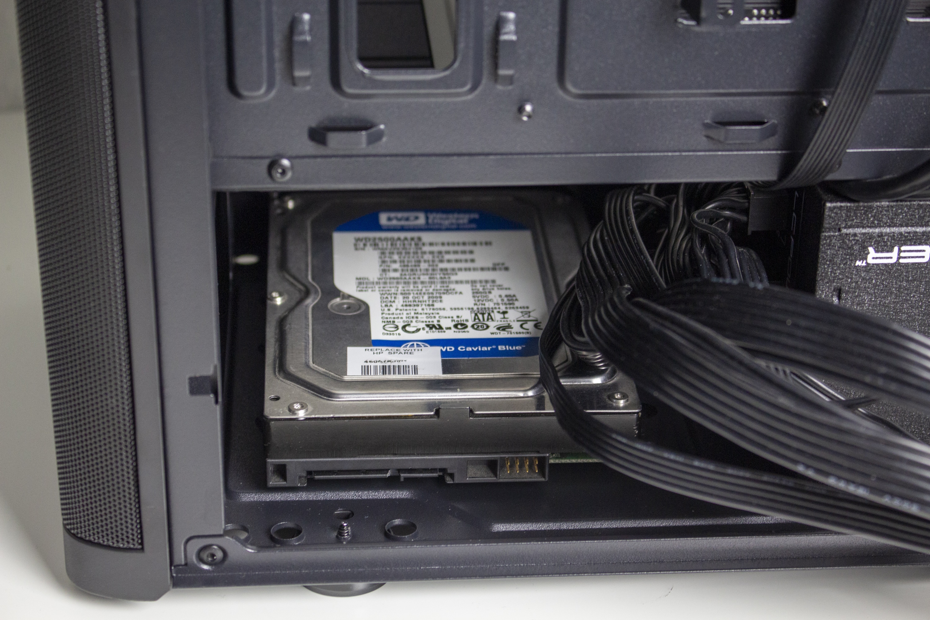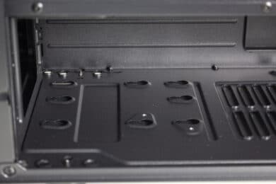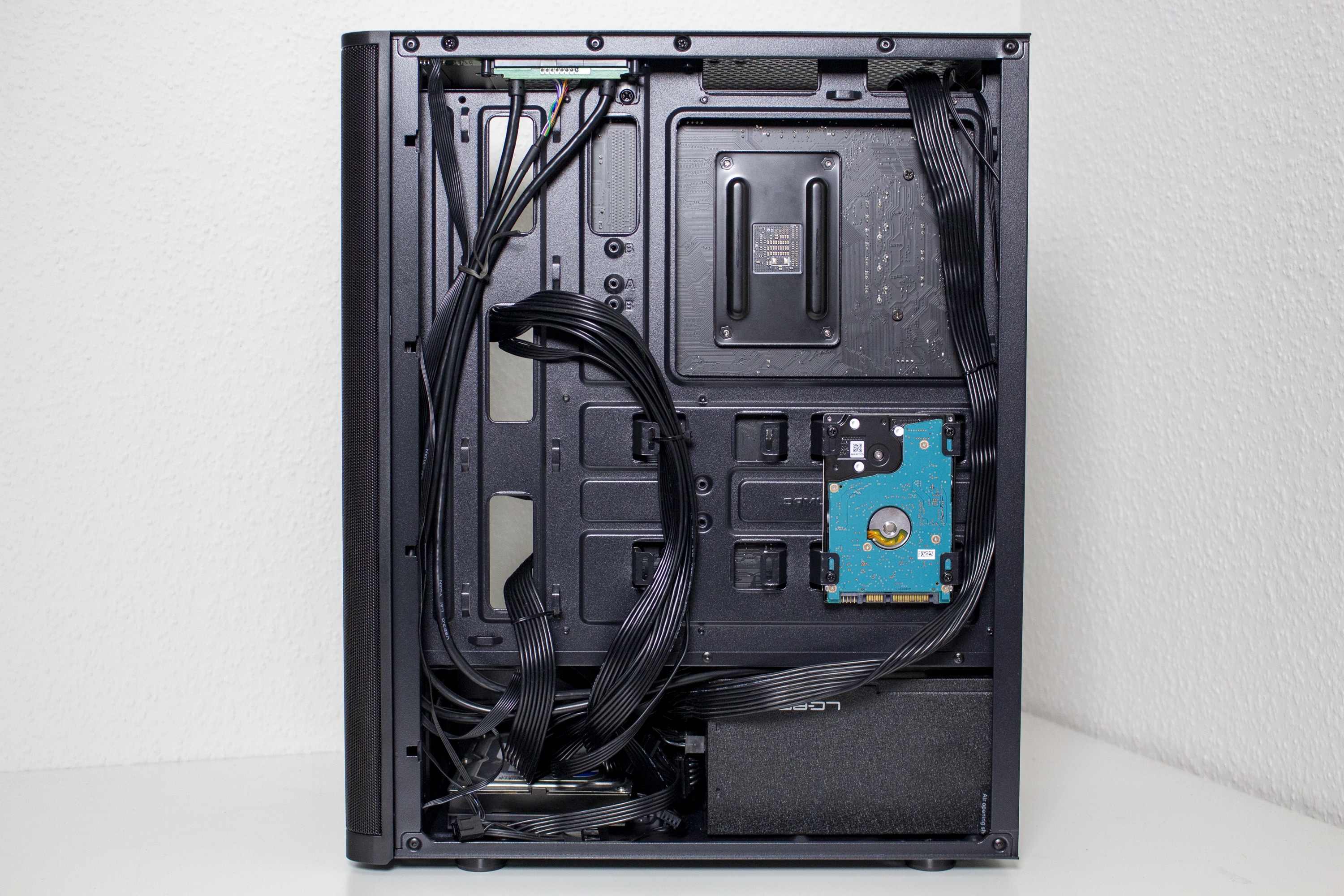 Wenden wir uns nun der Rückseite des Mainboard-Trays zu. Hier gibt es doch etwas mehr Platz als gedacht. So stehen hier stellenweise bis zu 28 Millimeter Platz für Kabel zur Verfügung. Zusätzlich verfügt die Rückseite über viele Stahllaschen an denen man Kabelbinder bzw. Kabel befestigen kann. Unterhalb der Netzteilblende wird natürlich das Netzteil montiert und links daneben befindet sich der Montageplatz für eine große 3,5″-Festplatte. Beim Netzteil verzichtet der Hersteller auf den Einsatz von Entkopplungselementen.