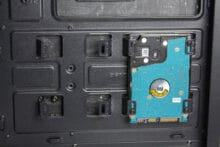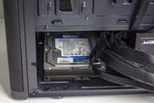 Im Inneren des SilentiumPC Ventum VT2 können insgesamt nur drei Datenträger untergebracht werden. Auf dem Montageplatz im Boden des Gehäuses lassen sich entweder eine 3,5″- oder eine 2,5″-HDD entkoppelt befestigen. Die Montage erfolgt dabei über längliche Schrauben und Gummiringe. Außerdem gibt es hinter dem Mainboard-Tray Raum für zwei weitere 2,5″-Datenträger. Diese werden über normale Schrauben an den entsprechenden Befestigungen verschraubt. Eine Entkopplung gibt es hier aber nicht.