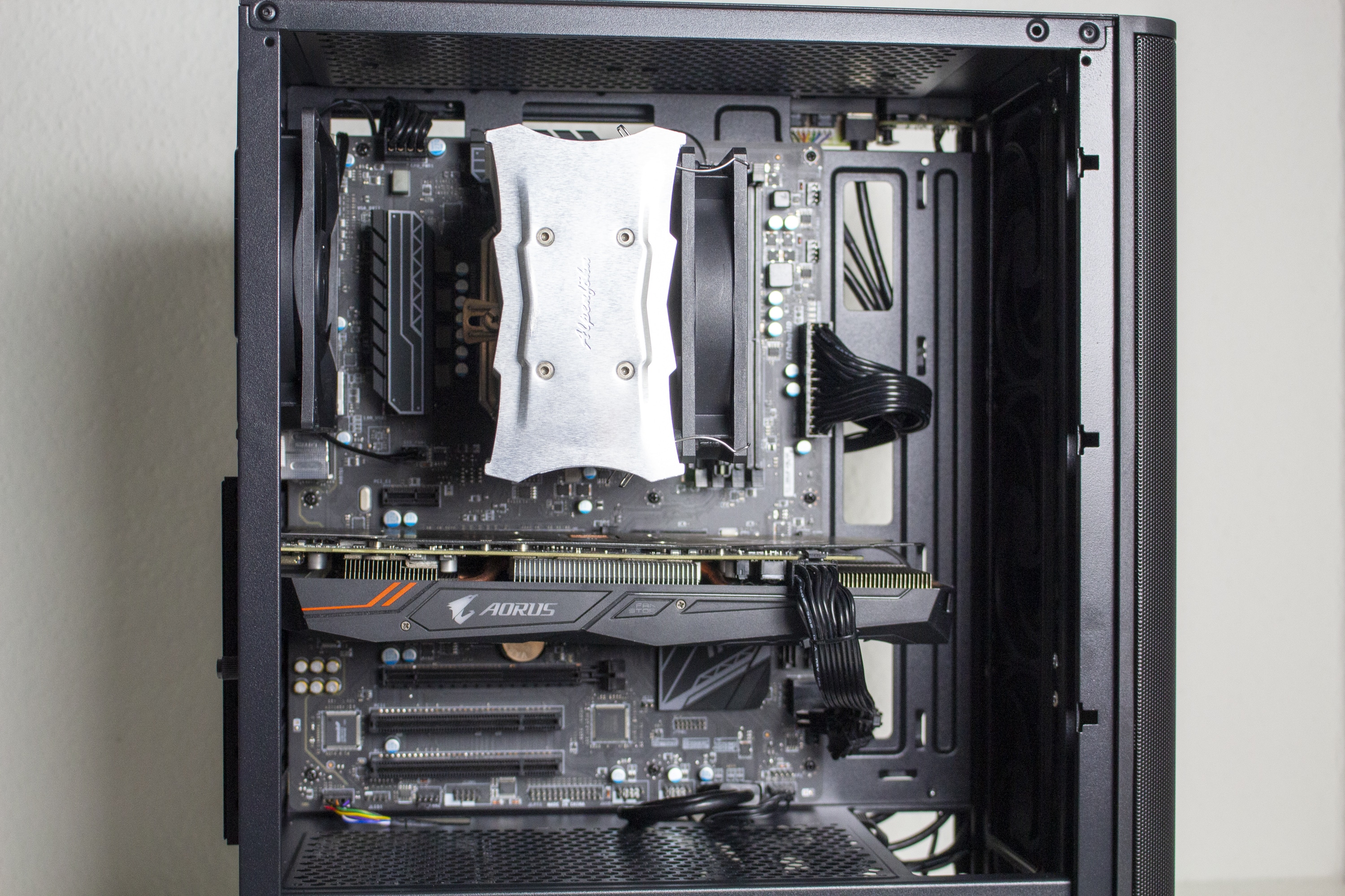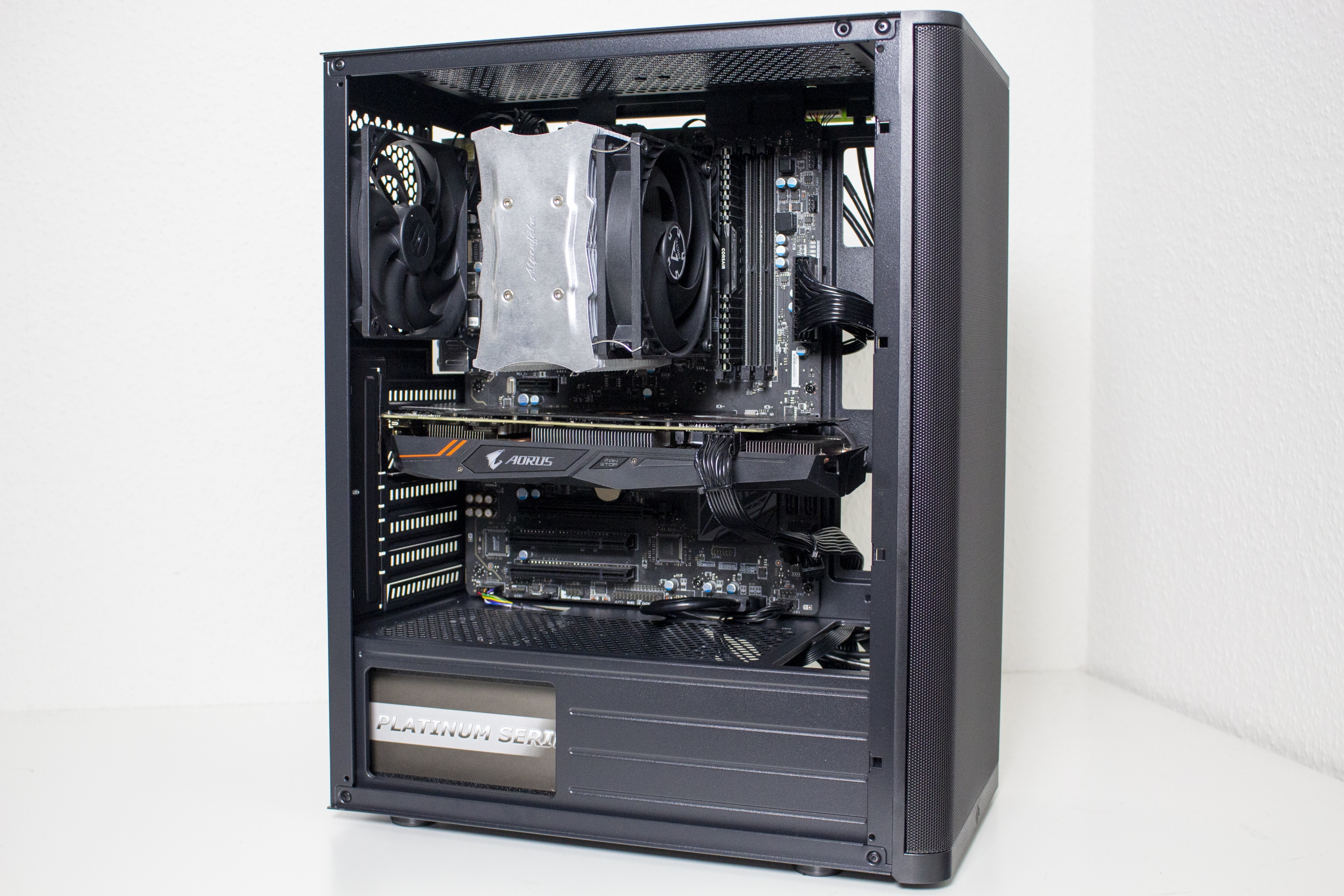 Nun kommen wir zum Systemeinbau. Als Hardware verwenden wir einen AMD Ryzen 5 1400 auf einem MSI B350 PC Mate mit 16GB Crucial Ballistix Sport LT grau DDR4-2666. Der Ryzen wird von einem EKL Alpenföhn Matterhorn Pure gekühlt und ist auf 3,8 GHz (1,25V) übertaktet. Für die Bildausgabe ist eine GTX 1060 6GB von Gigabyte AORUS zuständig. Die Stromversorgung erledigt das vollmodulare LC-Power LC550 V2.31 Platinum mit einem Effizienzgrad von 80 Plus Platinum.