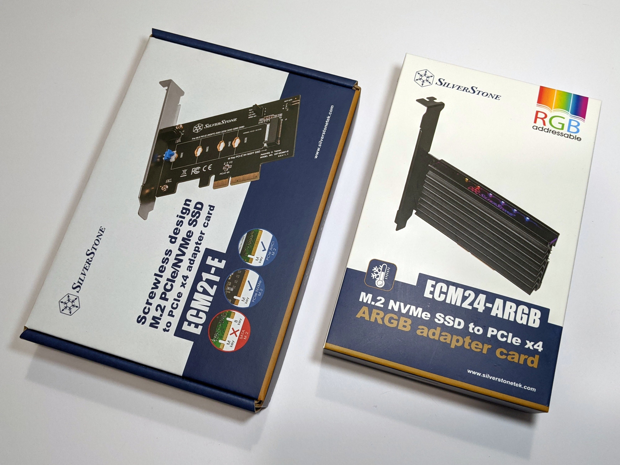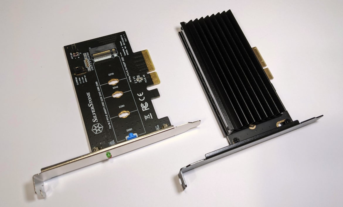 Im Herbst vergangenen Jahres stellte der taiwanesische Hersteller SilverStone, der den meisten wohl durch seine Gehäuse, Kühler und Lüfter bekannt sein wird, zwei SSD-Adapterkarten vor. Mit Hilfe der Adapter kann jeweils eine SSD im M.2-Format genutzt werden. Die SSD wird dabei mittels PCIe angebunden, ihr benötigt einen freien PCIe 3.0 x4- oder alternativ einen freien x16-Slot auf eurem Mainboard. Bei den Adaptern handelt es sich um den eher minimalistischen SST-ECM21-E und den SST-ECM24-ARGB, welcher neben dem M.2-Steckplatz selbst noch einen Kühlkörper und ARGB-Beleuchtung bietet.