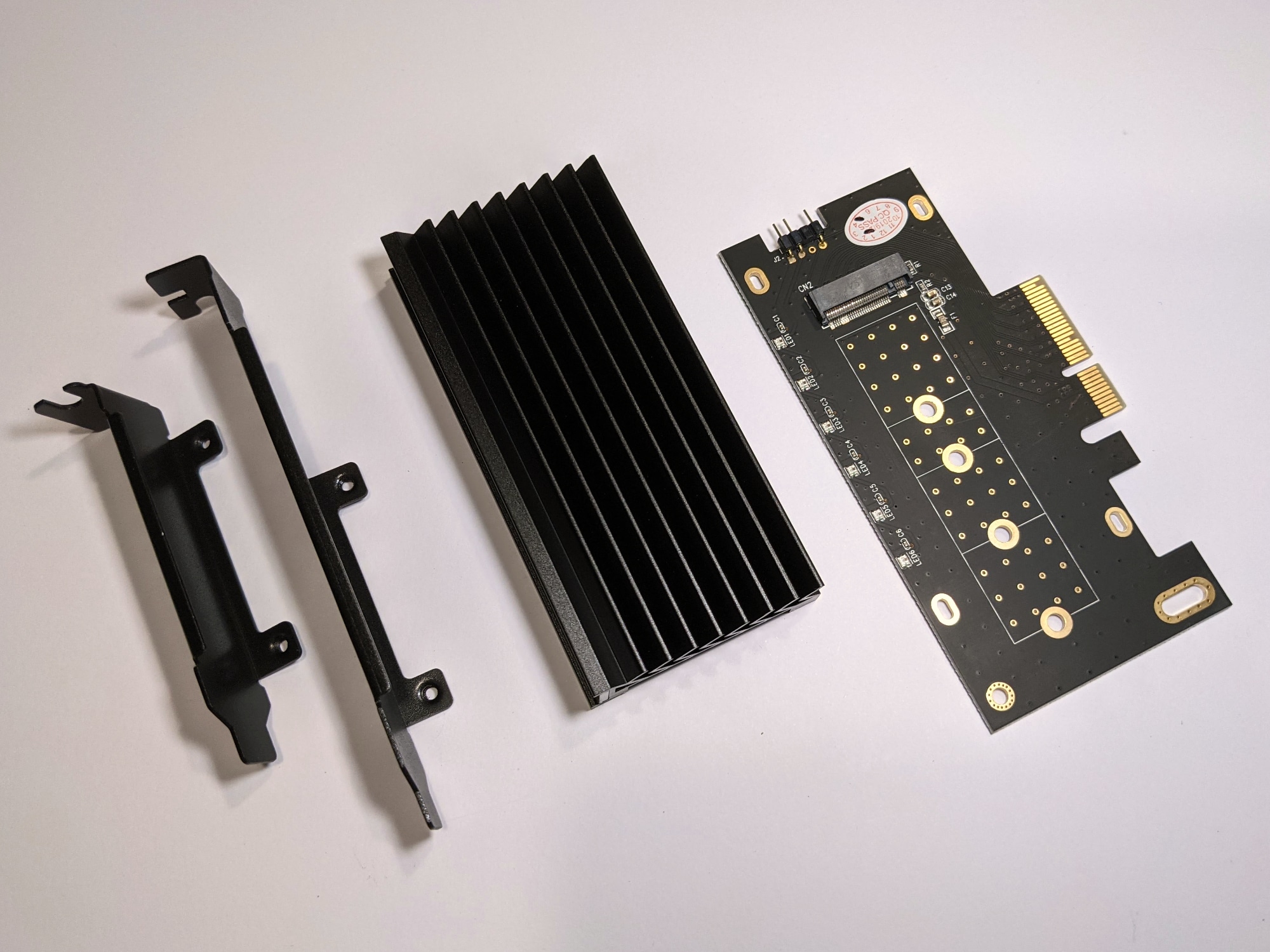 Das PCB ist schwarz, es können M.2-SSDs in vier Längen, bis hin zu maximal 80 mm, montiert werden. Für das gängige M.2-2280-Format ist bereits alles vorbereitet. Falls man kürzere SSDs verwenden möchte, kann man die Halterung natürlich auch an einer anderen Stelle einsetzen. Alternativ können auch die beiliegenden Schrauben zur Montage verwendet werden.