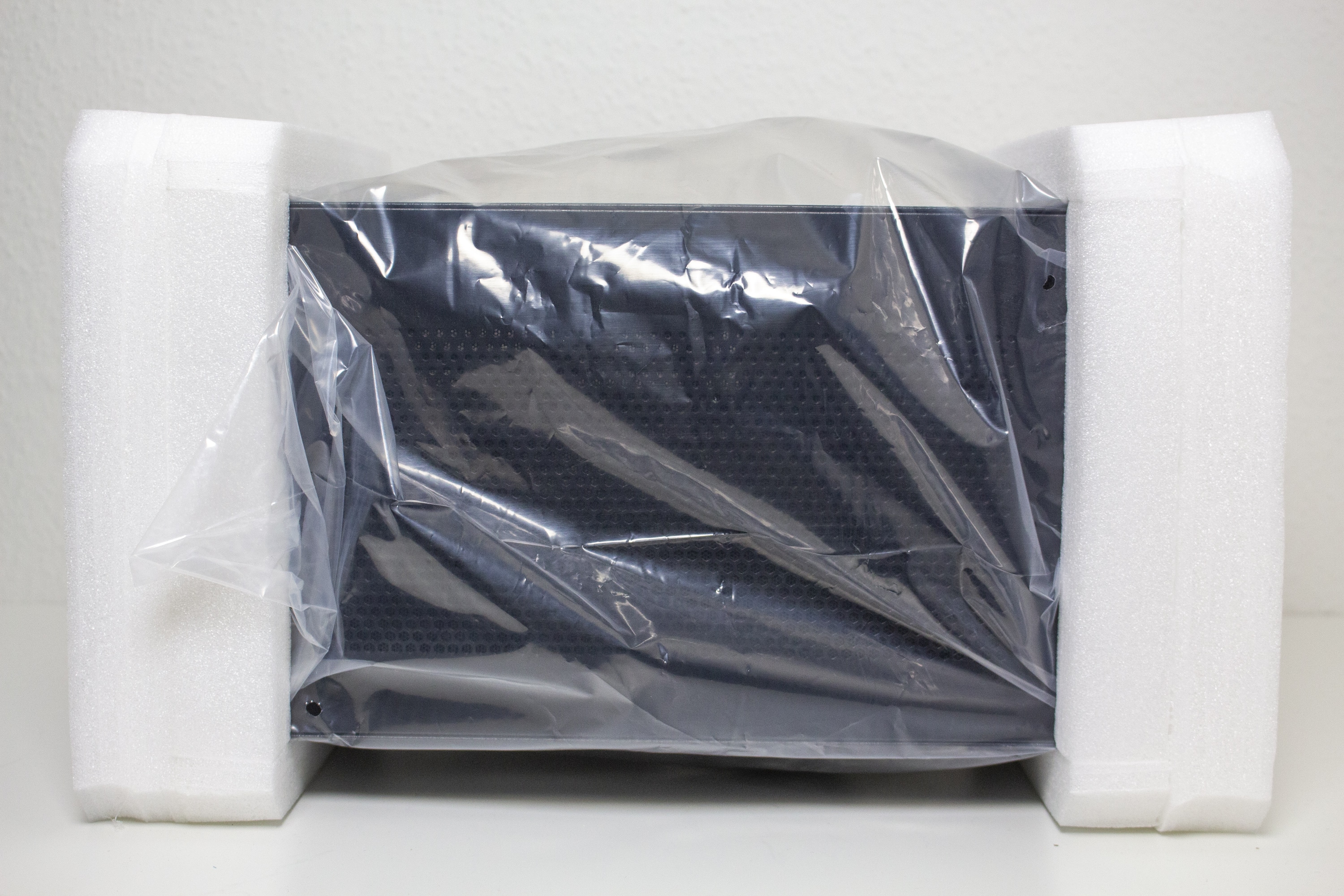 Verpackt wurde das Silverstone Sugo 14 in einen schlichten braunen Karton, auf dem mit schwarzer Schrift ein Produktbild, technische Daten und die wichtigsten Features aufgedruckt sind. Im Inneren des Kartons ist das Gehäuse von einem weichen Schaumstoff und einer Folie umhüllt. Gerade der weiche Schaumstoff dürfte Stürze gut abfangen und somit starke Beschädigungen beim Transport verhindern. Das mitgelieferte Zubehör befindet sich nicht, wie sonst üblich, innerhalb des Gehäuses, sondern wurde in eine der Schaumstoffformen gelegt. In den zwei Beuteln befinden sich alle wichtigen Schrauben, ein paar schwarze Kabelbinder und eine Zierblende für den 5,25″-Schacht. Außerdem gehören zum Lieferumfang der vorinstallierte Gehäuselüfter (120mm), diverse magnetische Staubfiltermatten und acht Gummifüße zum Ankleben. Eine Montageanleitung liegt nicht bei, kann aber über die Homepage heruntergeladen werden.