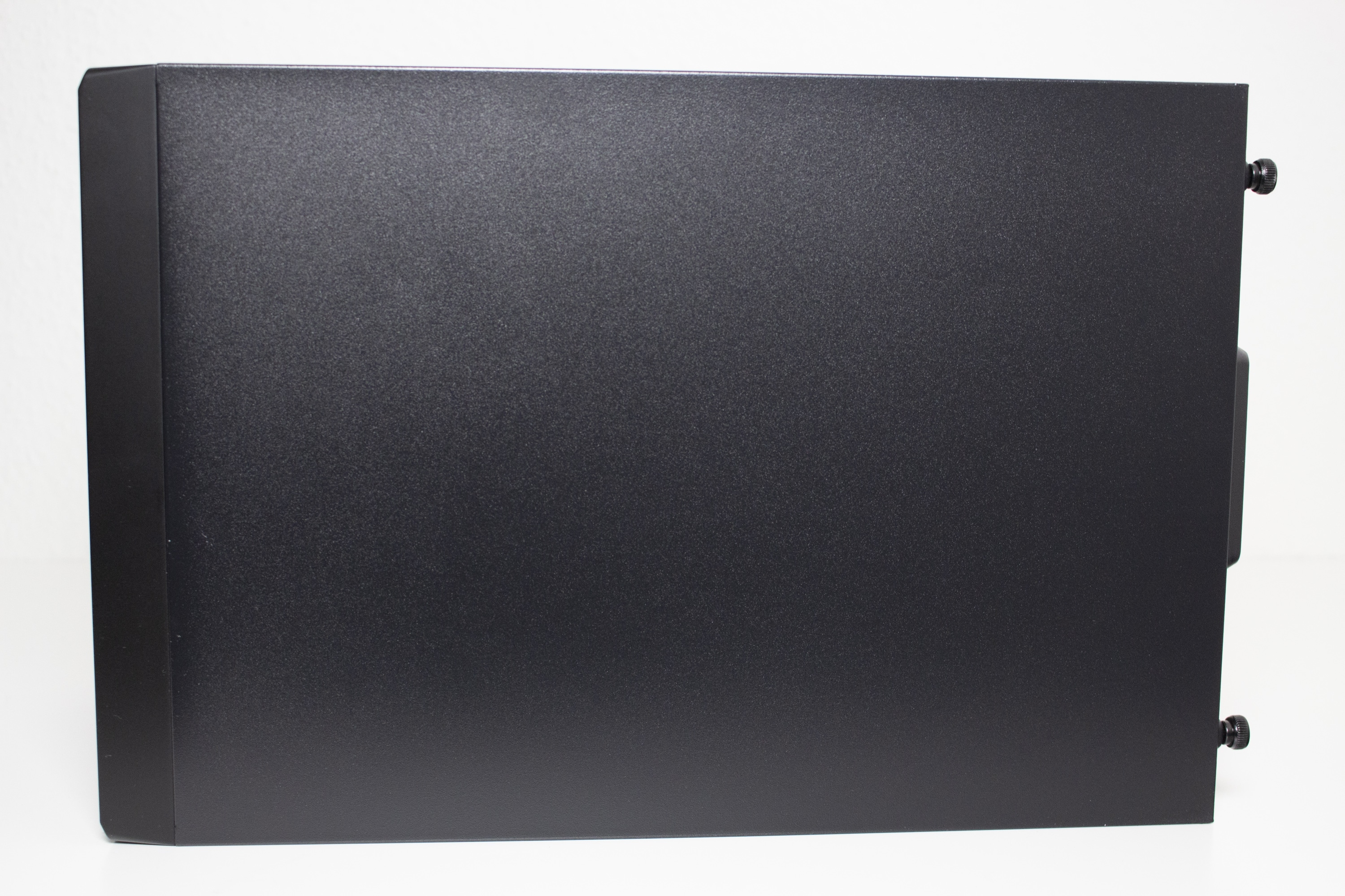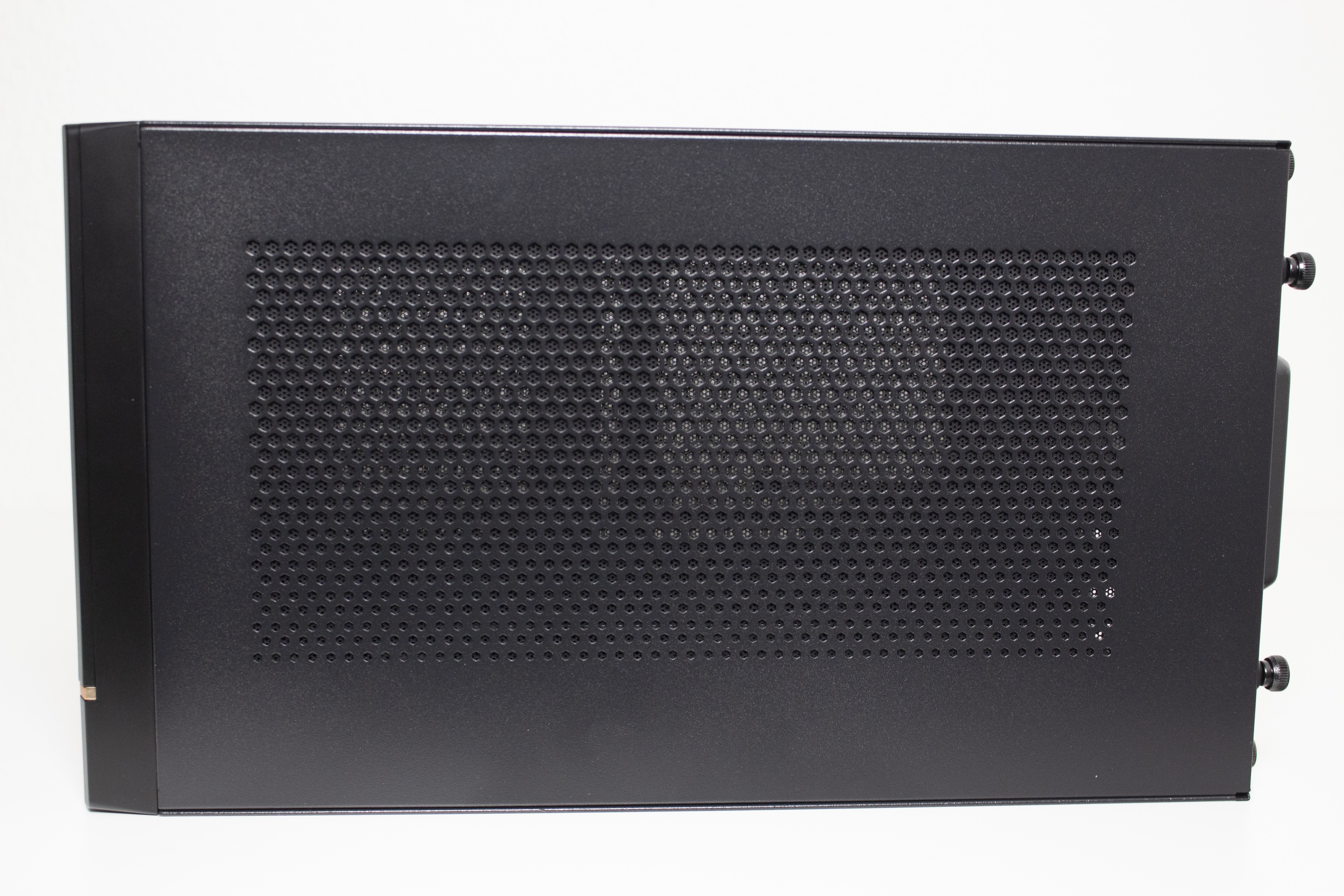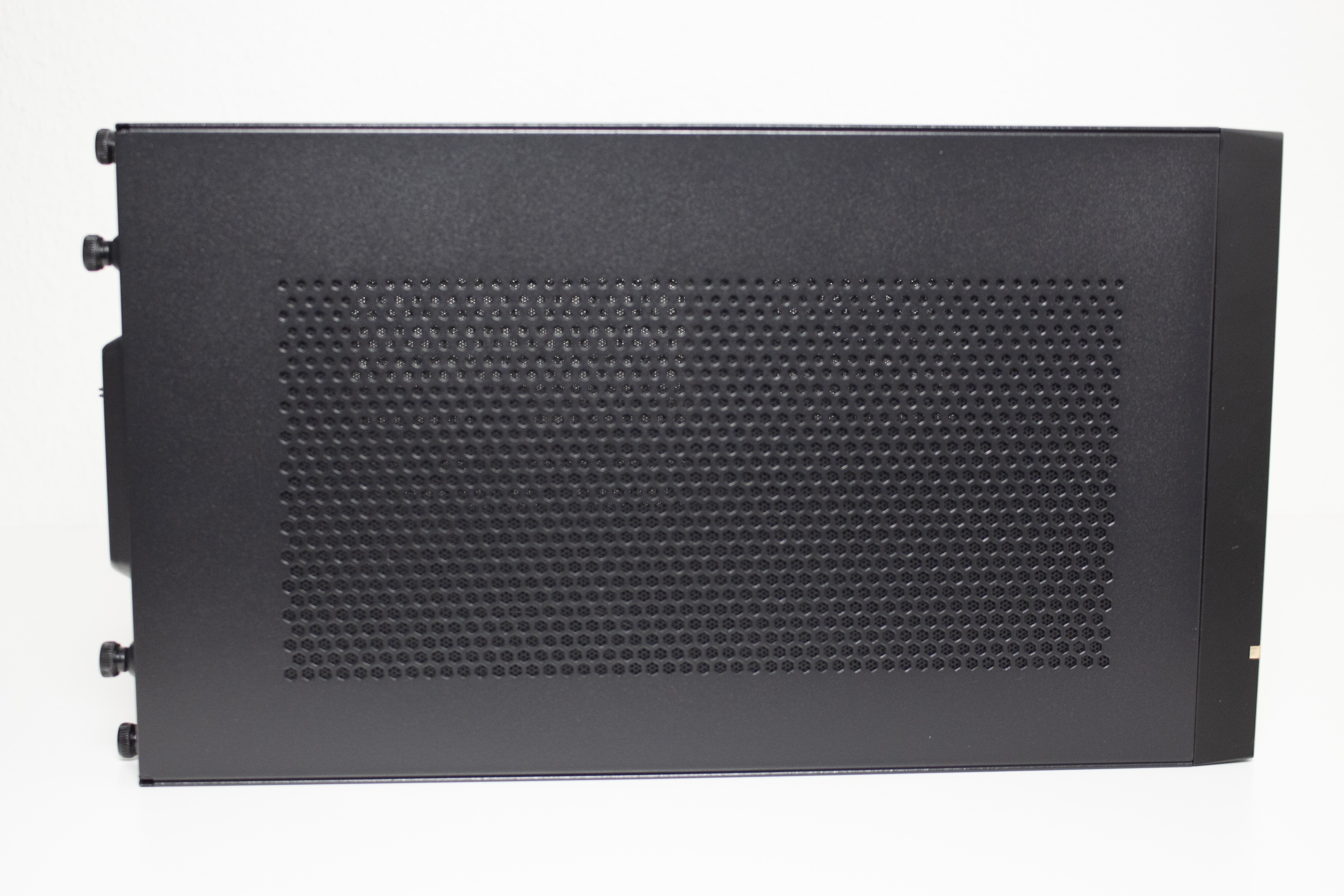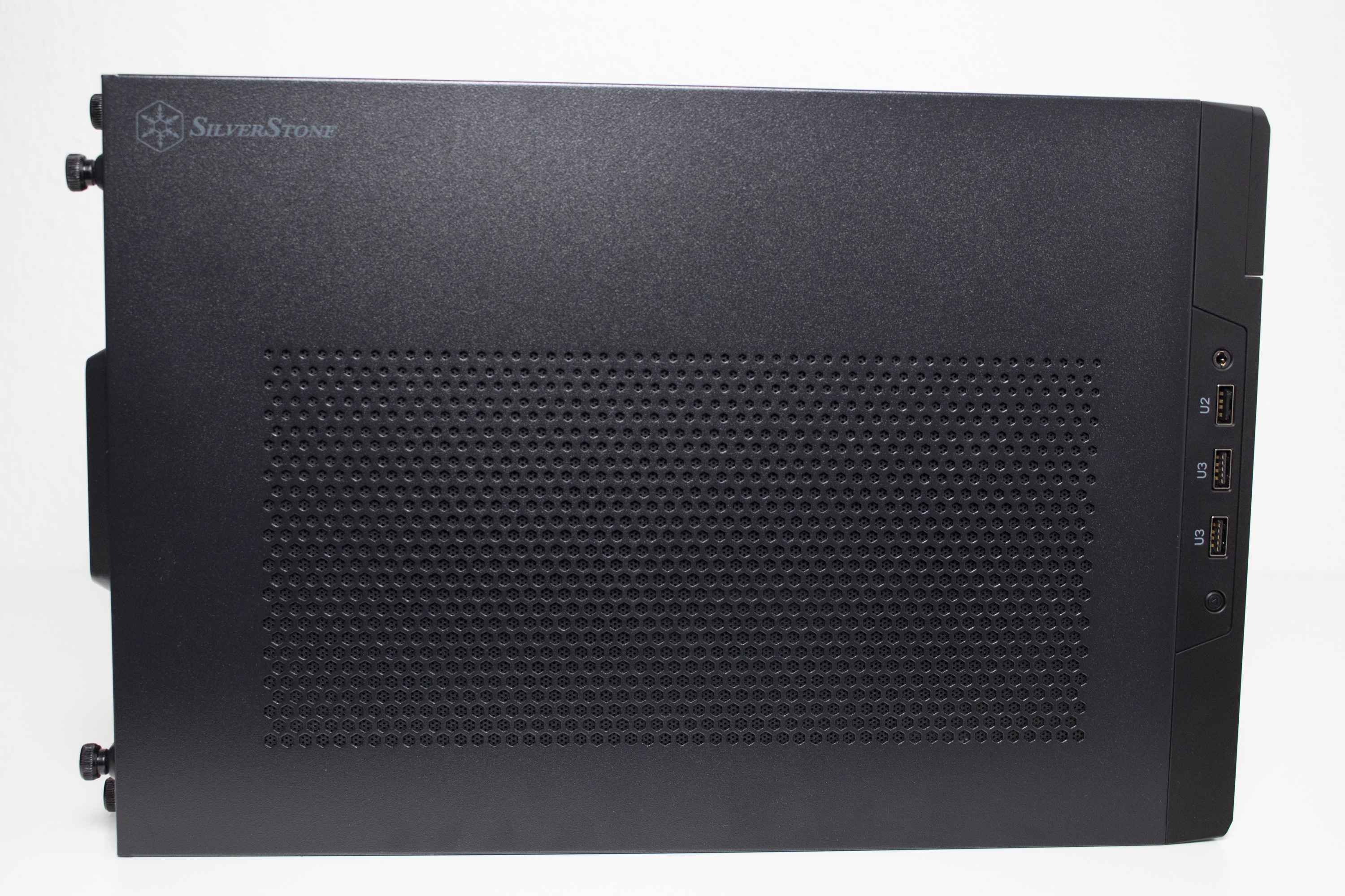 Ab Werk hat das Sugo 14 keine Standardorientierung und kann nach belieben ausgerichtet werden. Durch seine Quaderform sind zwei der vier Seitenteile jeweils identisch und können untereinander getauscht werden, wenn der Hersteller-Schriftzug nicht die richtige Orientierung hat. An dieser Stelle sei aber zu erwähnen, dass nur drei der vier Panels mit Belüftungsöffnungen ausgestattet wurden. Die Befestigung am Korpus erfolgt über das bekannte Schienensystem und mit jeweils zwei Rändelschrauben pro Panel. Die Rändelschrauben verbleiben nach der Demontage am Seitenteil und gehen somit nicht verloren. Die Stabilität der Elemente ist in Ordnung.