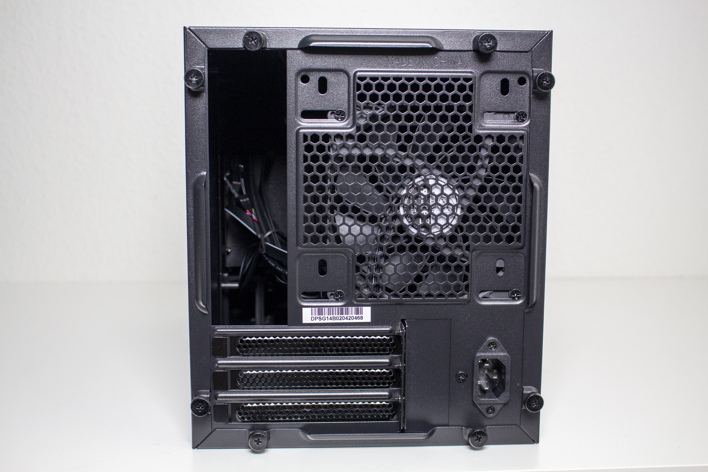 Auch die Rückseite des Silverstone Sugo 14 hat für ein ITX-Gehäuse einiges zu bieten. So finden man hier einen Platz für einen 140-Millimeter-Lüfter, der ab Werk aber nur mit einem 120-Millimeter-Exemplar bestückt wurde, und insgesamt drei Slots für Erweiterungskarten. Die entsprechenden Blenden sind wiederverwendbar und perforiert. Damit sollten auch besonders große High-End-Karten in das Sugo 14 passen.