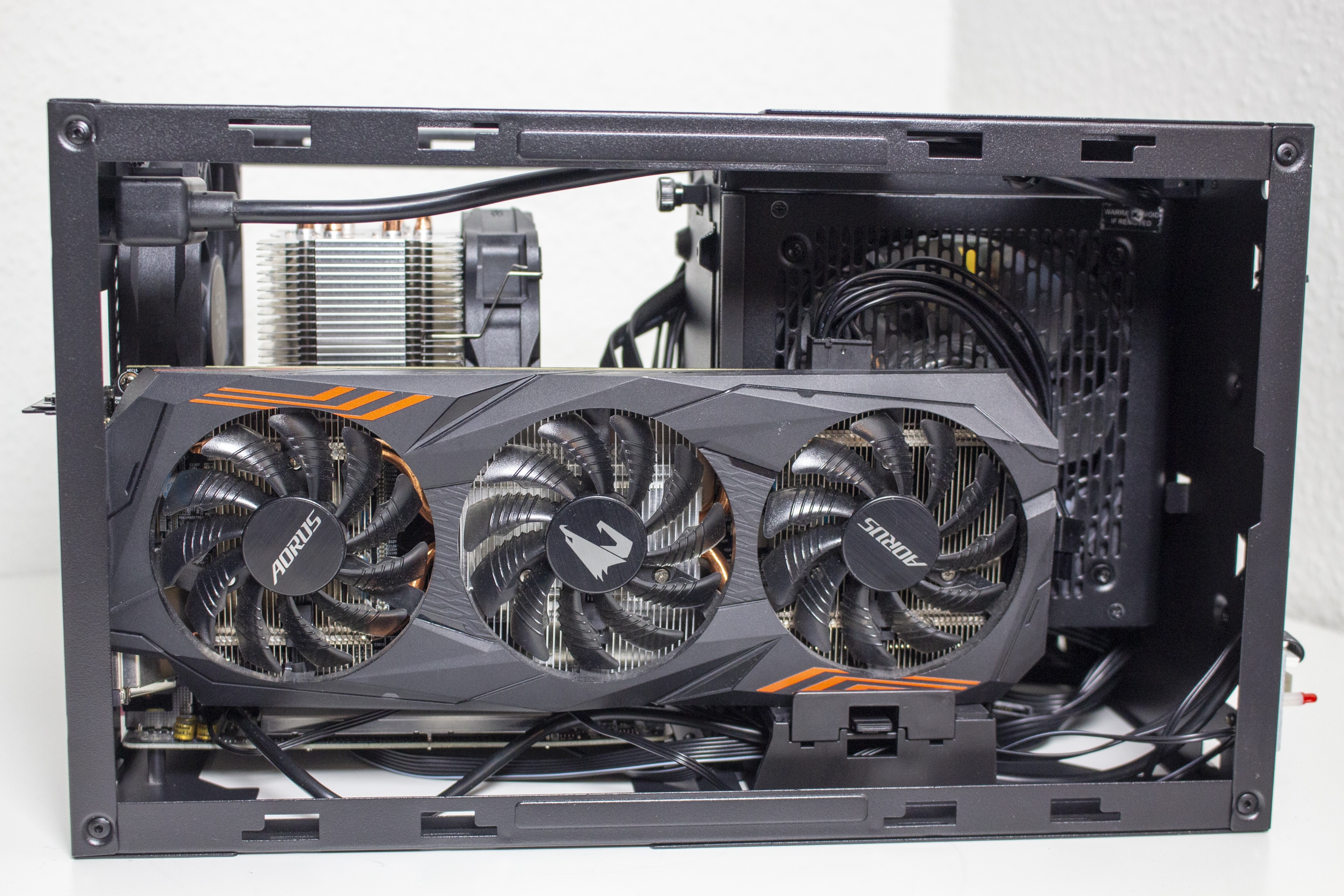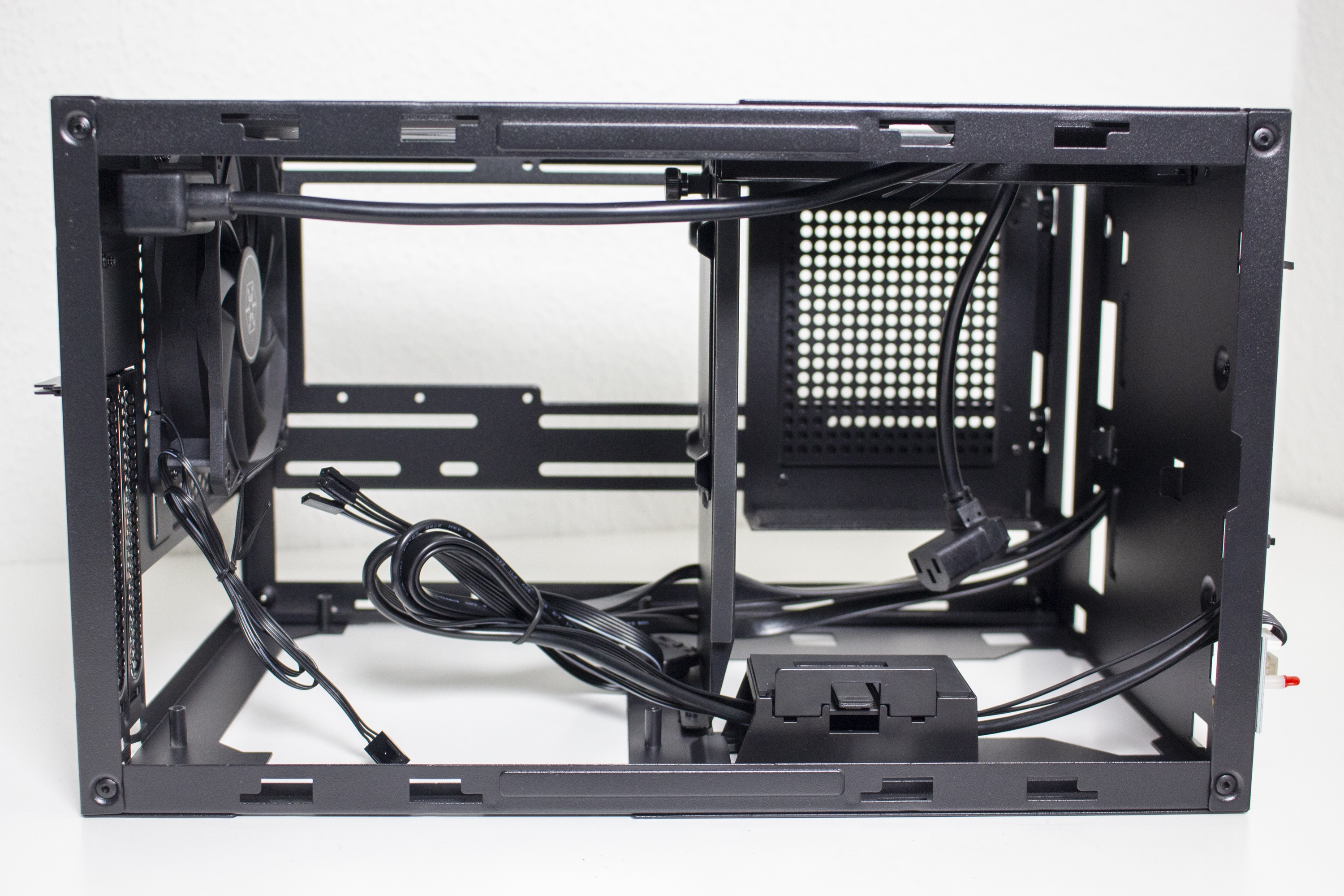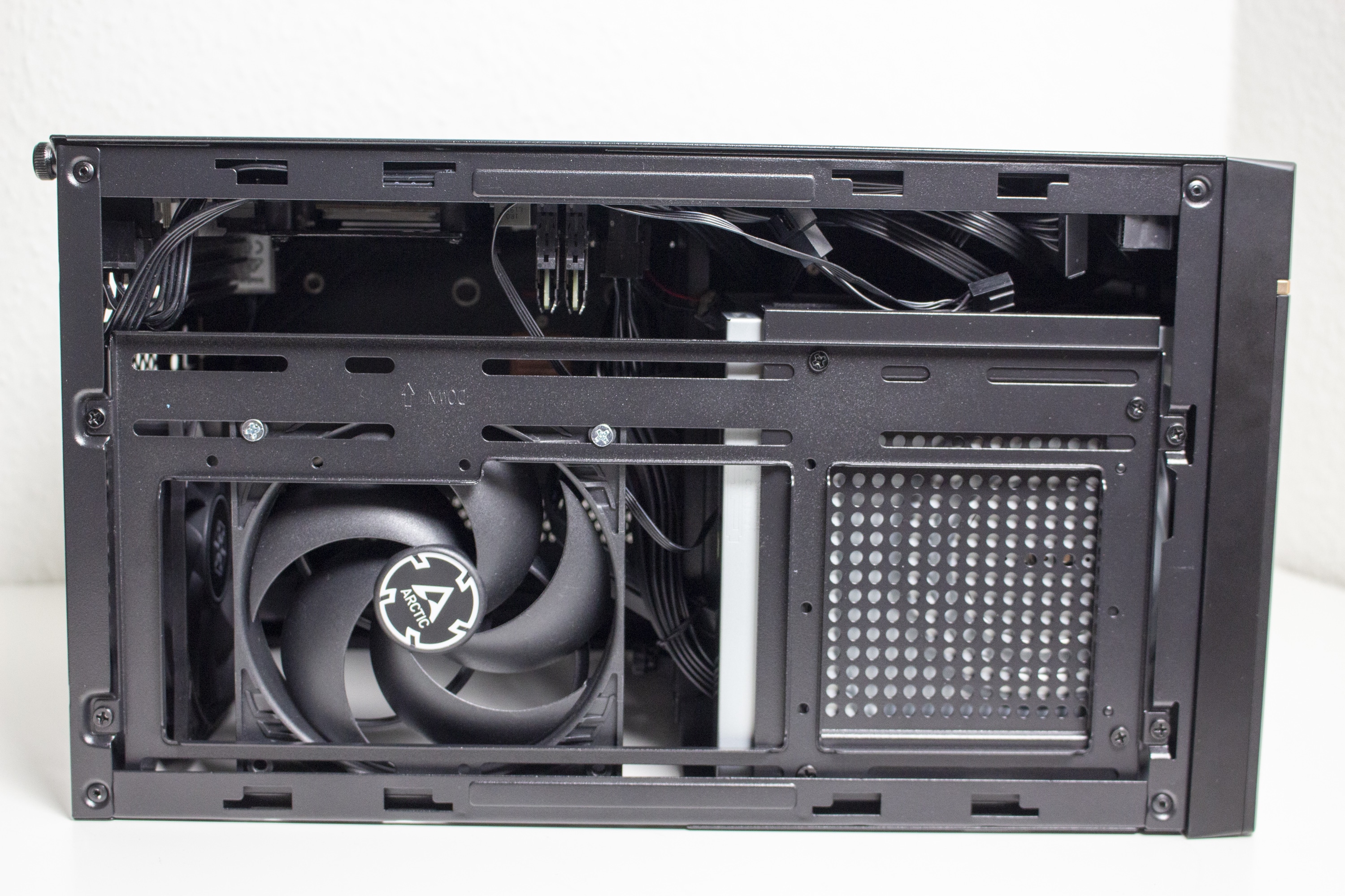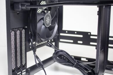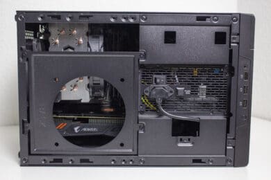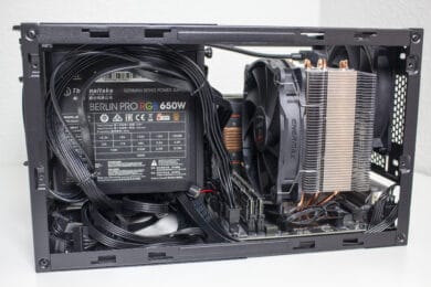 Die Verkabelung des Systems war dann aber etwas aufwendiger. Das Gehäuse bietet zwar Platz für ein 150 Millimeter lange ATX-Netzteil, es gibt aber nicht ganz so viel Raum um die Kabel sicher und möglichst unsichtbar zu verstauen. Zudem sind die Kabel von ATX-Netzteilen meistens länger als notwendig. Das Gesamtergebnis wirkt zwar OK, einen Schönheitspreis kann man damit aber nicht gewinnen. Wir empfehlen definitiv ein vollmodulares Netzteil mit kurzen Kabeln oder die Verwendung eines SFX-Netzteil mit ATX-Blende. Eine solche Blende liegt dem Gehäuse aber leider nicht bei.