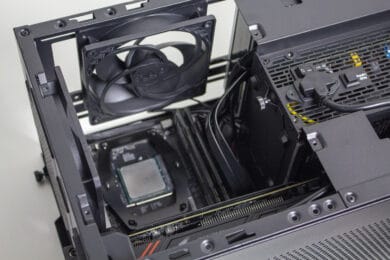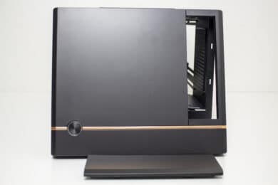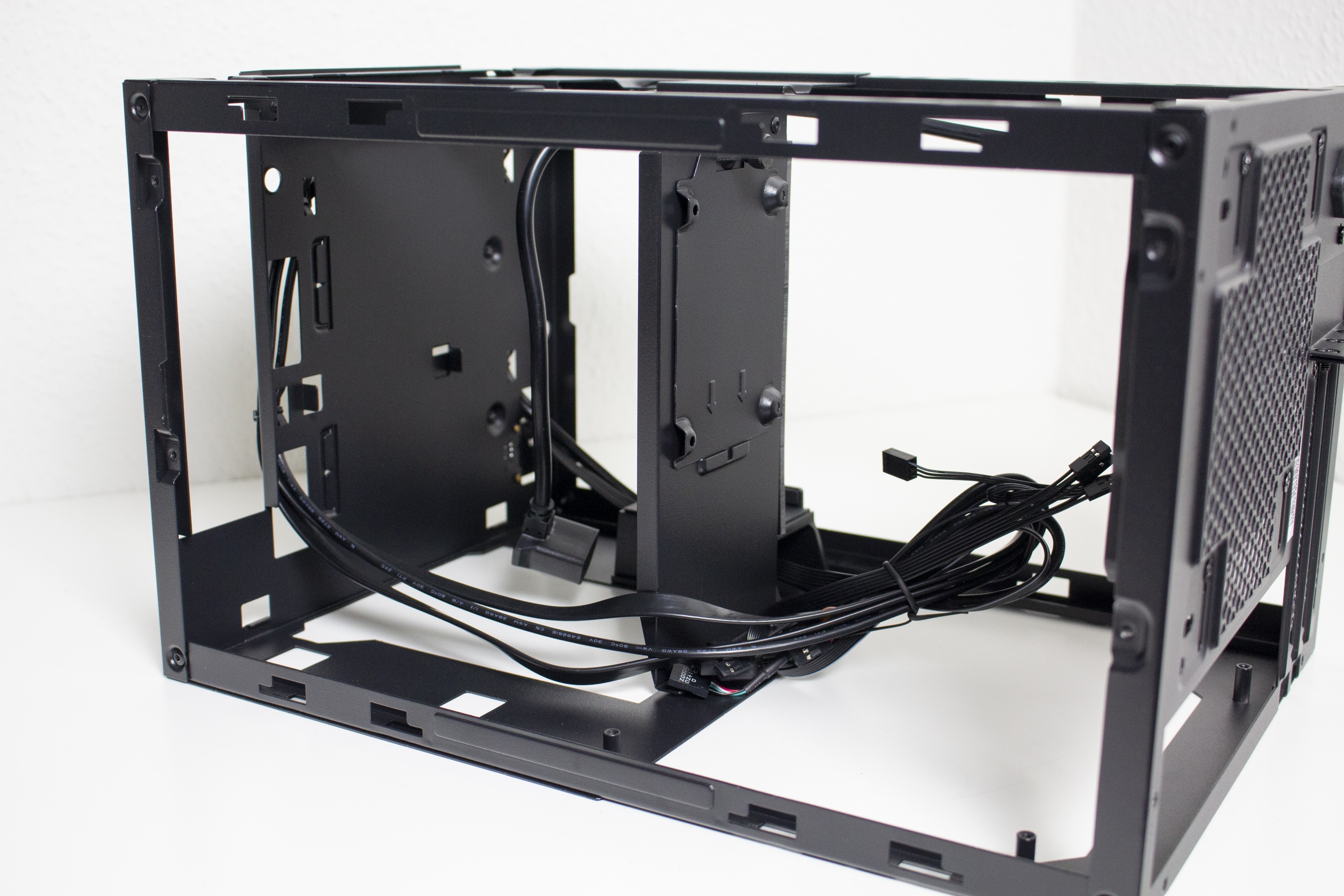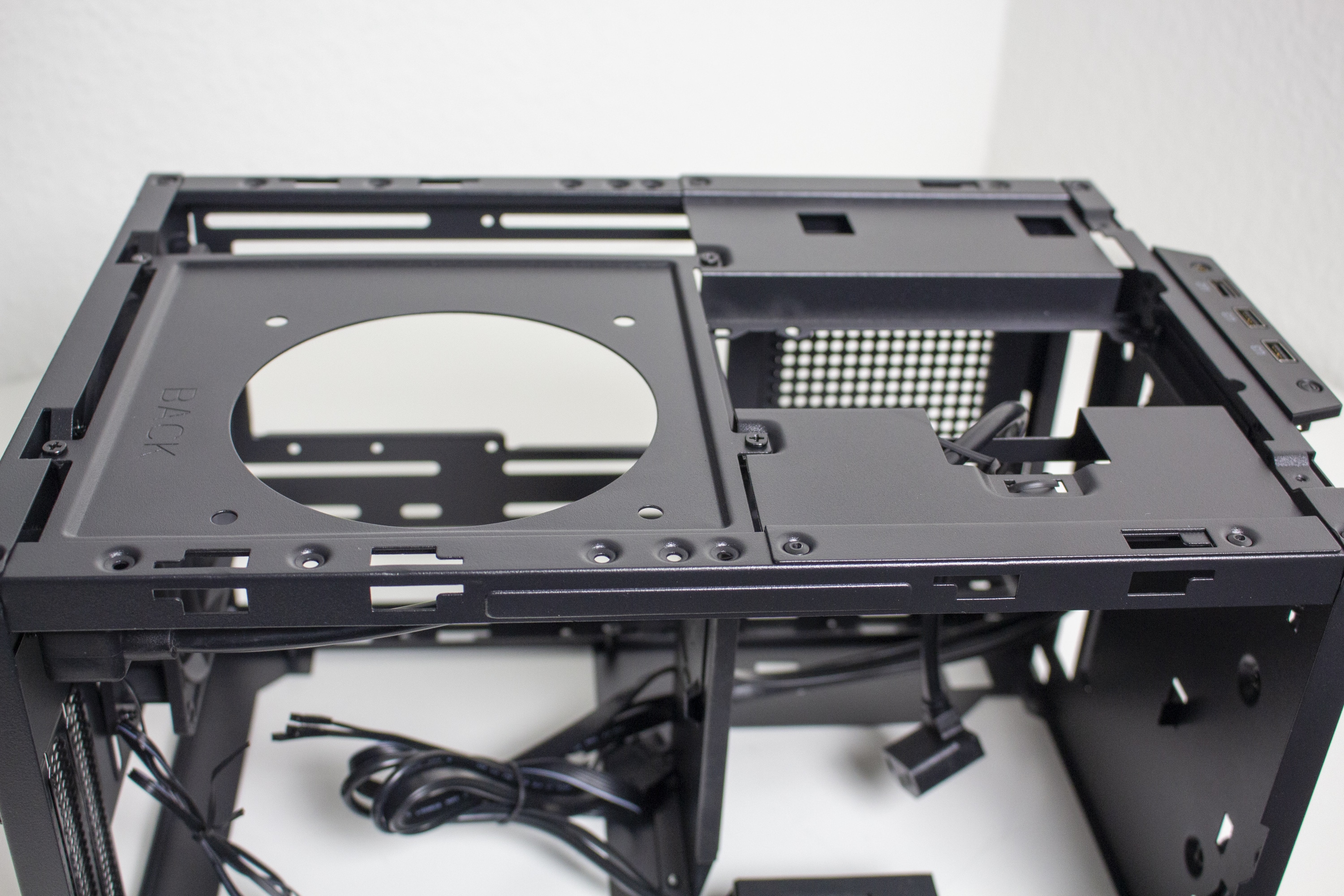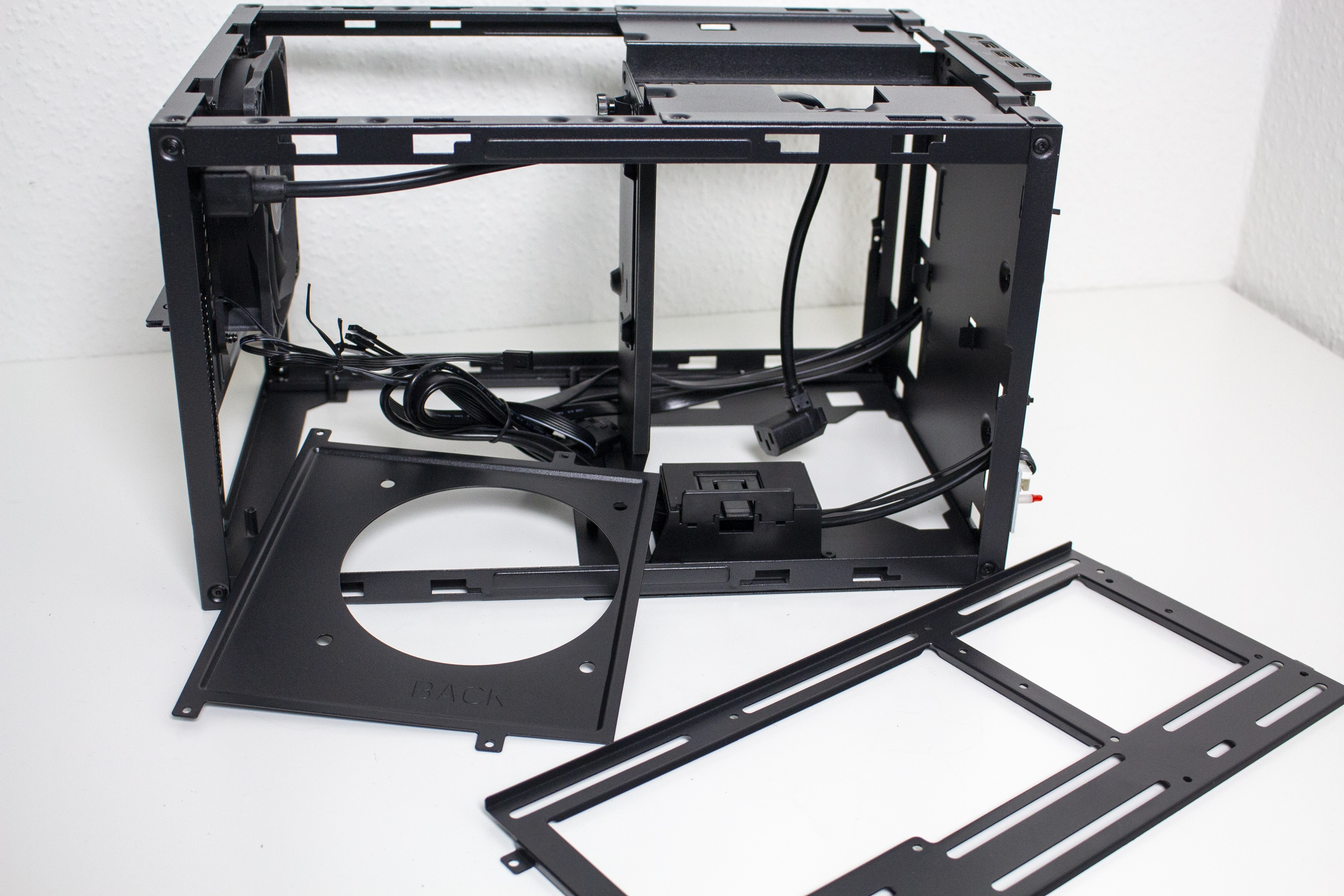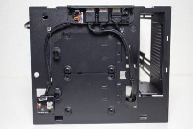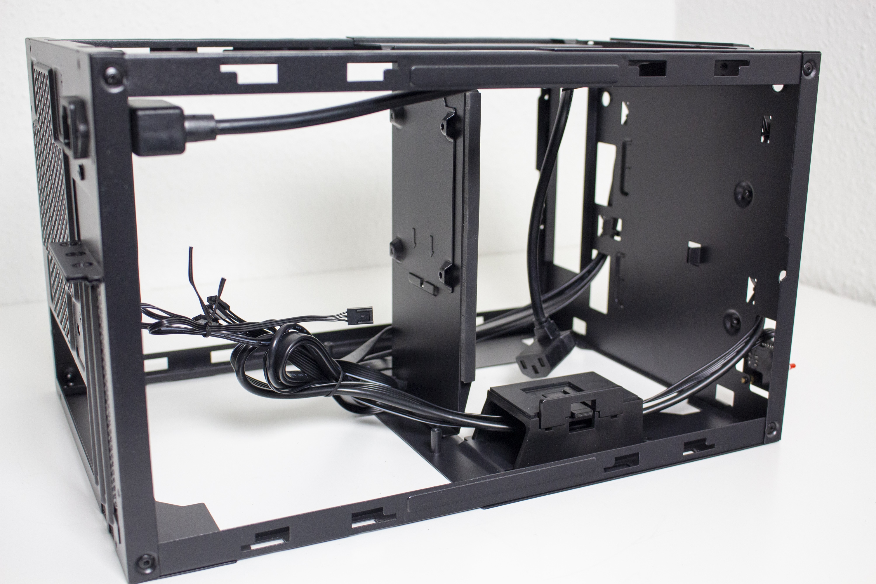 Die Verkabelung des Systems war dann aber etwas aufwendiger. Das Gehäuse bietet zwar Platz für ein 150 Millimeter lange ATX-Netzteil, es gibt aber nicht ganz so viel Raum um die Kabel sicher und möglichst unsichtbar zu verstauen. Zudem sind die Kabel von ATX-Netzteilen meistens länger als notwendig. Das Gesamtergebnis wirkt zwar OK, einen Schönheitspreis kann man damit aber nicht gewinnen. Wir empfehlen definitiv ein vollmodulares Netzteil mit kurzen Kabeln oder die Verwendung eines SFX-Netzteil mit ATX-Blende. Eine solche Blende liegt dem Gehäuse aber leider nicht bei.