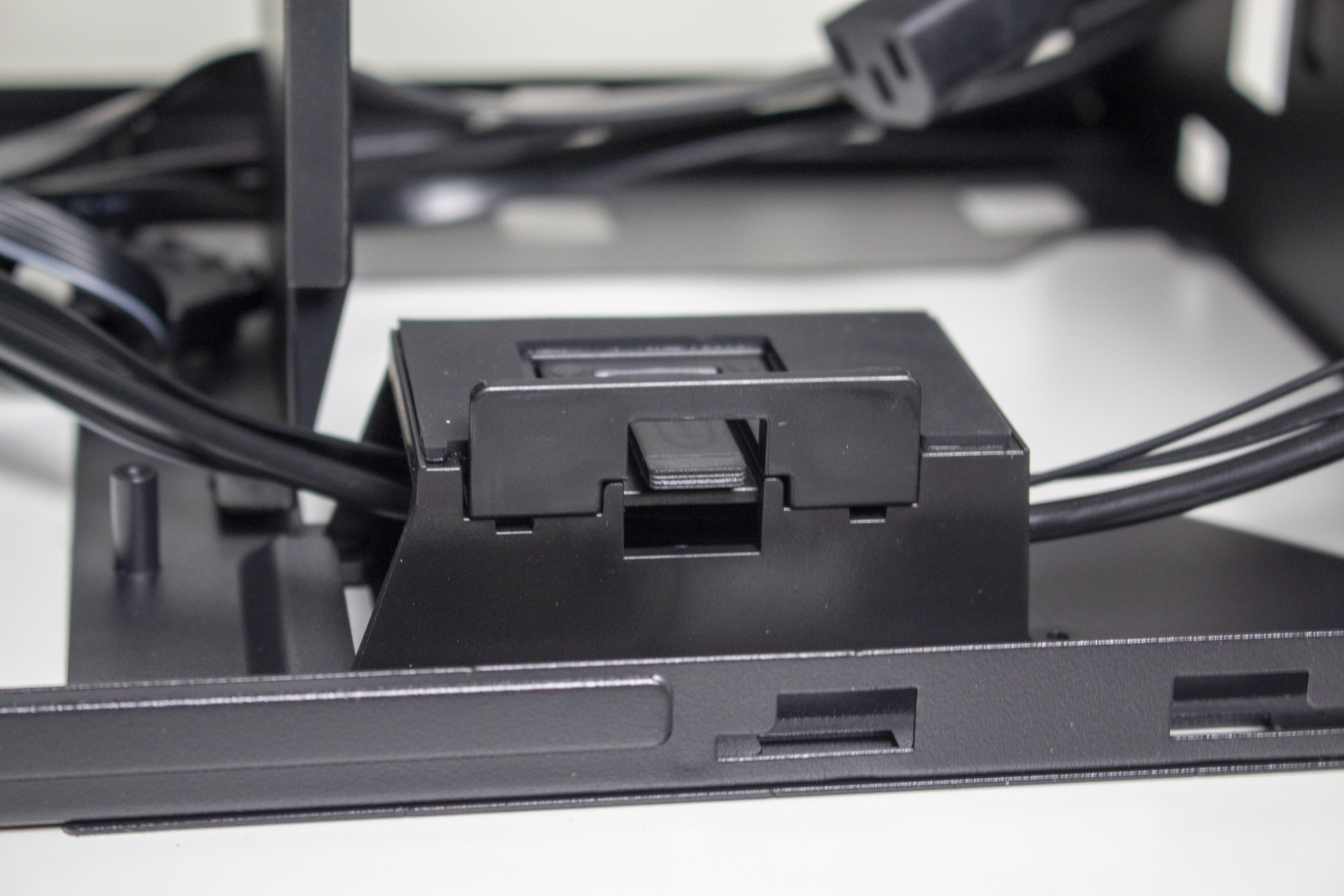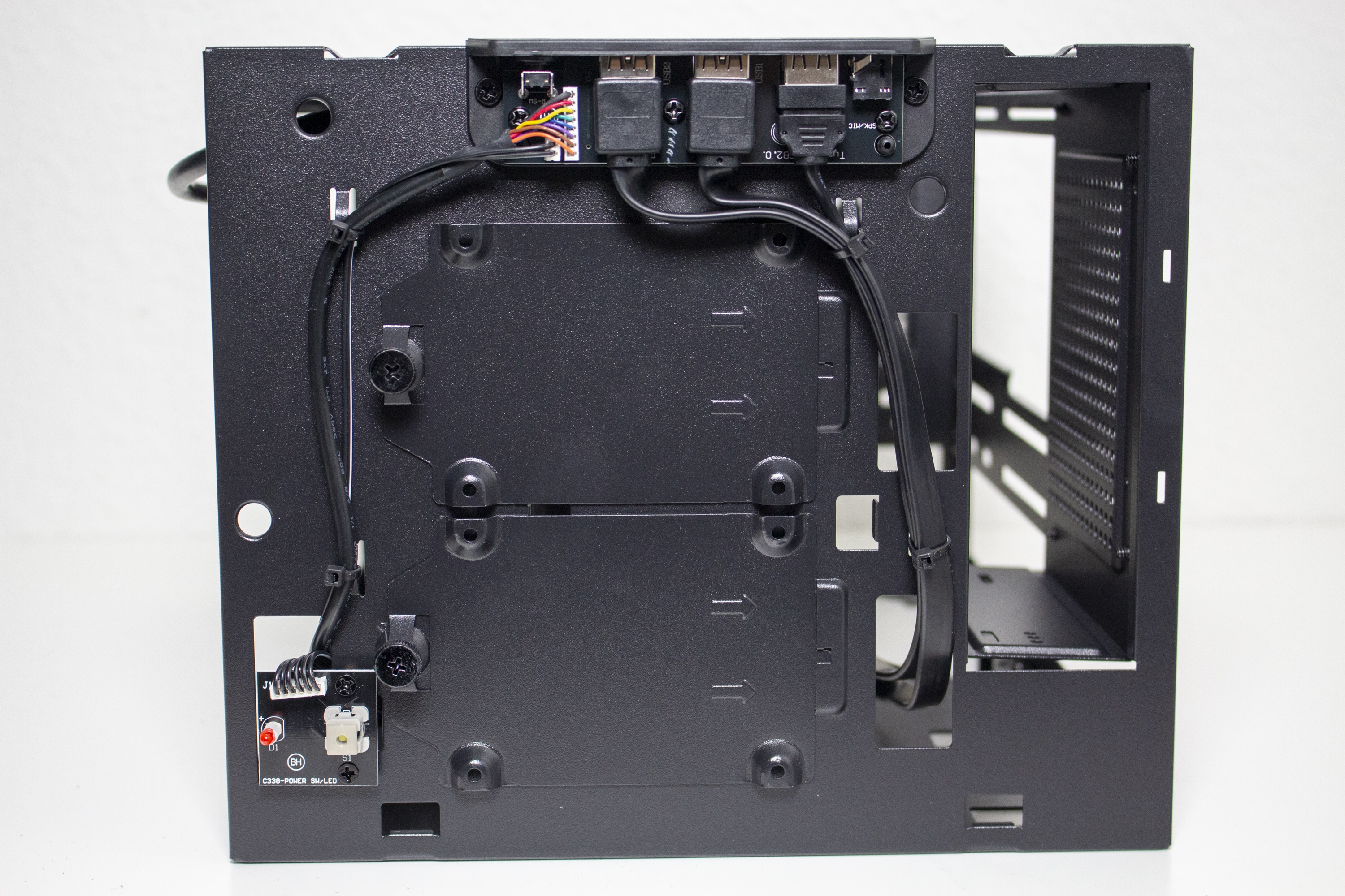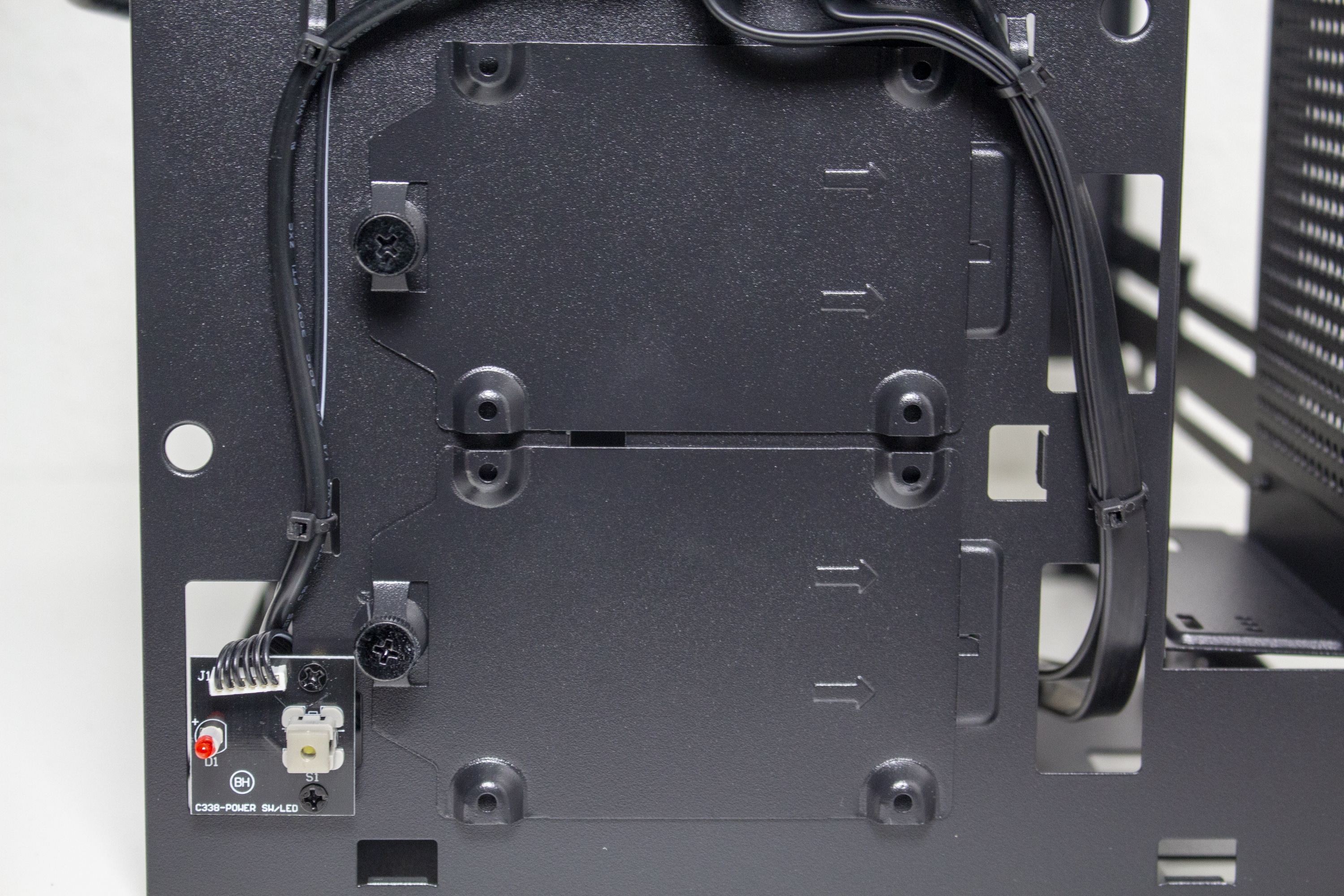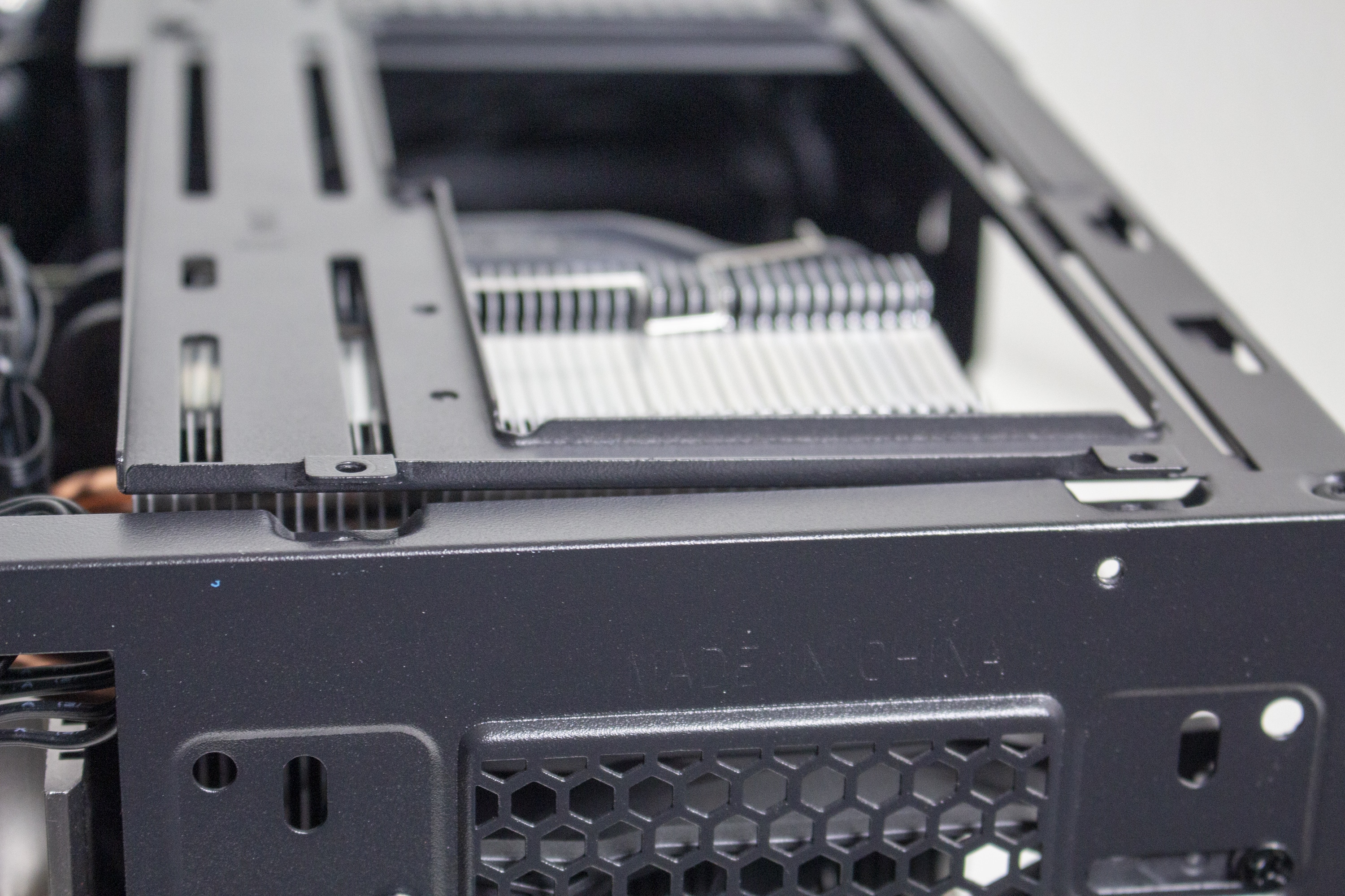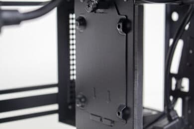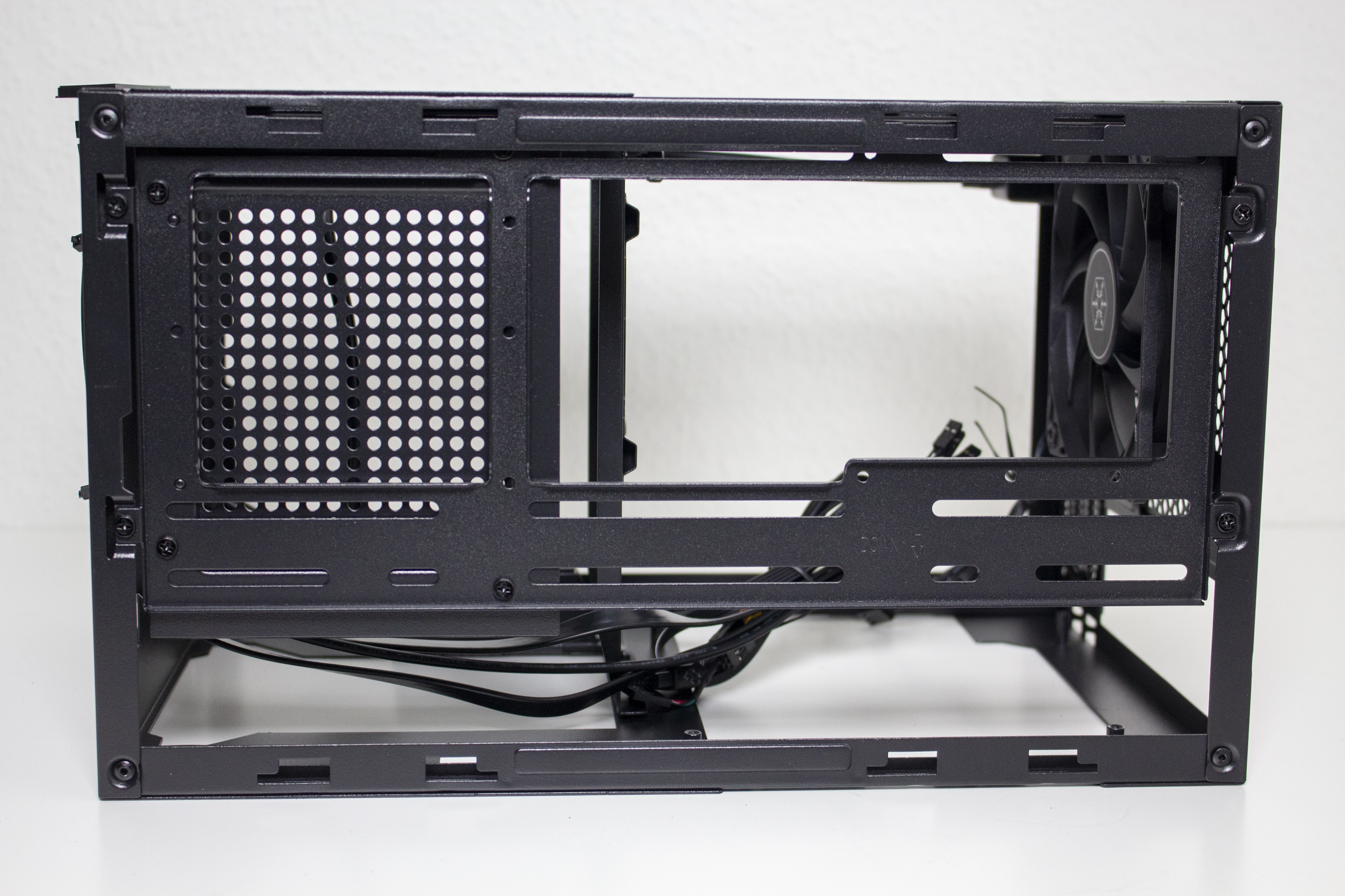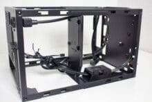 Auf der rechten Seite bietet das Sugo 14 einen multifunktionalen Stahlrahmen der mit einem Schienensystem ausgestattet wurde. Dieses System ermöglicht die Montage von verschiedenen Komponenten. Ab Werk ist der Rahmen zu Montage eines externen 5,25″-Laufwerks befestigt. Alternativ können an diesem Stahlrahmen aber auch ein 240er-Radiator oder zwei 3,5″-HDDs angebracht werden. Eine gleichzeitige Montage des 240er-Radiators und der 3,5″-Festplatten ist aber nicht möglich. Auch auf das externe 5,25″-Laufwerk müsste man in diesem Fall verzichten.