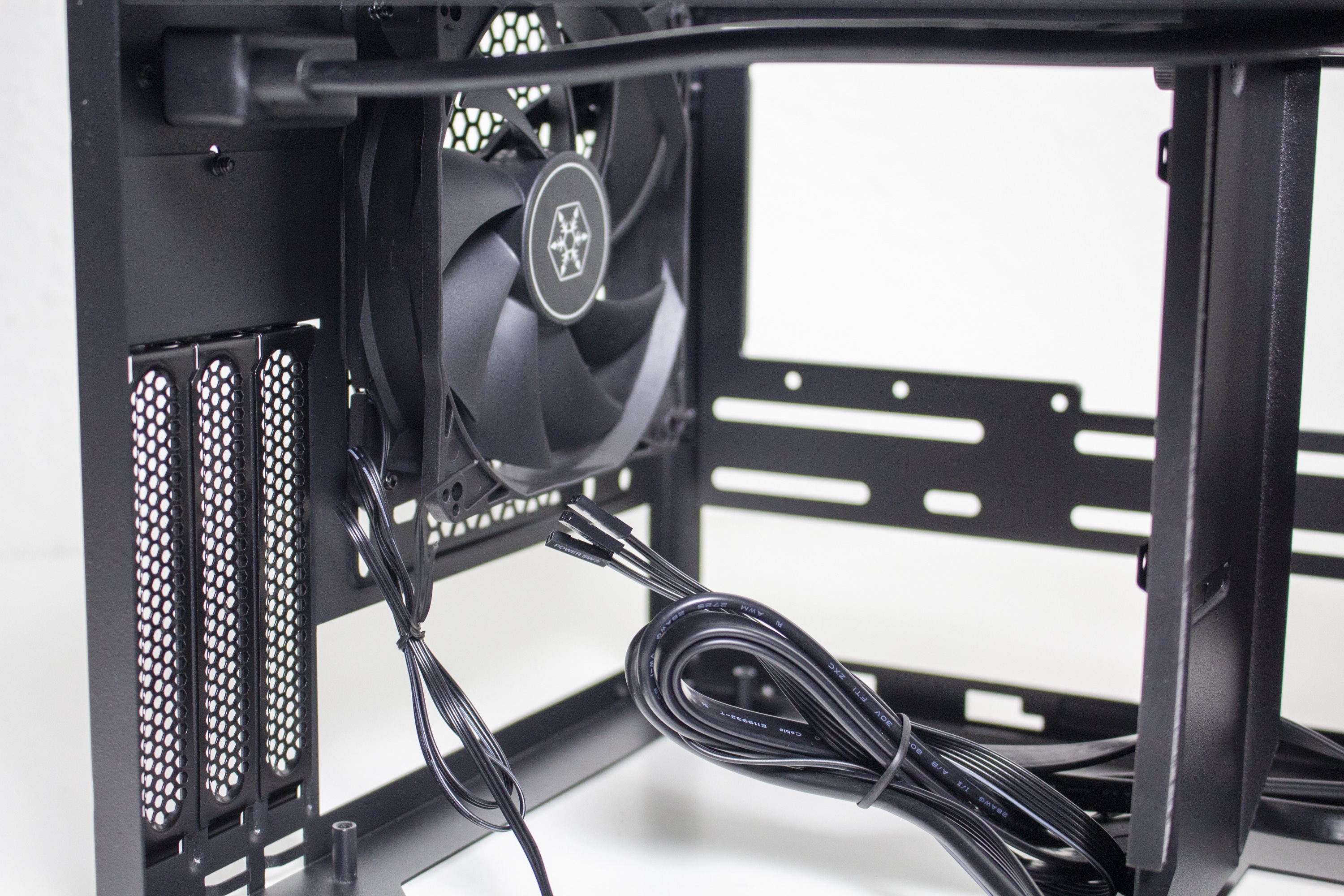 Der verbaute Lüfter ist von Silverstone und trägt die kryptische Bezeichnung CC12025M12S. Er hat eine Rahmenbreite von 120 Millimetern, dreht mit 1200 Umdrehungen pro Minute und wird über einen normalen 3-Pin-Stecker mit dem Mainboard verbunden. Bei voller Drehzahl ist der Lüfter hörbar aber nicht störend, erzeugt aber wahrnehmbare Lauf- bzw. Lagergeräusche.