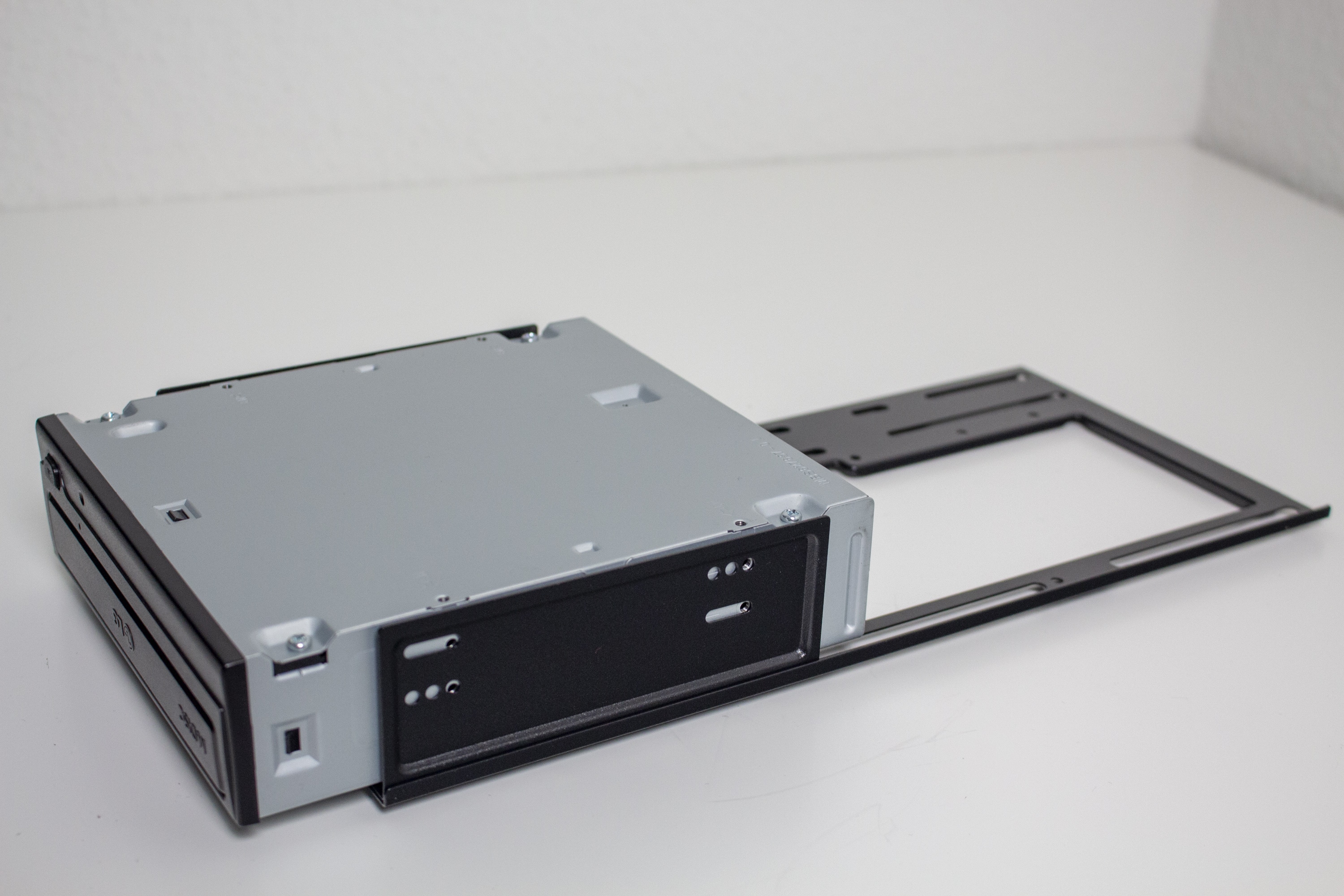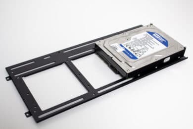 In Bezug auf die Datenträgerkompatibilität hat das Sugo 14 insgesamt Platz für fünf interne HDDs (3x 2,5″, 2x 3,5″) und ein externes 5,25″-Laufwerk. Je nach verbauter Hardware können aber nicht alle Plätze gleichzeitig belegt werden. Für 2,5″-Datenträger kommen einfache Schlitten aus Stahl und mit einer Rändelschraube zum Einsatz. Ein solcher Schlitten kann am Steg zwischen Mainboard und Netzteil angebracht werden. Die beiden anderen verstecken sich hingegen hinter der Frontblende. In allen Fällen erfolgt die Befestigung über vier normale Schrauben.
