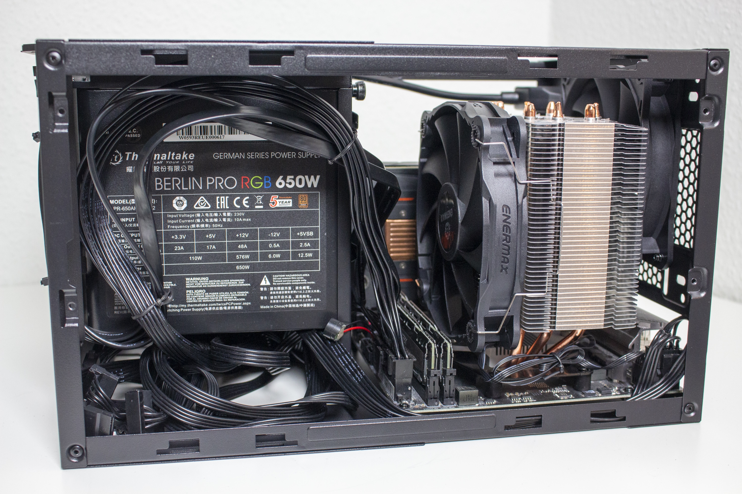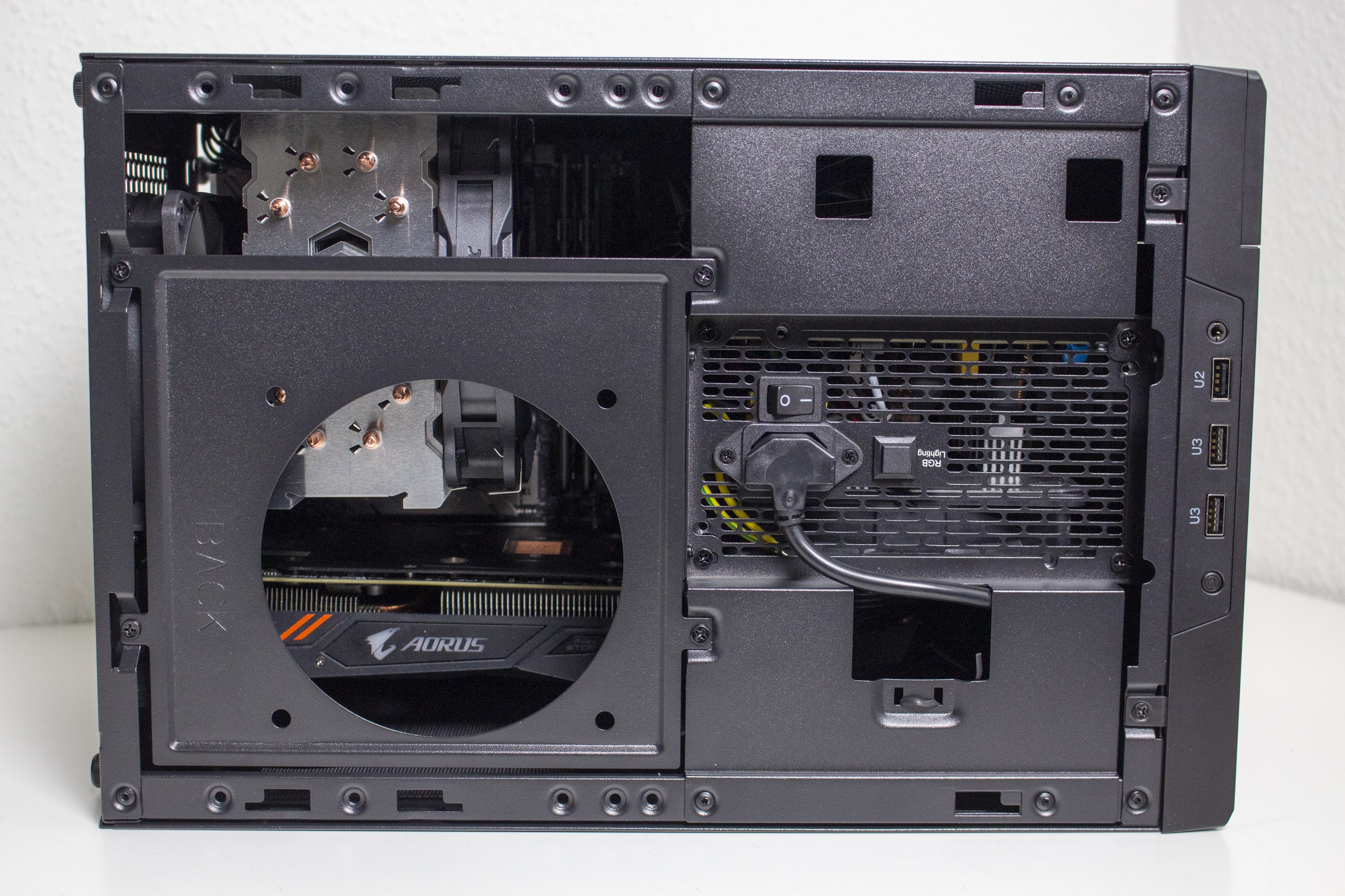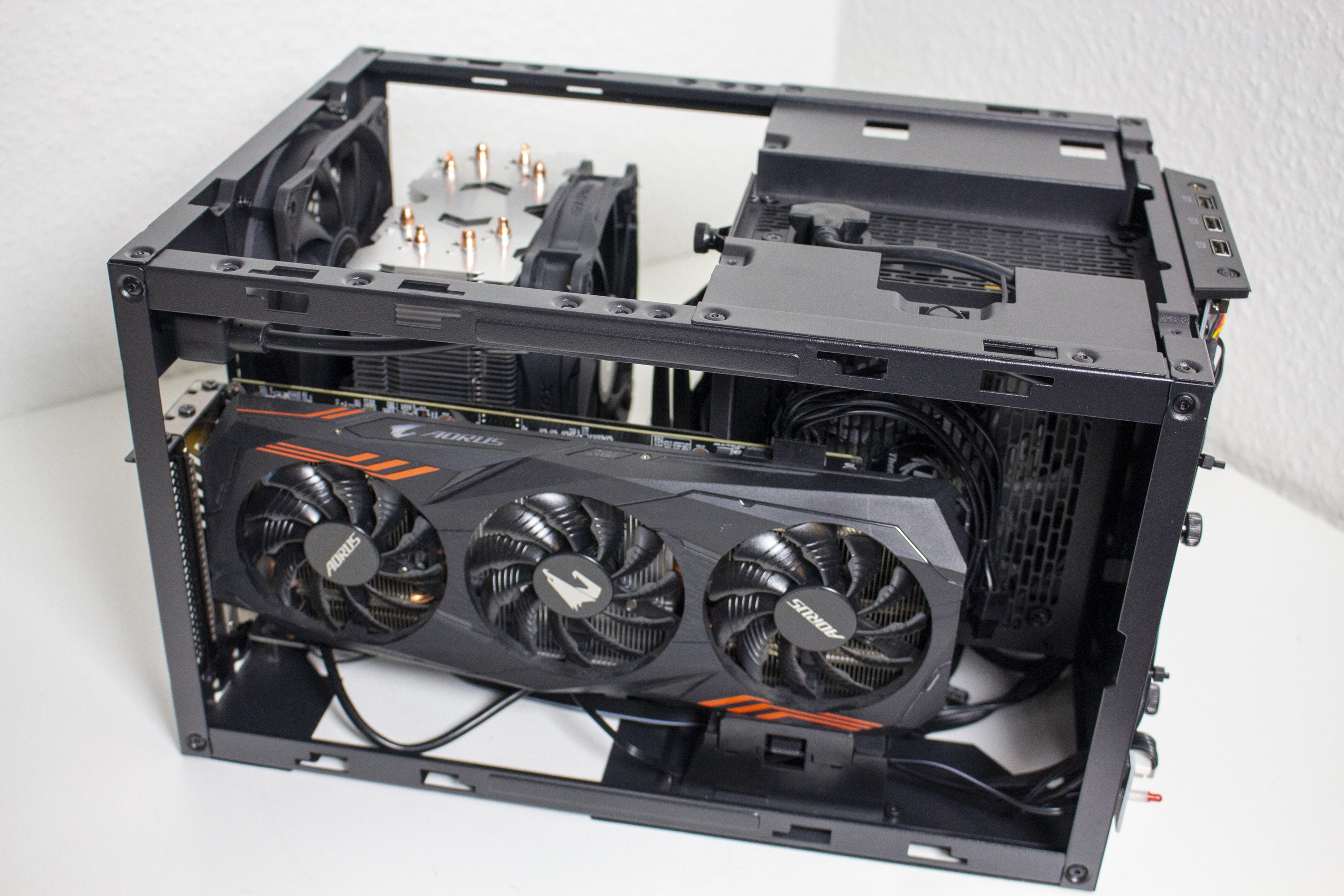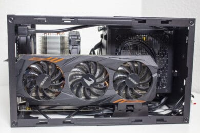 Nun kommen wir zum Systemeinbau. Als Hardware verwenden wir einen AMD Ryzen 5 1400 auf einem Gigabyte B450 I Aorus Pro WIFI mit Crucial Ballistix Sport LT grau 32 GB DDR4-3000. Der Ryzen wird von einem Enermax ETS-F40 Silent Edition* gekühlt und ist auf 3,8 GHz übertaktet. Für die Bildausgabe ist eine GTX 1060 6GB von Gigabte AORUS zuständig. Die Stromversorgung erledigt das nichtmodulare Berlin Pro RGB 650W mit RGB-Lüfter.