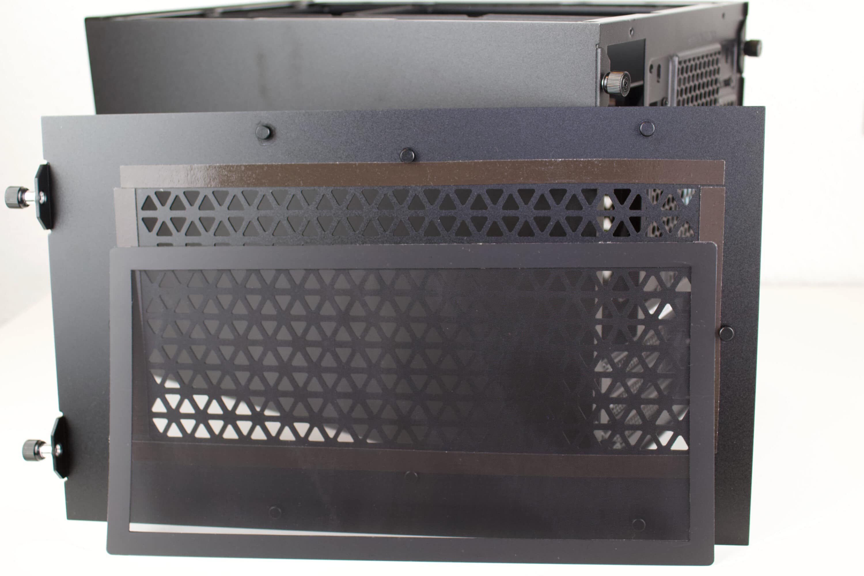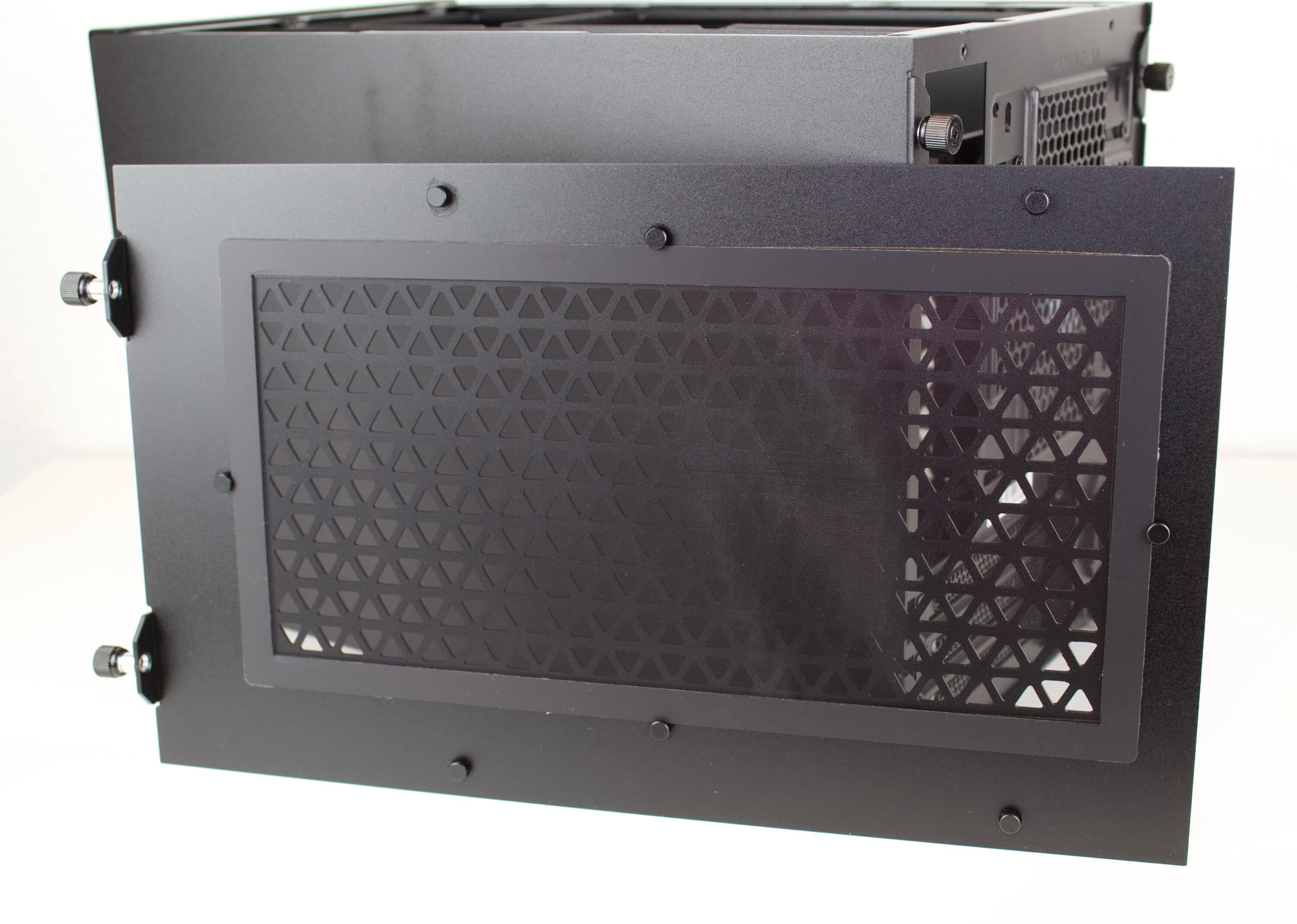 Jedes Seitenteil des Gehäuses ist durch zwei Schrauben entfernbar. Die linke Seite, Top und untere Seite verbergen dahinter ein magnetisch angebrachten Staubfilter aus Nylon. Dieser soll gegenüber den normalerweise genutzten Plastik-Filtern einen höheren Luftdurchlass bieten soll.
