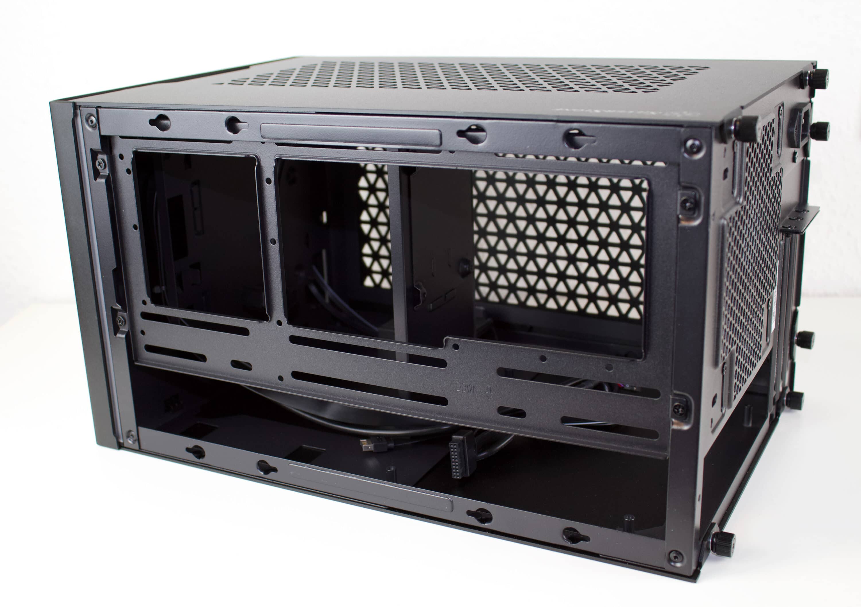 Wie bei ITX-Gehäusen üblich, geht es ansonsten recht knapp im Innenraum zu. Bei Montage eines Mainboards schließt dieses mit wenig Abstand zu den umliegenden Trennwänden ab. Die Montage eines hohen CPU-Kühlers und einer bis zu 330 mm langen GPU ist jedoch möglich. Hierfür ist sogar eine GPU-Stütze verbaut, um die auf den PCI-Slot wirkende Kraft zu verringern.