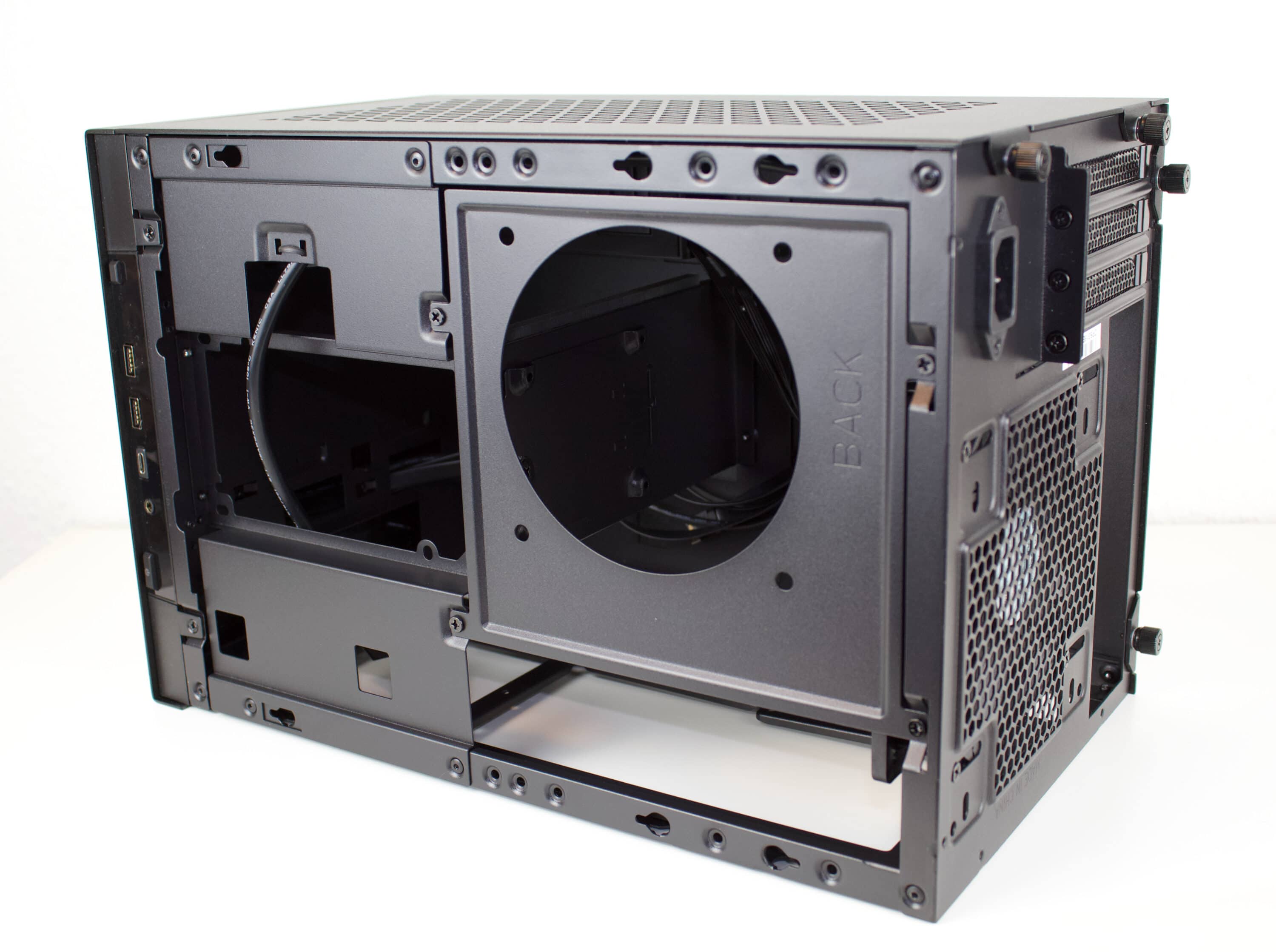 Abschließend noch ein Blick nach hinten. Dem Sugo 15 stehen drei horizontale PCI-Slots zur Verfügung. Eine vertikale Befestigung ist aufgrund des Innenaufbaus nicht möglich. Da sich das Netzteil im Inneren des Gehäuses befindet, wird mit einer Verlängerung gearbeitet.