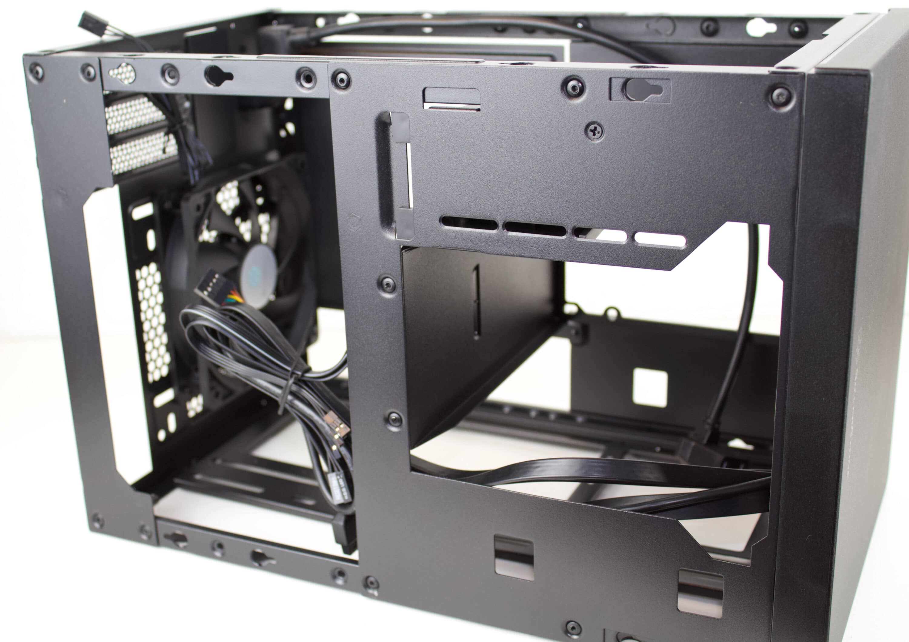 Der Innenraum des Sugo 15 wirkt auf dem ersten Blick aufgeräumt und geordnet. Es teilt sich in ein Bereich für das Mainboard und eines für das Netzteil auf. Letzteres soll in den davor vorgesehenen Einschub befestigt werden. Bei Bedarf kann ein 240-mm-Radiator an der Oberseite und ein 120-mm-Radiator am Heck montiert werden. Sollen zwei Radiatoren befestigt werden, ist aufgrund des Platzangebots die Flexibilität bei den Lüftern und Kabelführung etwas eingeschränkt. Zu erwähnen ist, dass die Oberseite entfernbar ist und so ein Radiator problemlos daran befestigt werden kann.