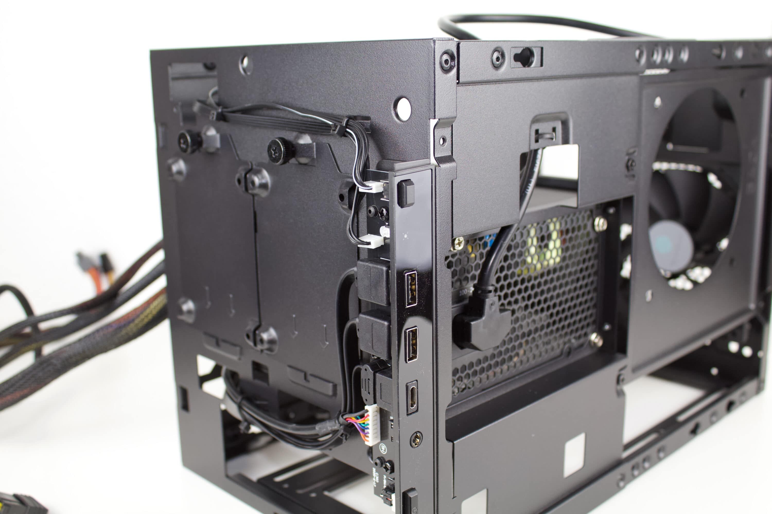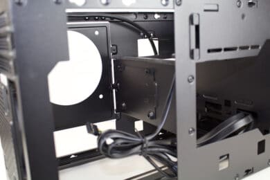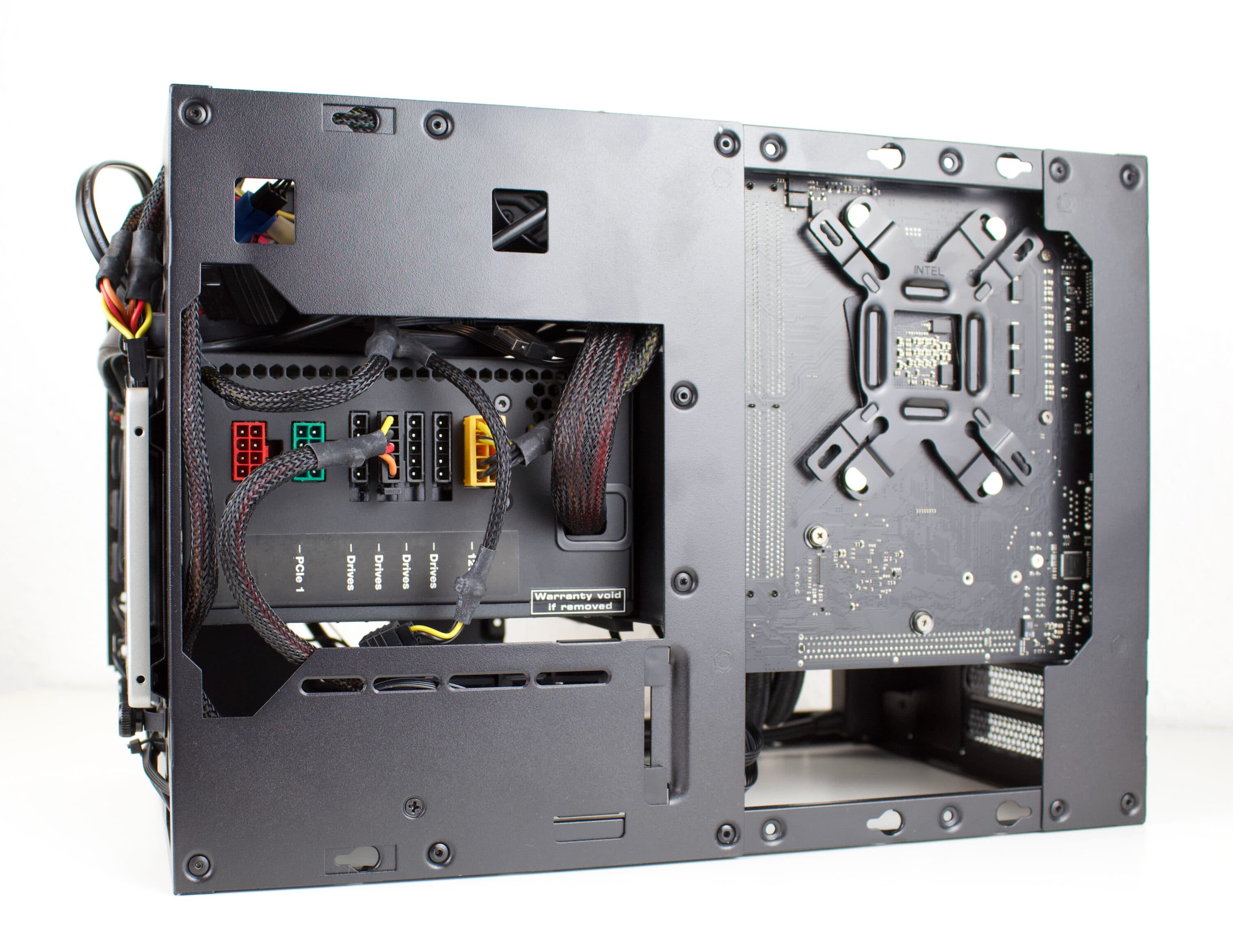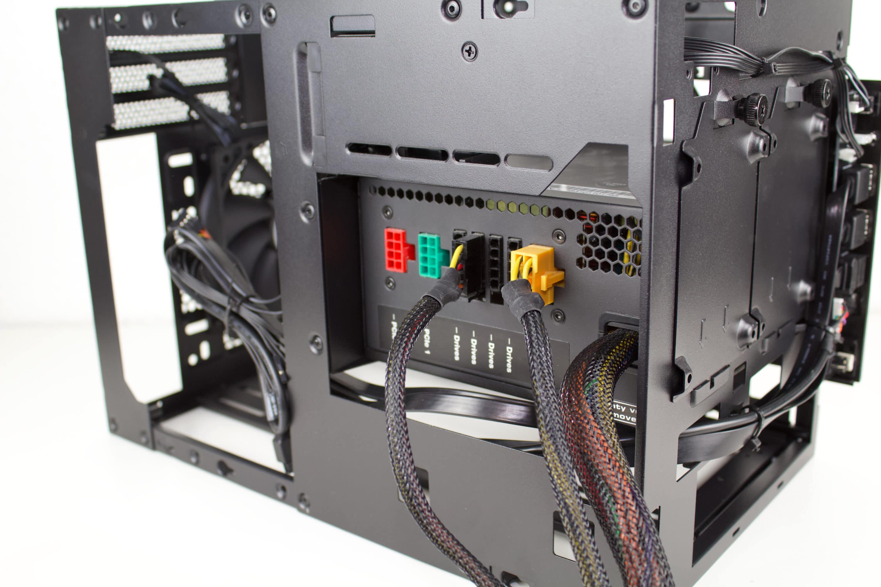Wie bei Gehäusen dieser Klasse üblich, sollte die Montage vorab kurz durchdacht werden. So kann Mehraufwand oder eine erschwerte Montage verhindert werden. In dem Fall bietet es sich an das Netzteil bereits zu befestigen und die notwendigen Kabel mit dem Mainboard zu verbinden. Überaschenderweise passt das 160 mm Tiefe Netzteil problemlos ins Gehäuse. Theoretisch könnten auch noch etwas größere Netzteile Platz finden.