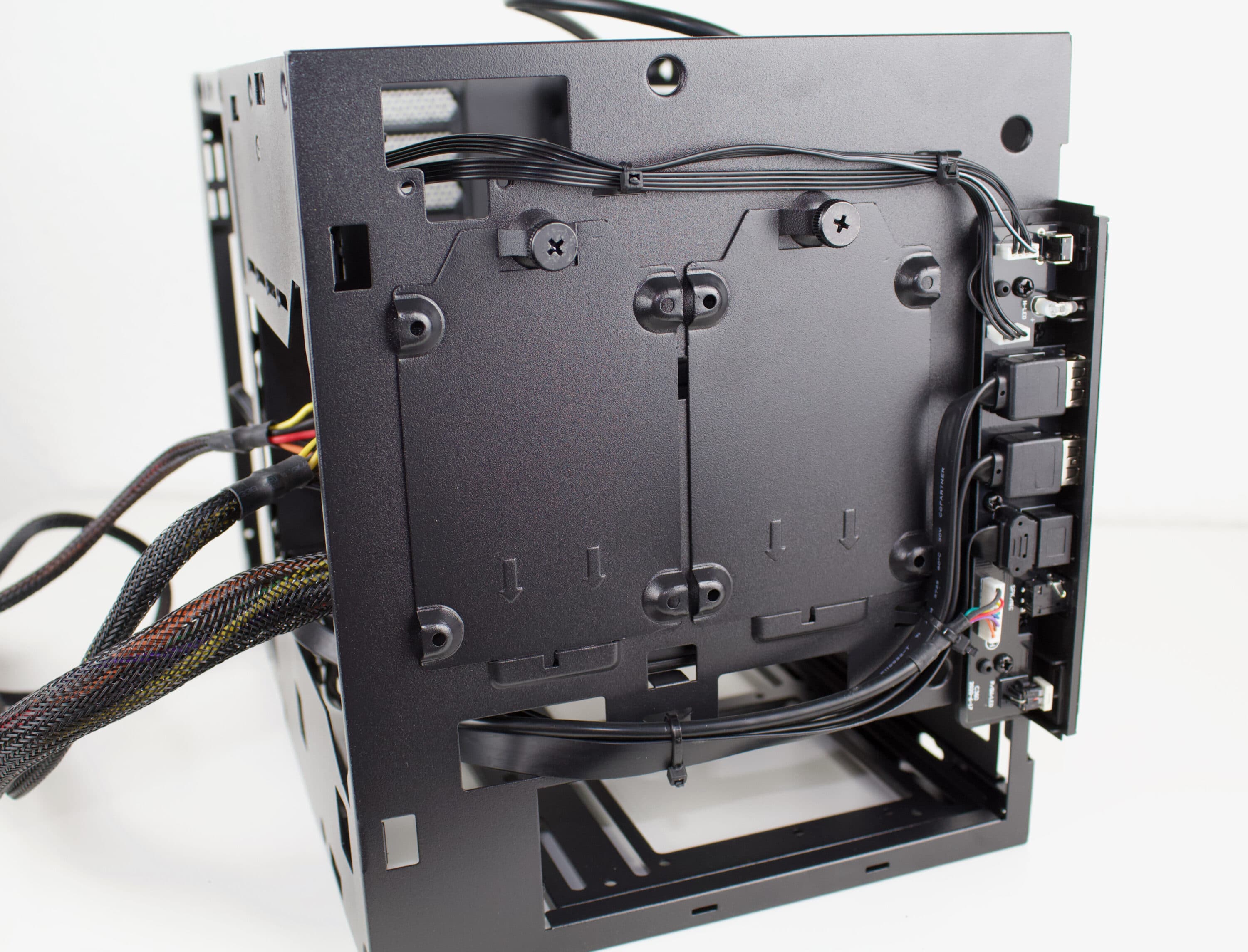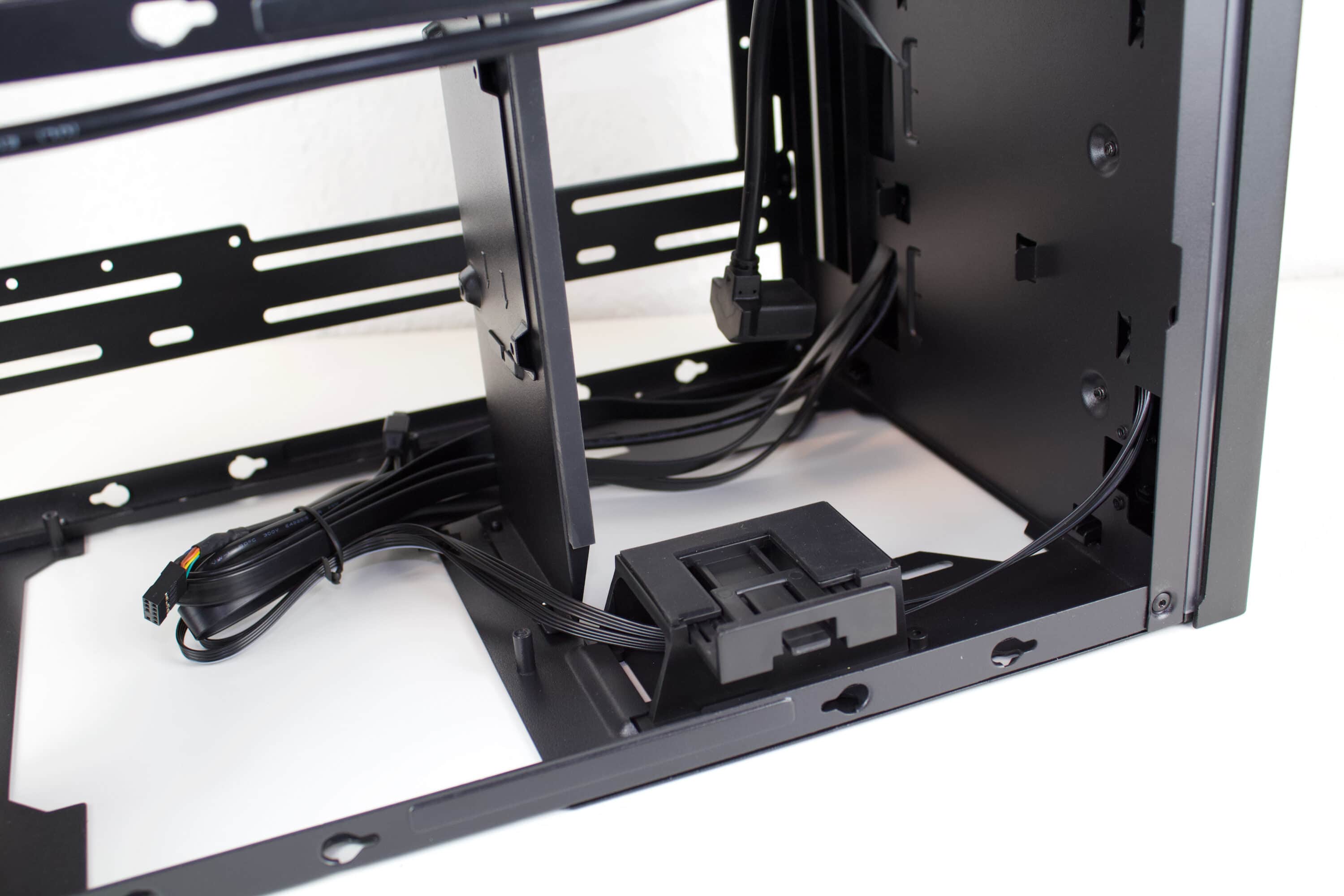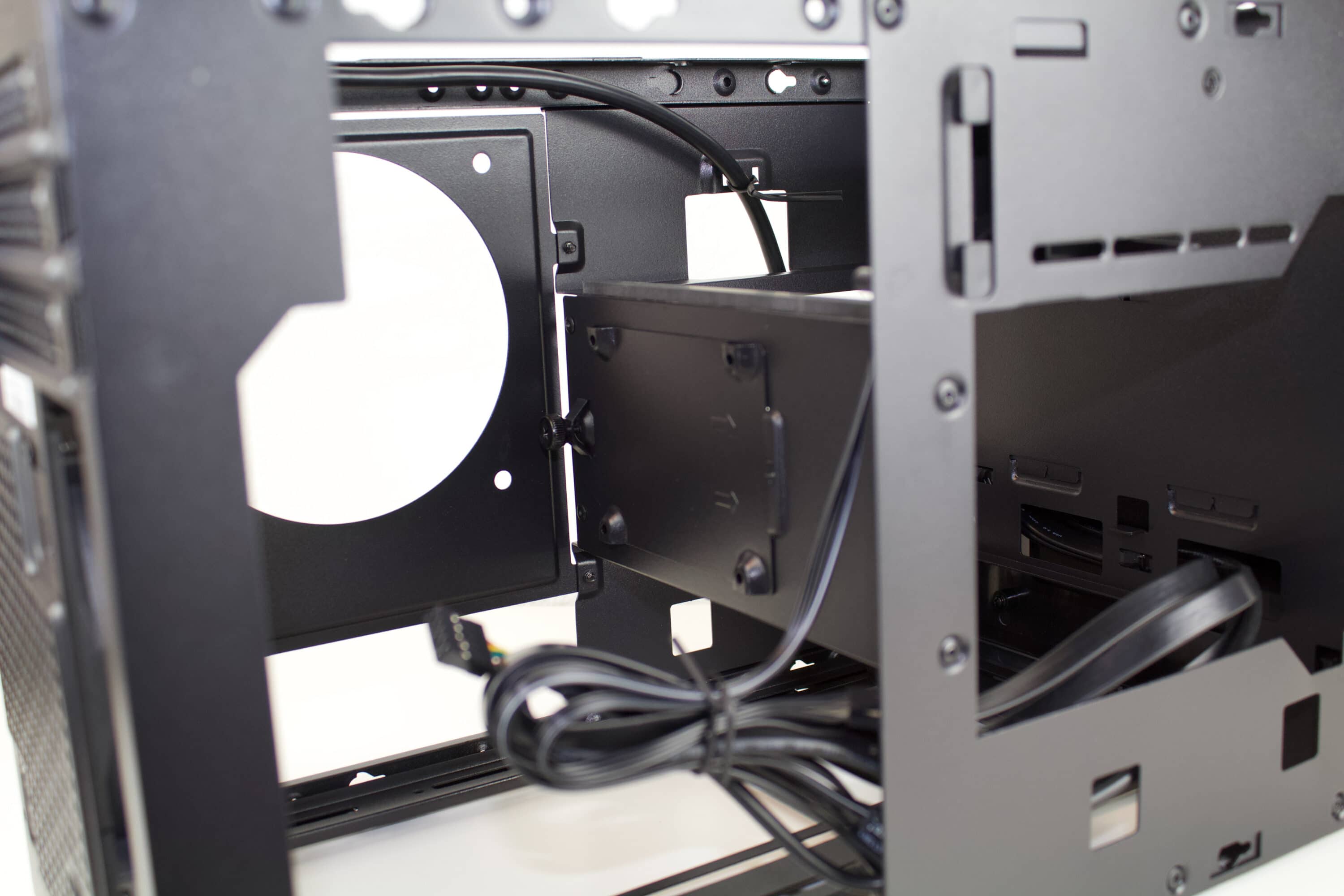 Nun werden bereits die zwei 2,5-Zoll-SSDs in der Front verbaut und verkabelt. Zudem wird der erste Teil der AiO am Mainboard befestigt.