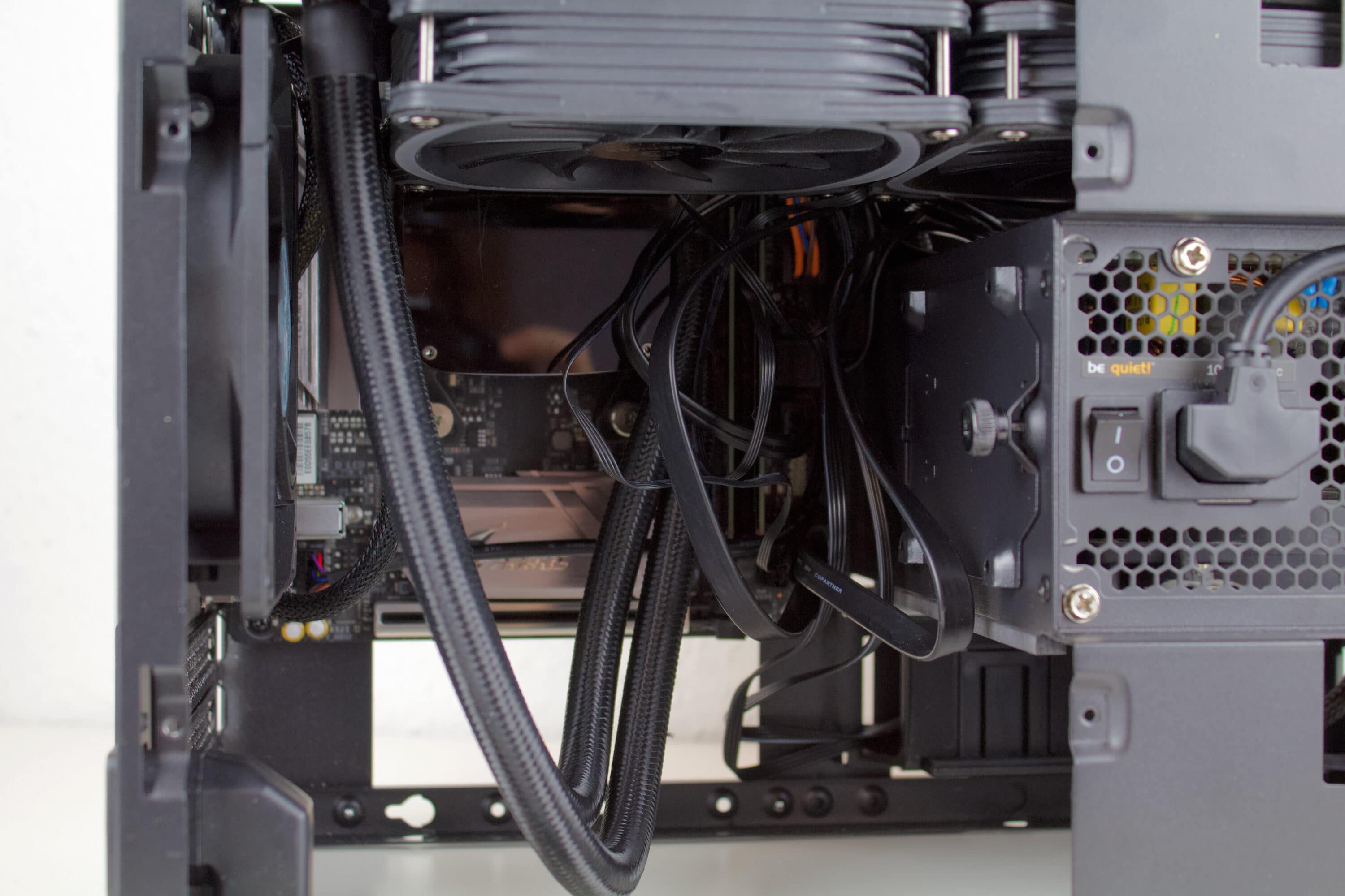 Bei niedriger Drehzahl sind die bereits montierten Lüfter aus wenigen Zentimetern Entfernung nicht mehr wahrzunehmen. Selbst bei dieser auf Silence getrimmten Konfiguration ist die Kühlung der verbauten Hardware durch die vormontierten Lüfter immer problemlos möglich.