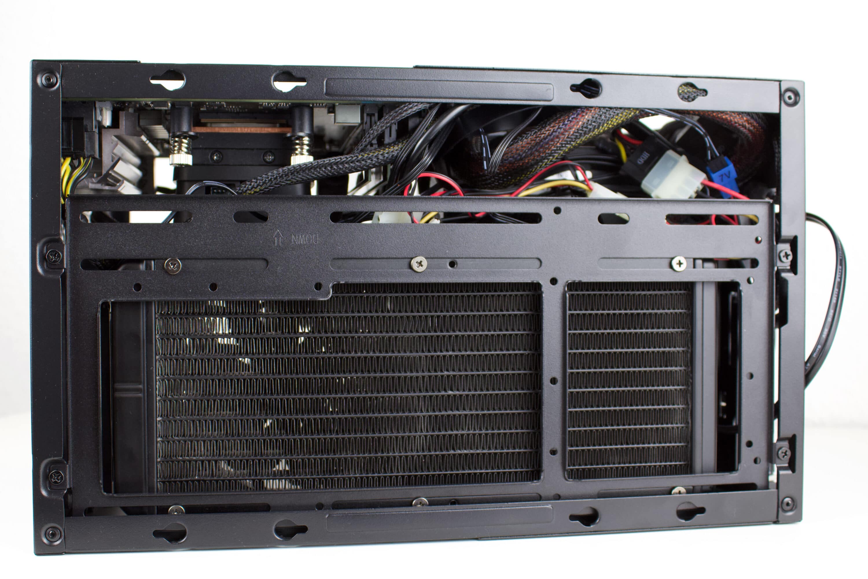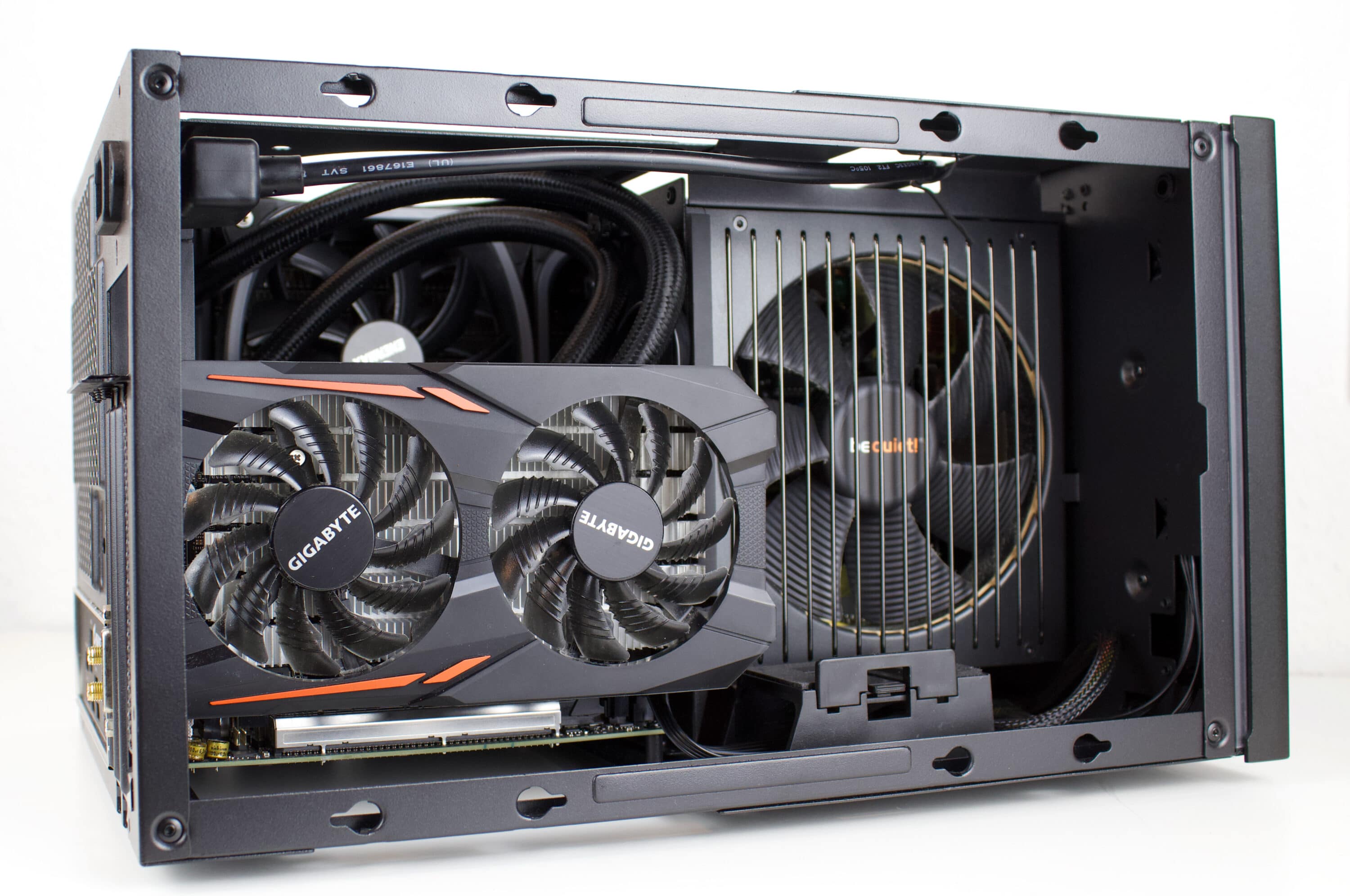 Abschließend erfolgt nur noch die Montage der GPU. In unserem Fall wird nur eine knapp 20 cm lange 1050 ti verbaut. Dadurch bleibt das Netzteil unbedeckt. In unserem Fall haben für eine optimalere Belüftung den mitgelieferten 120-mm-Lüfter noch umgedreht. Damit soll der Radiator kühlere Luft zugeführt werden. Für diesen Use-Case wäre noch ein zusätzlicher Filter im Heck sinnvoll.