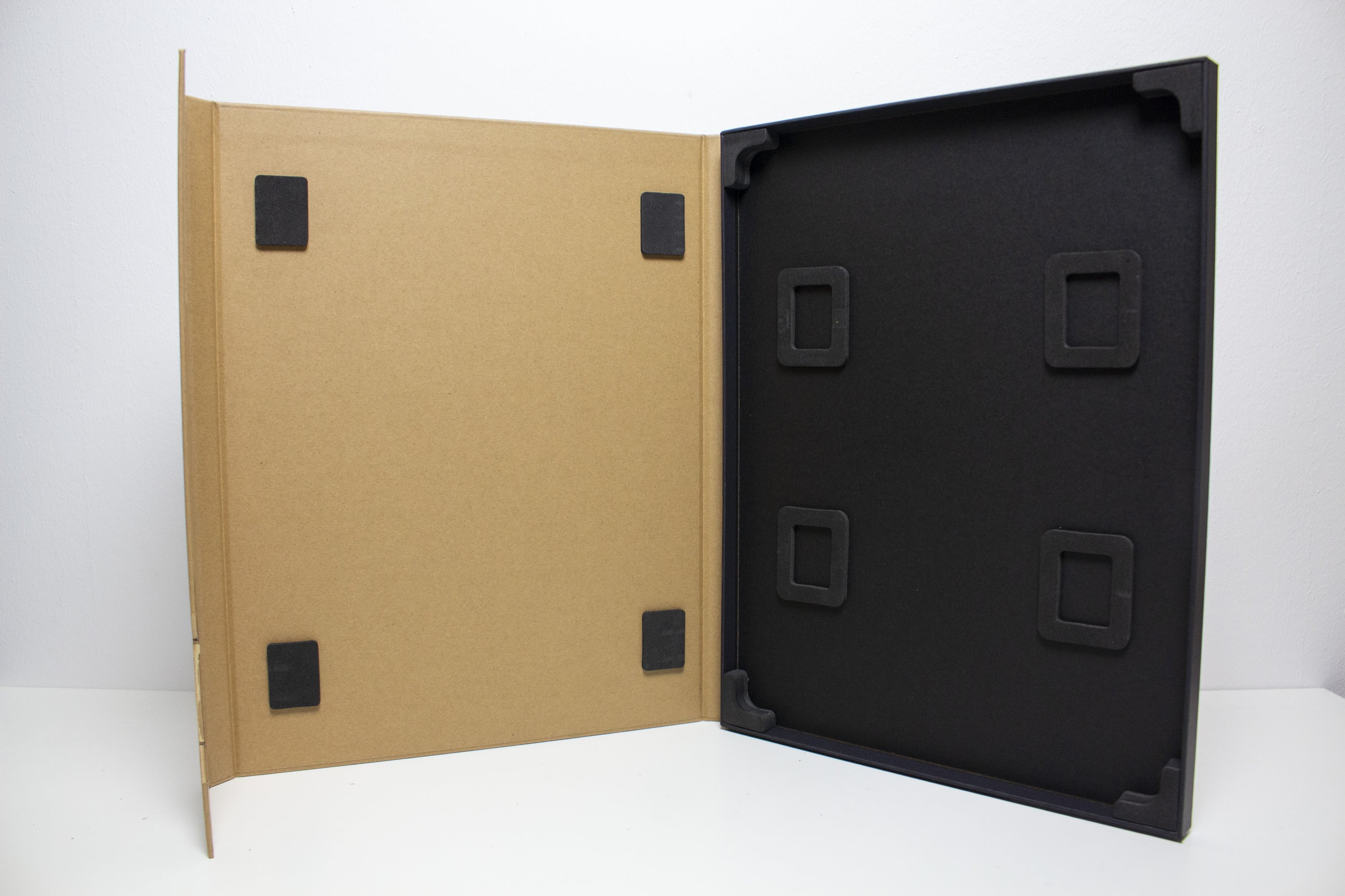 Das Streacom BC1 V2 kommt in einem flachen Karton aus hochwertiger Pappe. Der Karton ist braun und wurde nicht bedruckt. Hersteller und Name des Benchtables wurden auf einen separaten braunen Streifen gedruckt, welcher wiederum auf die Verpackung geklebt wurde und gleichzeitig als Siegel dient. Durchtrennt man das Siegel, dann kann man die Box aufklappen und es zeigt sich das BC1 V2, welches durch zusätzliche Elemente aus Schaumstoff geschützt wird. Da die Verpackung über Magnete verfügt, kann diese problemlos auch wieder verschlossen werden. Weiteres Zubehör ist nicht vorhanden und auf einen gedruckte Montageanleitung hat Streacom, zum Schutz der Umwelt, auch verzichtet. Diese lässt sich aber digital einsehen.