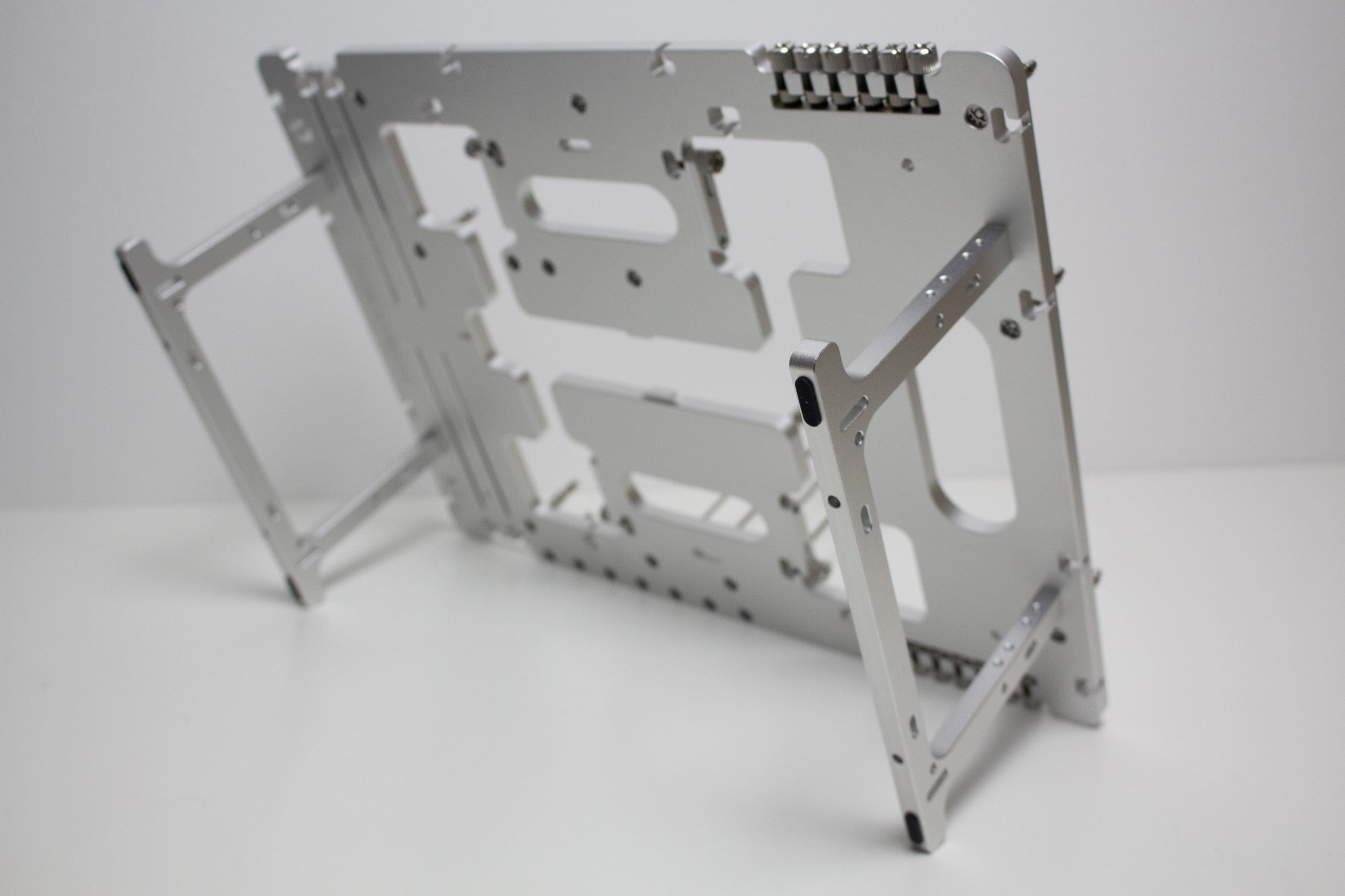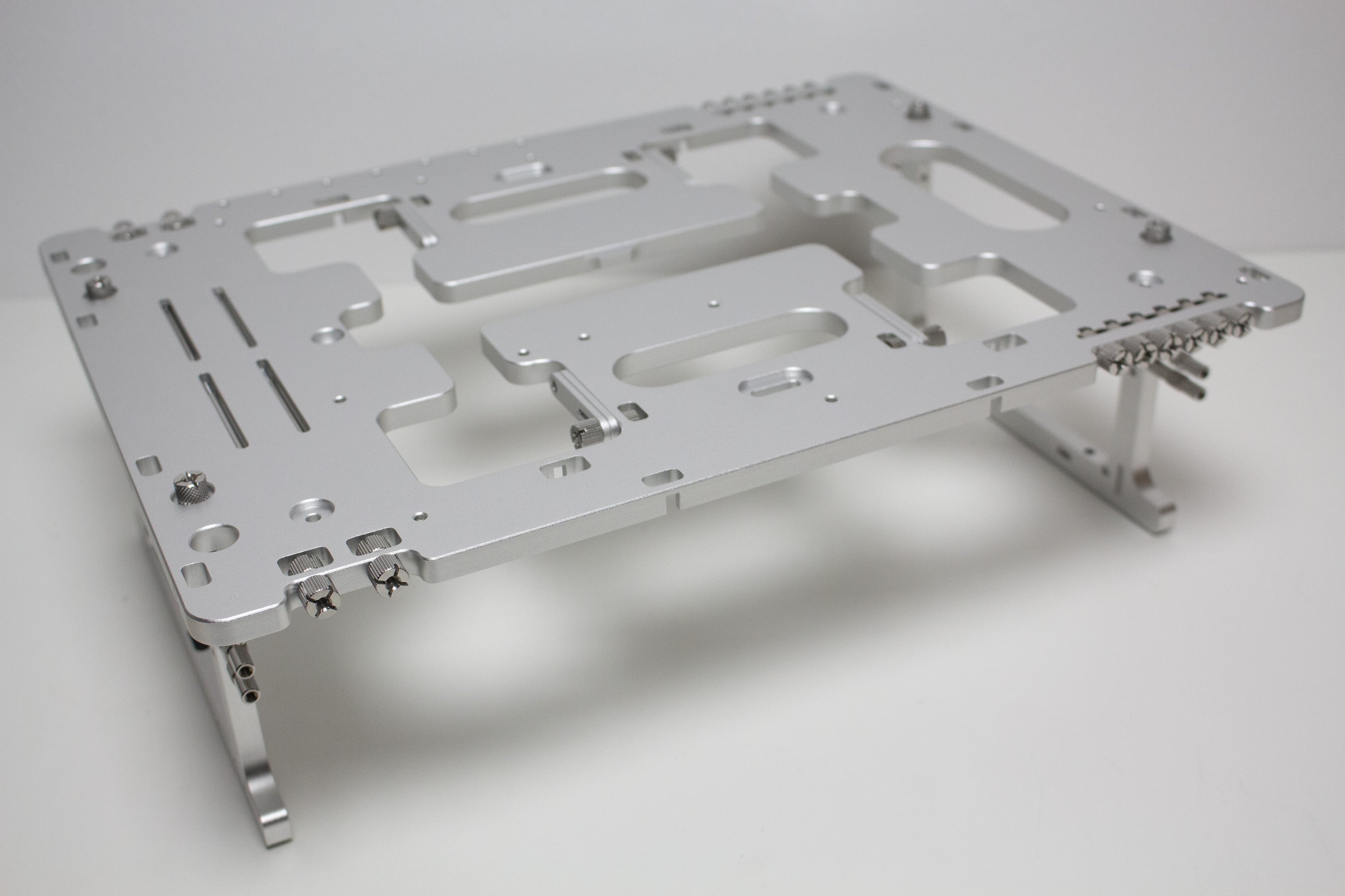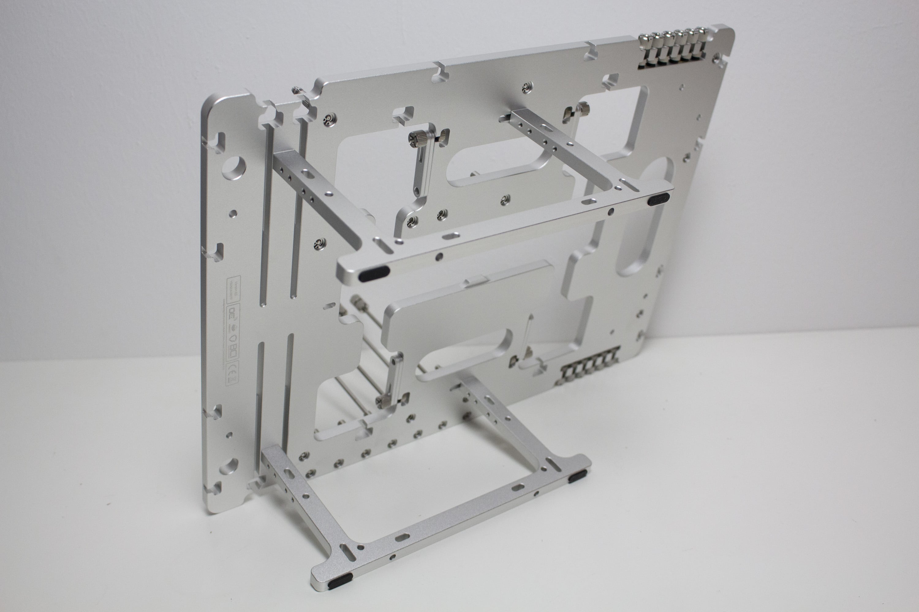 Wie der Vorgänger, ist auch der Streacom BC1 V2 demontiert sehr flach und eignet sich perfekt für den Transport. Die Basisplatte besteht vollständig aus Aluminium und wiegt mit allen Zubehörteilen unter zwei Kilogramm. Die Verarbeitung aller Bauteile ist sehr hochwertig und scharfe Kanten sucht man vergebens. Das der Benchtable dafür gebaut wurde um möglichst transportabel zu sein, lässt sich zudem auch daran erkennen, dass die Basisplatte mit einer Griffmulde ausgestattet wurde.