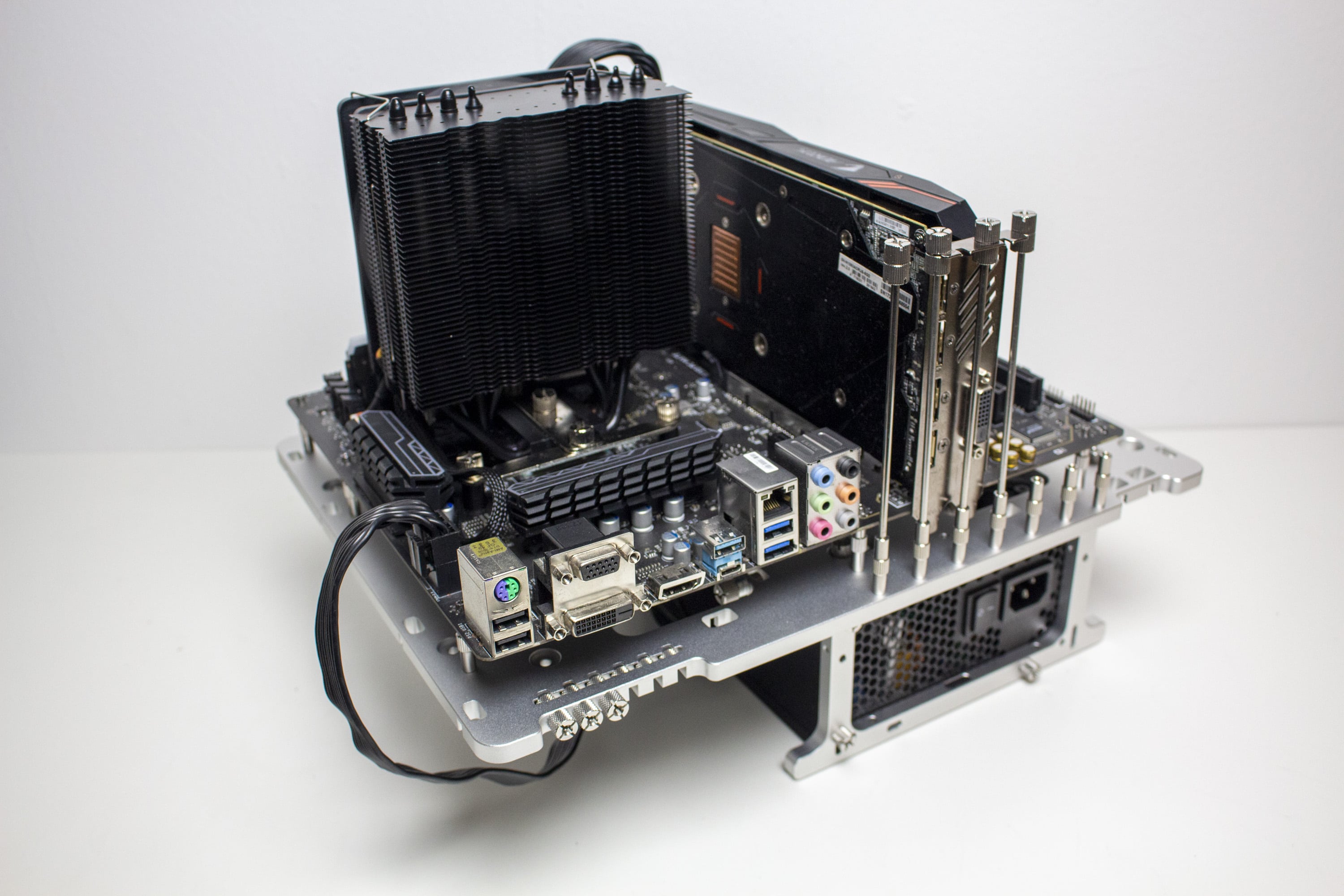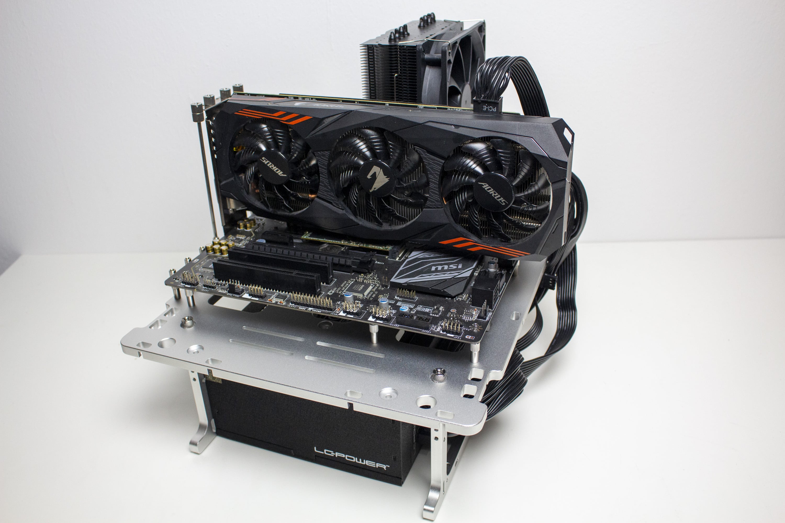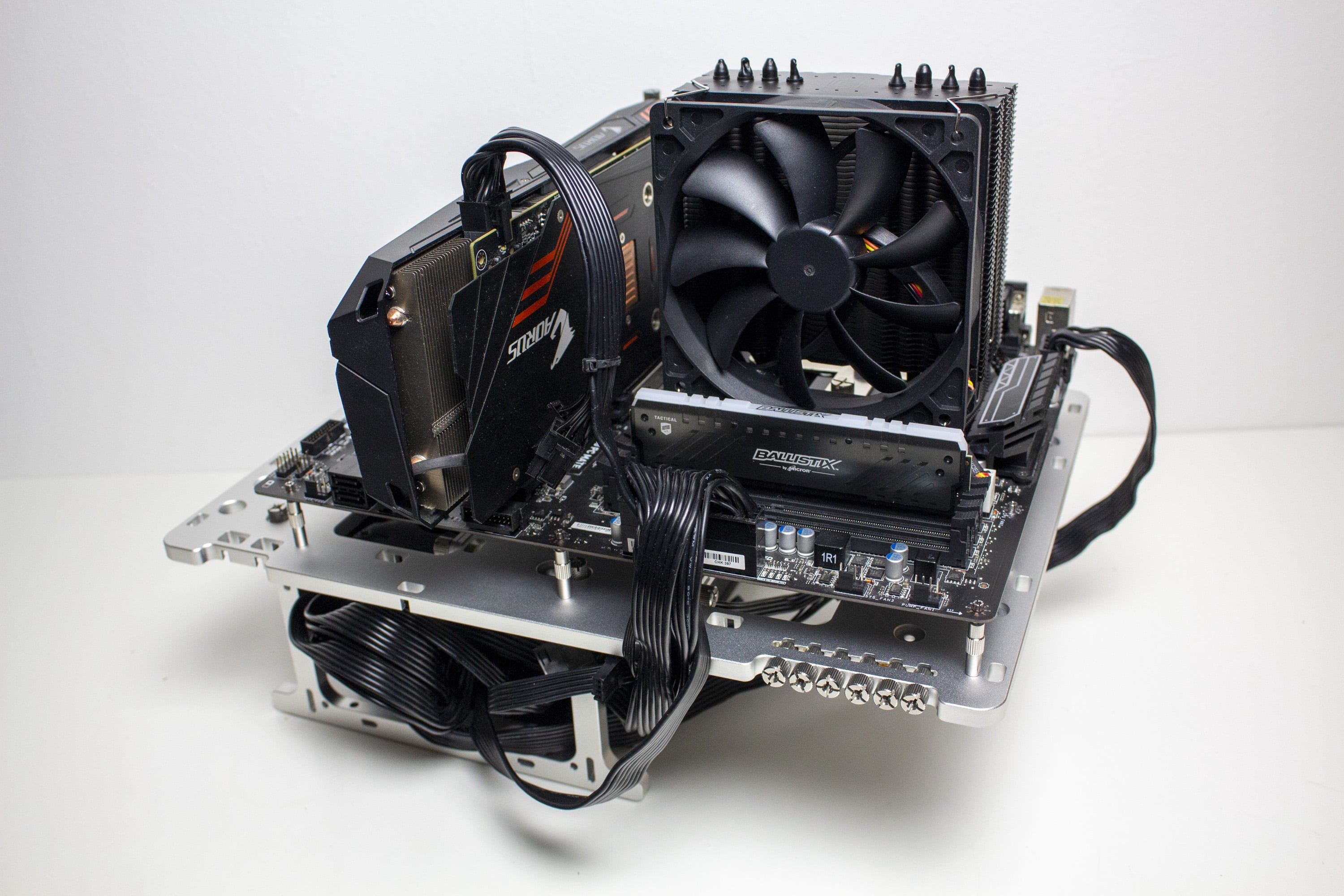 Nun kommen wir zum Aufbau des Testsystems mit dem Streacom BC1 V2 Test. Als Hardware verwenden wir einen AMD Ryzen 5 1400 auf einem MSI B350 PC Mate mit 16GB Crucial Ballistix Sport LT grau DDR4-2666. Der Ryzen wird von einem LC-Power Cosmo Cool LC-CC-120-RGB gekühlt und ist auf 3,8 GHz (1,25 V) übertaktet. Für die Bildausgabe ist eine GTX 1060 6GB von Gigabyte AORUS zuständig. Die Stromversorgung erledigt das vollmodulare LC-Power LC550 V2.31 Platinum mit einem Effizienzgrad von 80 Plus Platinum.