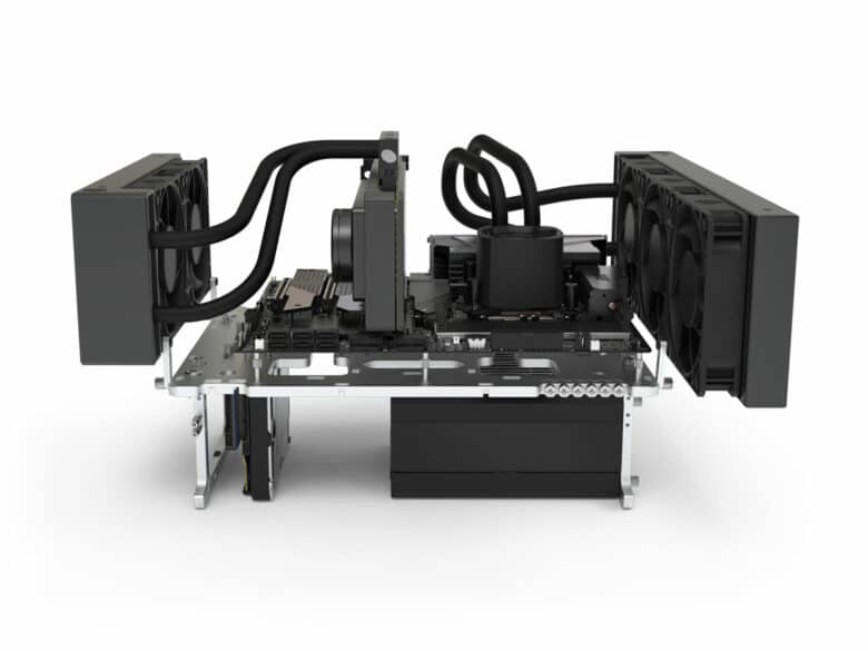 In Bezug auf eine Wasserkühlung bzw. entsprechende Hardware verfügt das BC1 V2 über spezielle Montagebügel, die eine Montage eines 360-mm-Radiators auf der rechten und eines 280-mm-Radiators auf der linken Seite erlauben. Diese dürfen jeweils ein Gewicht von sieben Kilogramm nicht überschreiten.