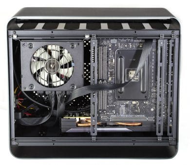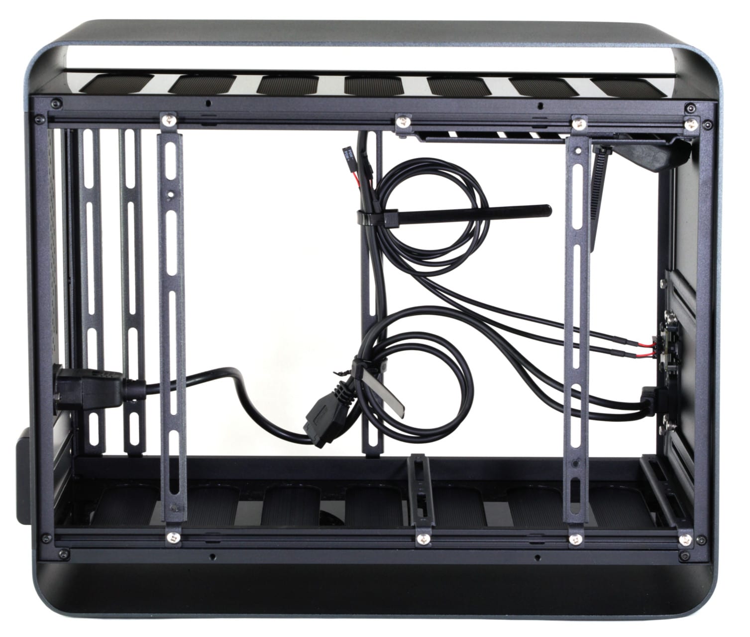 Optional kann man im DA2 auch einen Hecklüfter installieren und zahlreiche weitere Komponenten – darunter auch weitere Lüfter – auf frei justierbaren Schienen montieren. Im Gegensatz zu einigen anderen Vertretern von derart kompakten Gehäusen ist der Aufbau des DA2 innen recht klassisch: Auf eine Riser-Card wird verzichtet, lediglich das Netzteil wird über ein Verlängerungskabel angeschlossen und, zusammen mit den Laufwerken, hinter der Front montiert.