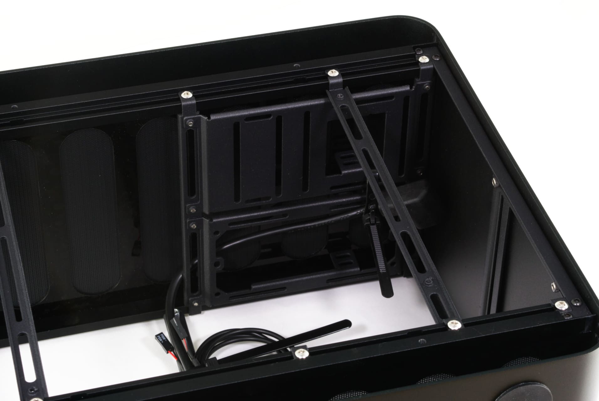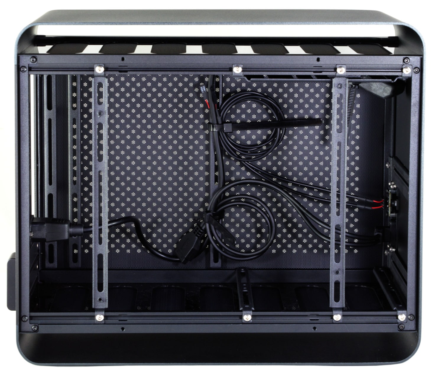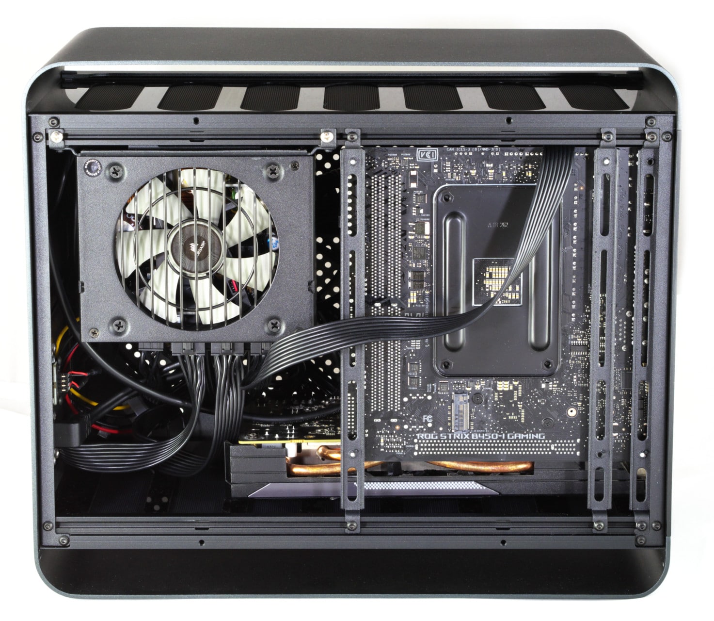 Während das Mainboard und damit auch die Grafikkarte an einer fixen Position befestigt werden, erfolgt die Installation des Netzteils sowie der Laufwerke an einer Blende, die auf den besagten Schienen befestigt wird. Die Blende kann herausgenommen werden, anschließend installiert man das Netzteil und, falls gewünscht, mehrere Laufwerke über eine einseitige, seitliche Verschraubung. Setzt man ein ATX- statt einem SFX-Netzteil ein, wird dieses nicht parallel sondern senkrecht zum Mainboard installiert. In beiden Situationen kann das Netzteil auch gedreht montiert werden, im SFX-Fall verdecken installierte Laufwerke allerdings den Lufteinlass auf einer Seite.