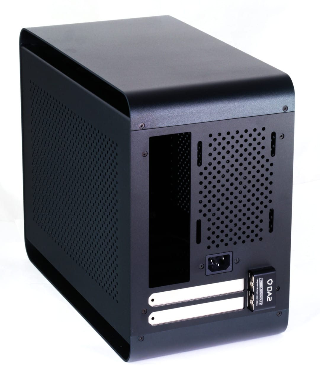 Die durchgehend schlichte Optik des Gehäuses – sieht man es von Vorne an, so lässt sich keine einziger Schraube/Niete erkennen – wird fast über die gesamte Außenhaut durchgesetzt. Alle Befestigungen befinden sich am Heck, an dem sich zugleich auch die Anschlüsse für alle internen Komponenten befinden. Auffällig sind die PCI-E-Blenden, die leider silbern und nicht, wie der Rest des Gehäuses, schwarz sind. Andererseits dürften diese ohnehin nicht verwendet werden; schließlich ist das DA2 für den Einsatz einer Grafikkarte konzipiert.