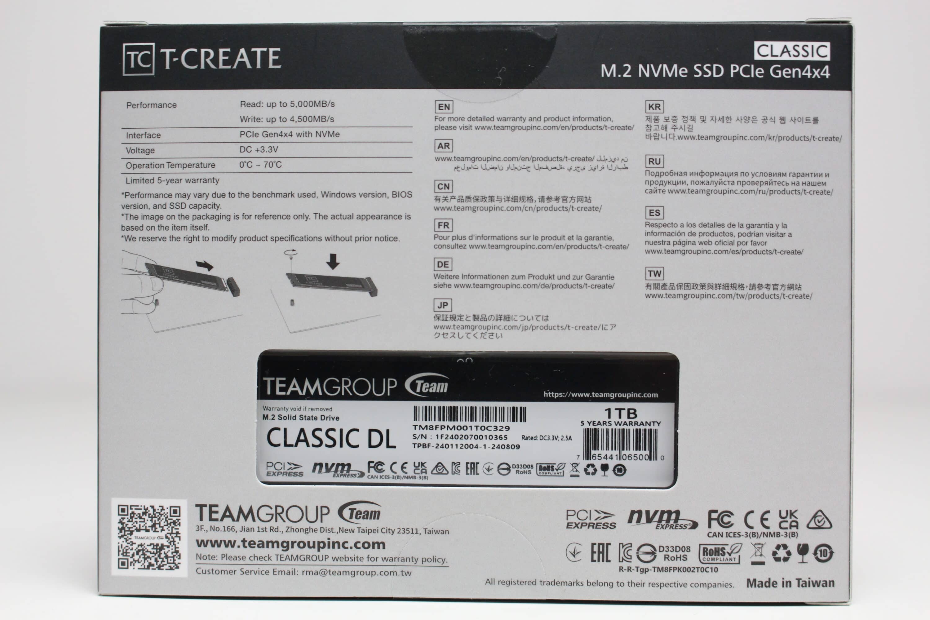 Der Hersteller bewirbt die T-Create Classic DL 1 TB mit einer Lesegeschwindigkeit von bis zu 5.000 MB/s und einer Schreibgeschwindigkeit von bis zu 4500 MB/s. Damit ist die T-Create Classic DL im Mainstream-Bereich zu Hause und reizt den PCIe-4.0-Standard nicht gänzlich aus. Zudem wird auf den Einsatz eines DRAM-Cache verzichtet. Durch die Beilage eines patentierten Graphen-Heatspreaders und der Gewährung einer 5-jährigen Herstellergarantie soll dennoch eine gute Haltbarkeit und Stabilität suggeriert werden.