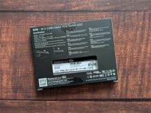 Die Platine der SSD ist schwarz und einseitig mit Chips bestückt. Die unbestückte Rückseite ist von einem schwarz weißen Aufkleber bedeckt, auf dem das TeamGroup-Logo, die Modellbezeichnung, die Kapazität und weitere Informationen zu finden sind.