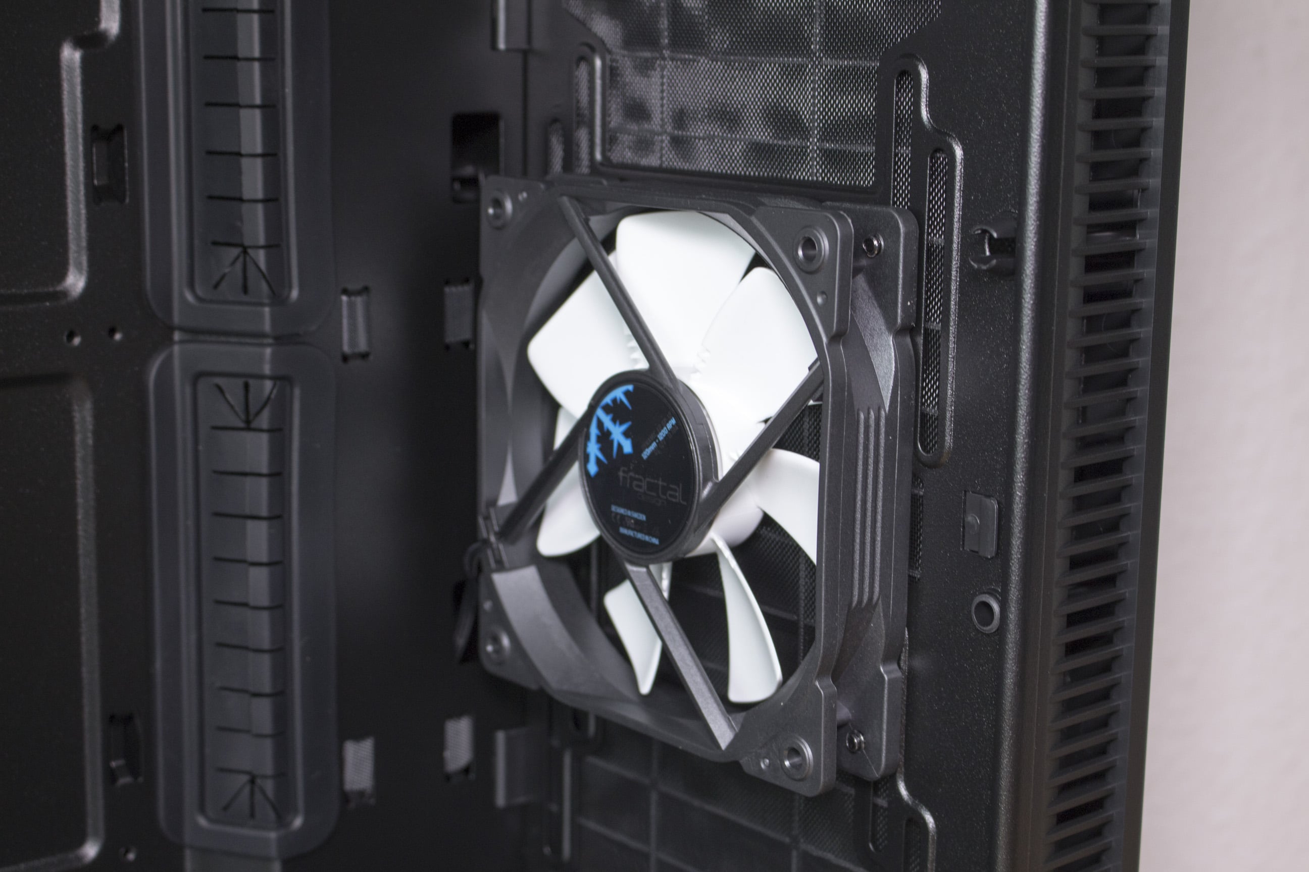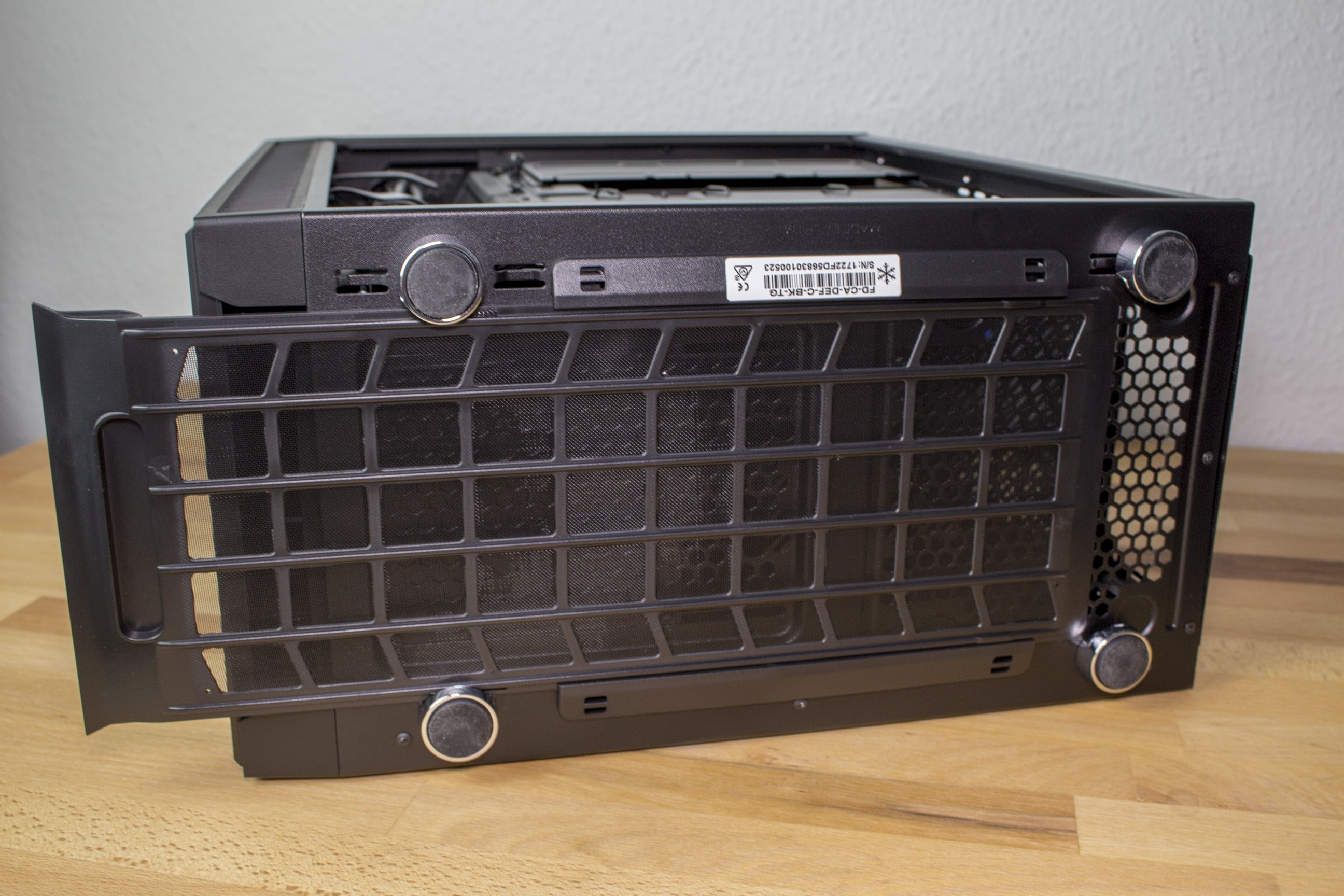 Optisch hat sich gegenüber seinen Vorgängermodellen keine Änderung ergeben. Die Define typische schwarze, gebürstete Plastik-Front ist erhalten geblieben. Prägend für das minimalistische Design ist eine durchgehende Front. Praktisch ist der sich nach vorn herausziehbare Bodenstaubfilter. Die Frontpartie ist abnehmbar. Dahinter verbergen sich die Lüfterplätze sowie ein abnehmbarer Staubfilter.